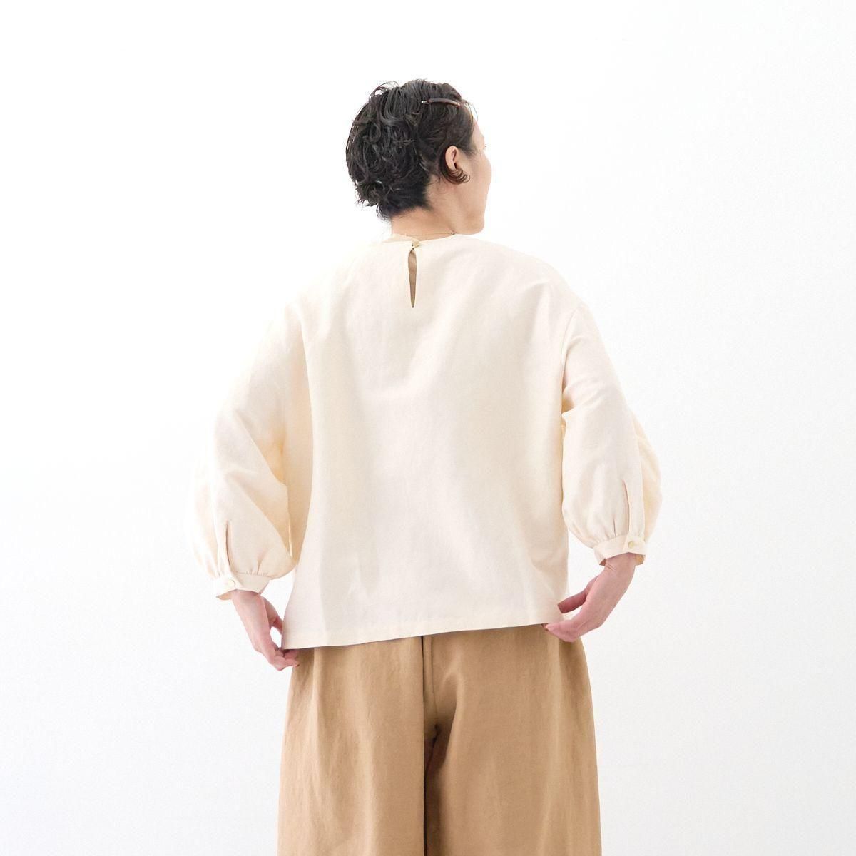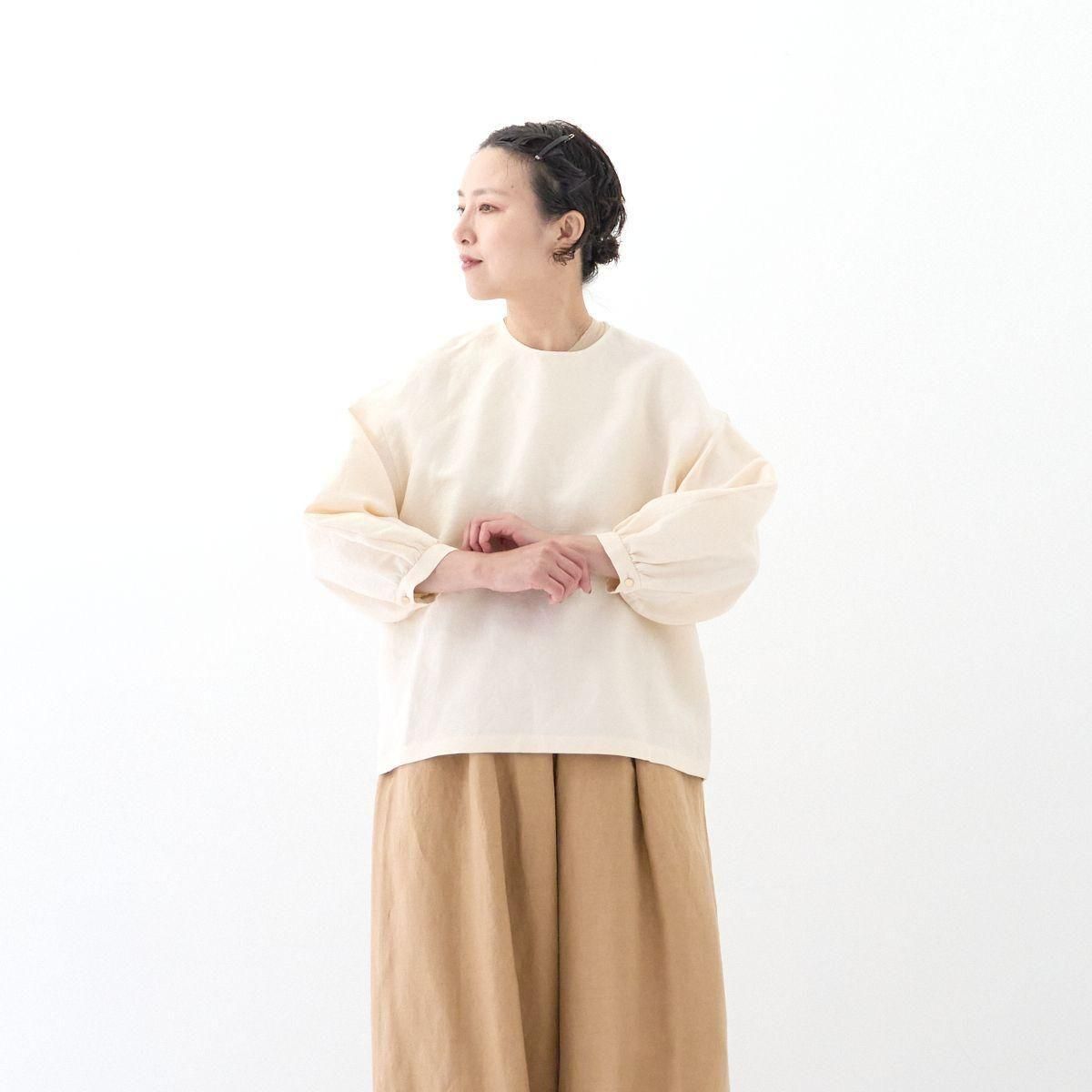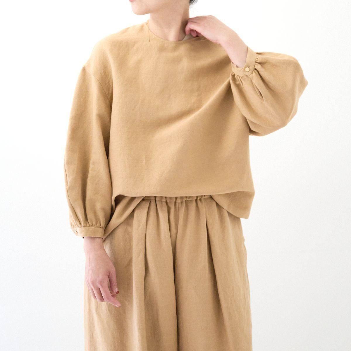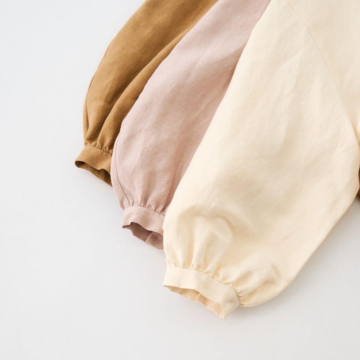 humoresque(ユーモレスク)は、デザイナー 渡辺由夏さんの「ちょうど良い糸を、ちょうど良い形で編んでみたい。」との想いから2012年の秋冬シーズンにニットを中心とした衣服ブランドをスタートし、シルクなど布帛アイテムの展開にも力を入れています。 humoresqueらしい上品さを併せ持ったパフスリーブのプルオーバー。 柔らかいリネンシルク生地で着用期間も長くお楽しみいただけ、こっくりとしたニュアンスのある柔らかいカラー展開です。 25AW size: F 着丈57.5cm 身幅58cm 裄丈68cm color:pink beige / ivory / camel material: リネン54% シルク46% パイピング キュプラ100% 手洗可 ※天然素材を使用しておりますため、織ムラやかすれ、フシやヨレによる不均一さ、 小さなほつれなどがある場合や、画像の色味や風合いと異なる場合もございます。 デリケートな素材もございますので、引っ掛けやひきつれにはご注意ください。 素材によって仕上がりに個体差が出ること、サイズ感、色、風合いについての特徴を、 天然素材ならではの良さとしてご理解の上、ご購入くださいますようお願いします。 シルクは直射日光により黄変しやすいため、陰干ししてください。 シルク糸が痩せてくるため、優しく手洗い、またはドライクリーニングをおすすめします。 model: 163cm(brick,shade着用) お取り扱い店舗・・・dieci芝川ビル店 size_chart