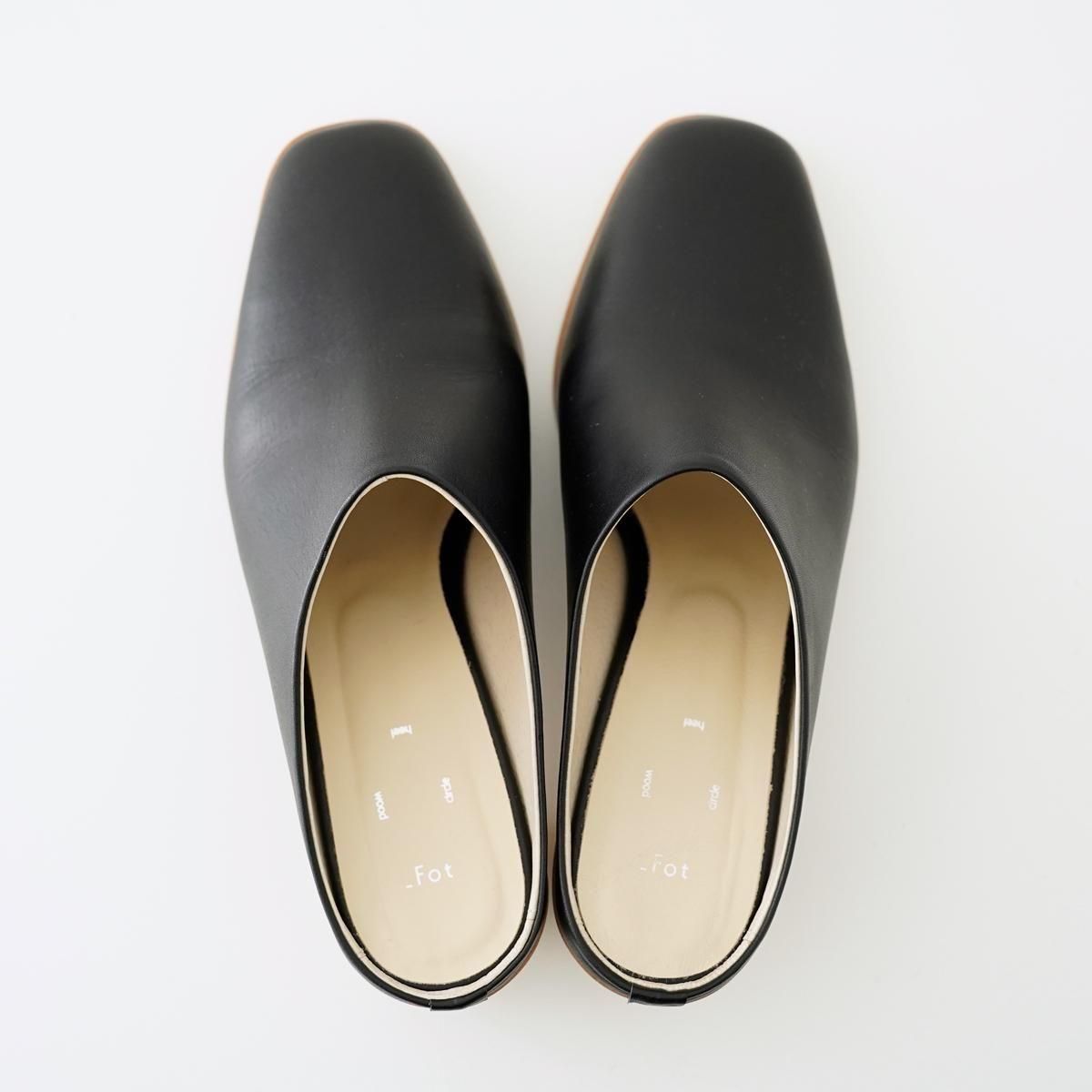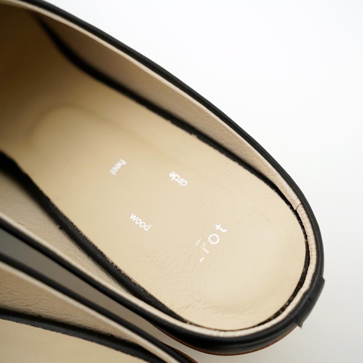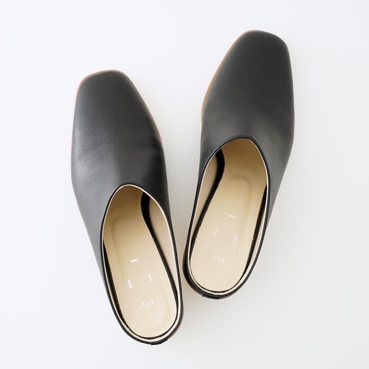 日本の職人技術を活かし、現代にも通用するデザインを生み出すブランド「_Fot」をご紹介します。 _Fot(フォート) ○△□をモチーフにした 上質なレザーシューズやバッグ、アクセサリーを展開 職人の手により一つ一つ仕上げられる高いクオリティと、曲線や温かみのある有機的かつ普遍性のあるデザインによるファッション性も兼ね揃えた作品を作り上げています。 _Fot のアイコン的なマテリアルのplywood(プライウッド)で制作したオリジナルモチーフをヒールに取り付けたミュールです。 plywoodは木を一枚ずつ積層させ、職人がひとつずつ作っています。 color: black size:36(23cm),37(23.5cm),38(24cm),39(24.5cm) material:Upper_cow leather, Lining_pig leather, Sole_leathersole,Woodheel_maple heel:40 mm ※革や木など天然素材を使用している製品が多くございます。本来の風合いを生かしたまま加工しておりますため、一点ごとに色味や風合いが異なります。そのため、多少の色ムラ、汚れ、キズ、毛の長さや濃淡の差、木目の個体差などが見られる場合がございます。また、水分や摩擦によってシミや色落ちなどの原因となる恐れがありますので、薄い色の衣類を着用の際はお気をつけください。 取扱い店舗…dieci芝川ビル店