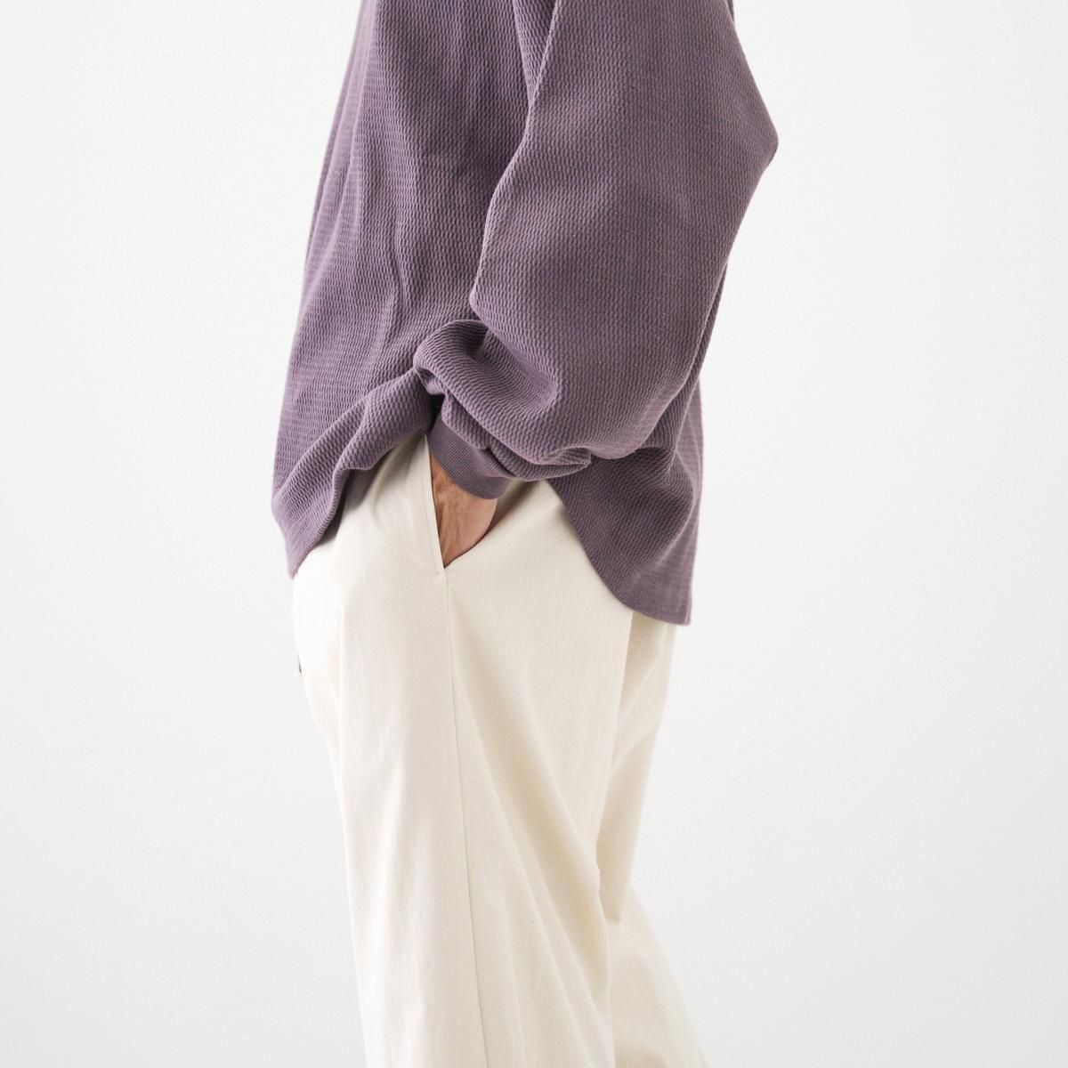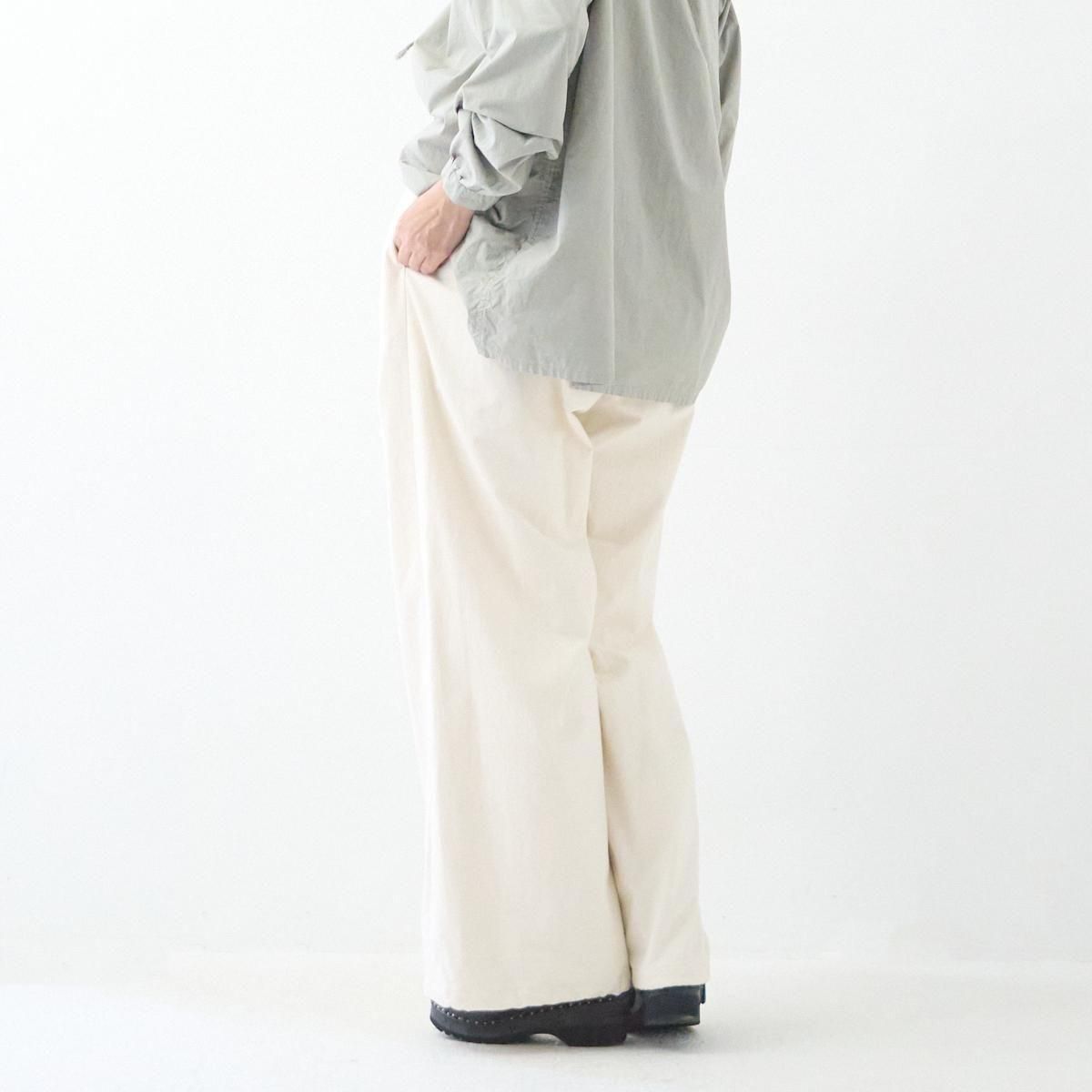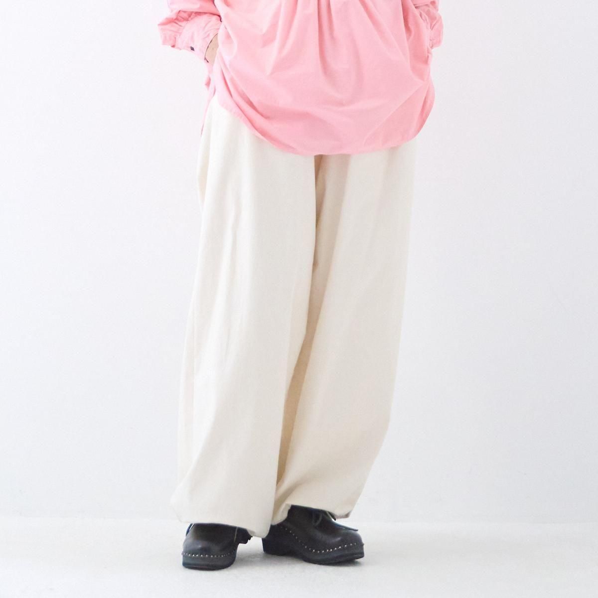 POLYPLOID定番のOVER PANTS A。 イギリス産のネップ感のあるナチュラルコットンを使用しています。 ドイツで生地の状態で水洗いをし、洗いざらしのシワをつけ、生地に動きをつけています。カジュアルにもモードにもスタイリングできるベーシックな1着。裾を絞って着用することも可能で、アクティブウェアのようなシルエットにパリッとした生地が掛け合わさったユニークなパンツです。 キャンバスのようなしっかりしたコットン地ですが、1枚仕立てですので冬場は是非ソックスやタイツなどと組み合わせてご着用ください。 日本製 25AW size : 1,2,3 1:ウエスト〜38cm 股上30cm 股下66.5cm わたり38.5cm 2:ウエスト〜41cm 股上31cm 股下68.5cm わたり40.5cm 3:ウエスト〜45cm 股上31.5cm 股下70.5cm わたり41.5cm color : OFF WHITE Material : COTTON 100% model:163cm(#2着用) 173cm(#3着用) 取り扱い店舗・・・dieci kyutaro店2F ------------------------------------------------------- ポリプロイド(POLYPLOID)は、2017年にドイツ・ベルリンにてイゾルデ・オーギュスト・リッチリー(Isolde Auguste Richly)により設立。2018-19年秋冬コレクションにてデビュー。ブランド名のポリプロイドは化学用語で、「多倍数体」を意味する。3種類の異なる素材と色で展開することで、プロダクトに奥行きや広がりをもたらす実験的アプローチを試みている。生産はドイツおよび日本で行っている。ヨーロッパのマテリアルはドイツで縫製され、日本のマテリアルは日本で作られる。