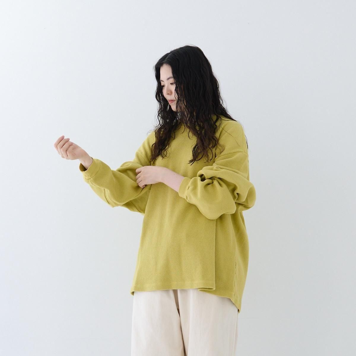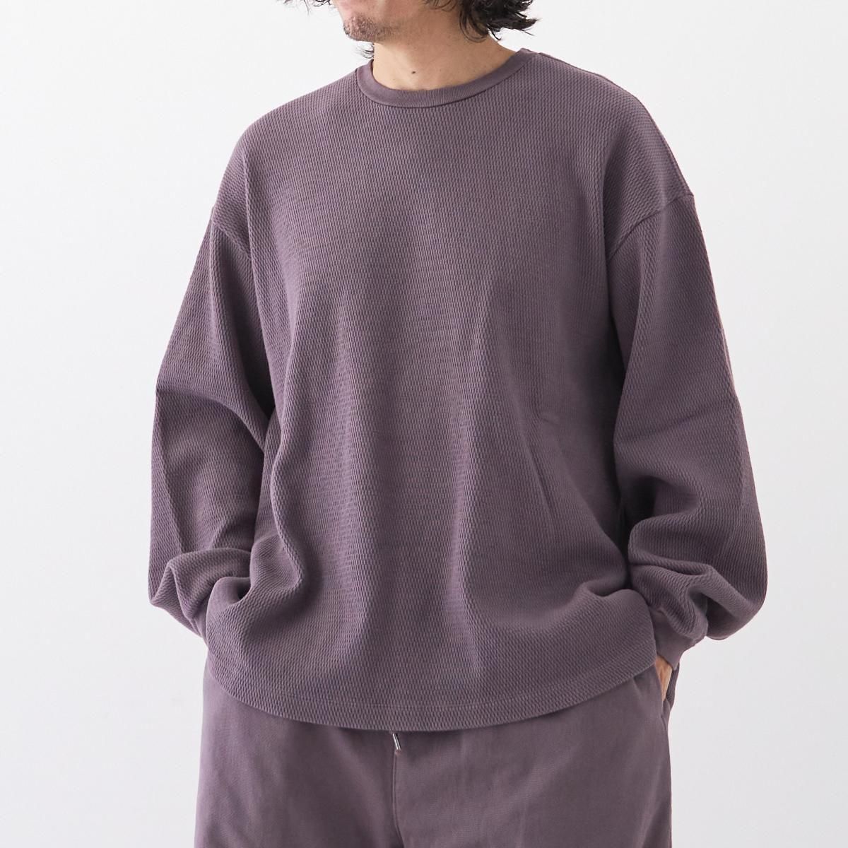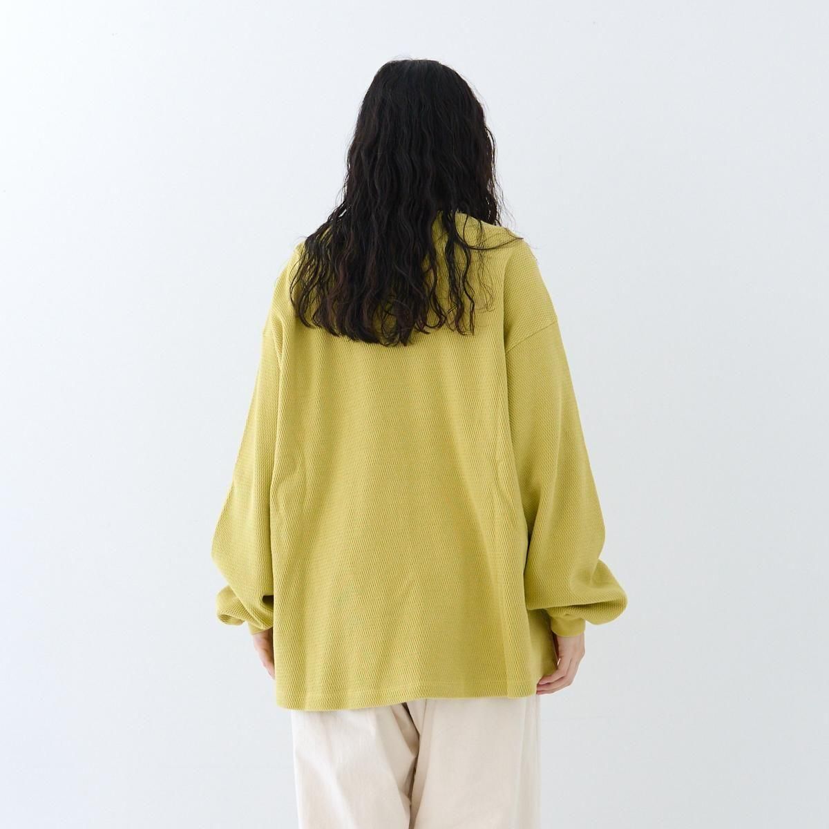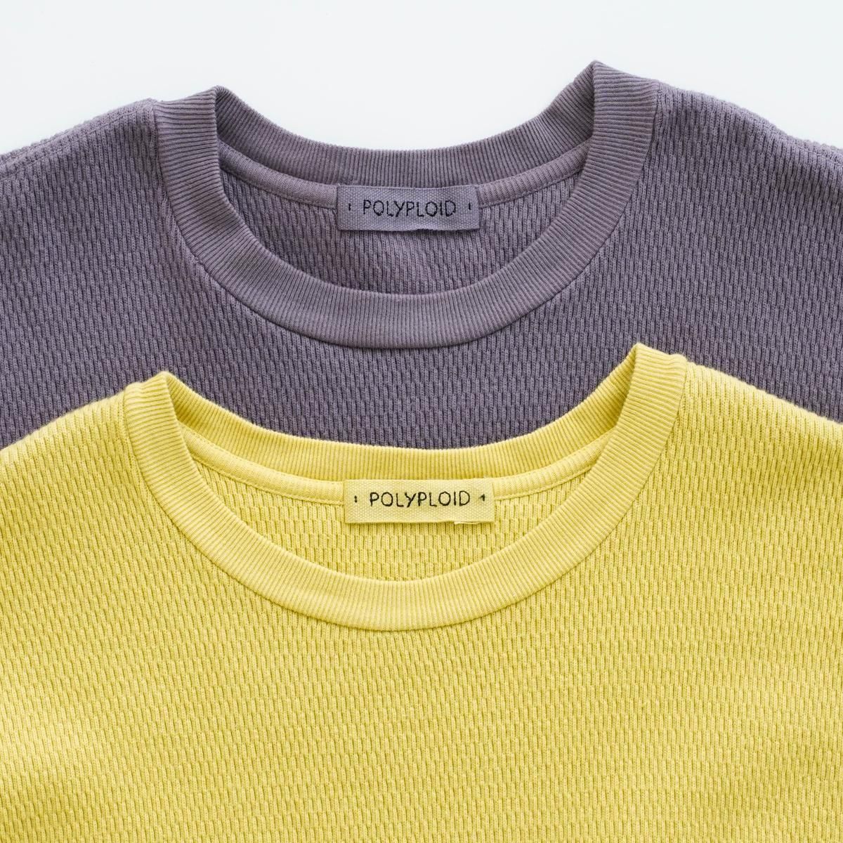 ヘビーウエイトのダブルフェイスサーマル生地を使用したロングスリーブTシャツです。 凹凸のある生地に程よい厚みがあるのでスウエット感覚で楽しんでいただけます。 全体的にゆったりとしたパターンですが、袖口はキュッと絞られ、裾も前後差があるので華奢な方や小柄な方でも着用しやすく、着る方の体格を選ばないカットソーです。 新色としてDUSK YELLOWとBERRY STONEが登場いたしました。 日本製 25AW size:1,3 size1: 着丈69cm,身幅64cm,肩幅54cm, 袖丈55.5cm size3: 着丈75cm,身幅70cm,肩幅58cm, 袖丈58.5cm color: DUSK YELLOW,BERRY STONE material:COTTON 100% model:168cm(size3着用) 173cm(size3着用) 取り扱い店舗・・・dieci kyutaro店2F ------------------------------------------------------- ポリプロイド(POLYPLOID)は、2017年にドイツ・ベルリンにてイゾルデ・オーギュスト・リッチリー(Isolde Auguste Richly)により設立。2018-19年秋冬コレクションにてデビュー。ブランド名のポリプロイドは化学用語で、「多倍数体」を意味する。3種類の異なる素材と色で展開することで、プロダクトに奥行きや広がりをもたらす実験的アプローチを試みている。生産はドイツおよび日本で行っている。ヨーロッパのマテリアルはドイツで縫製され、日本のマテリアルは日本で作られる。
