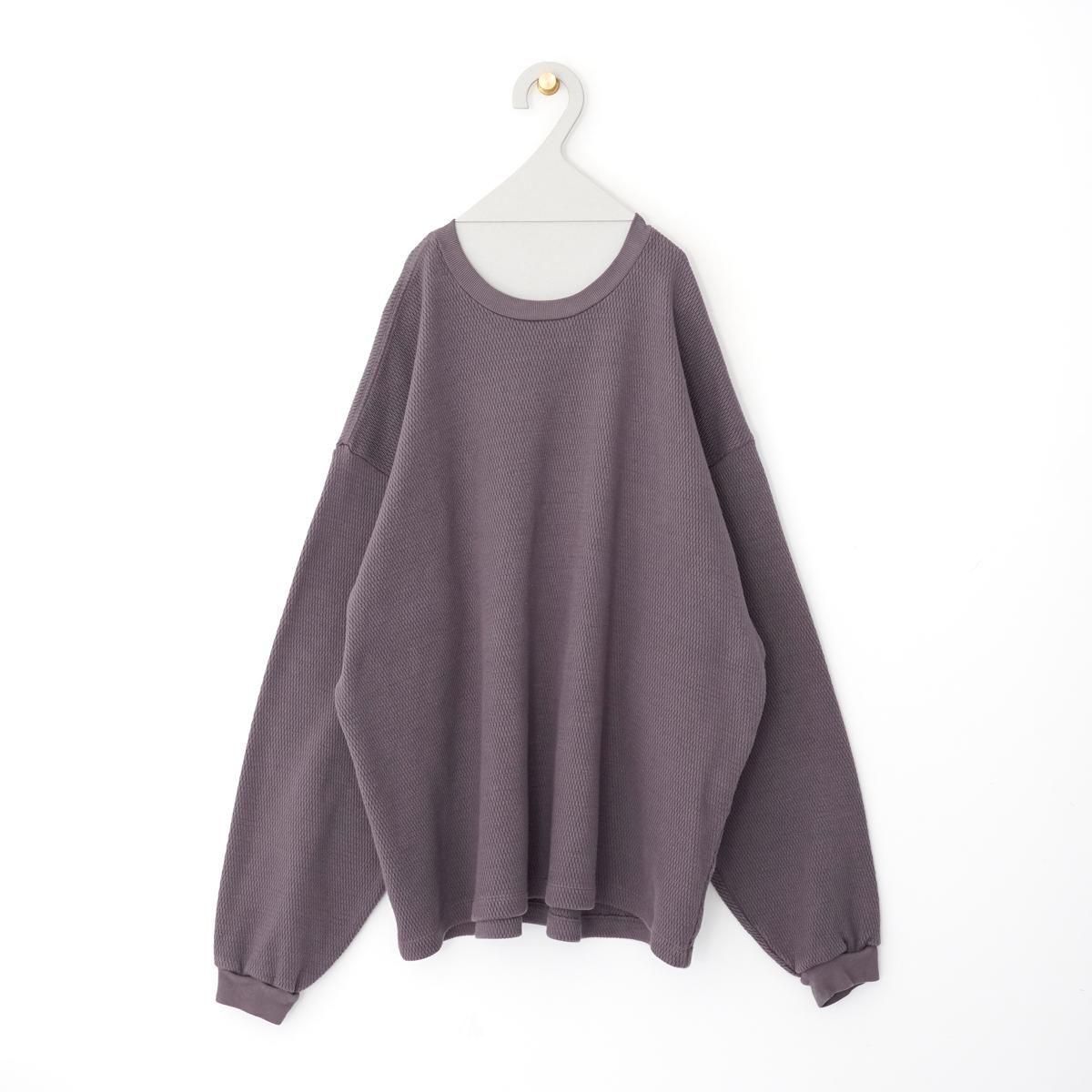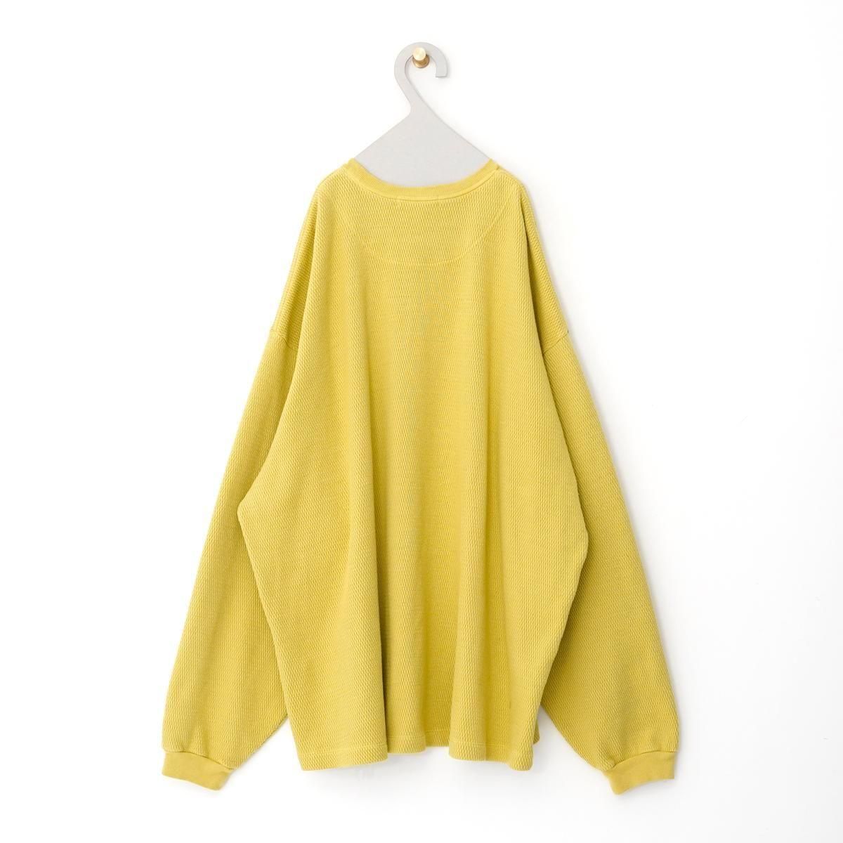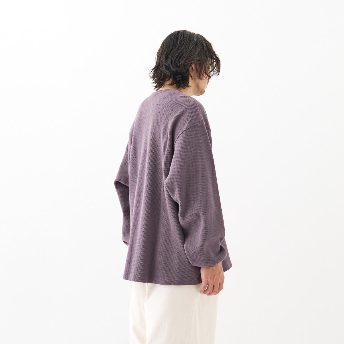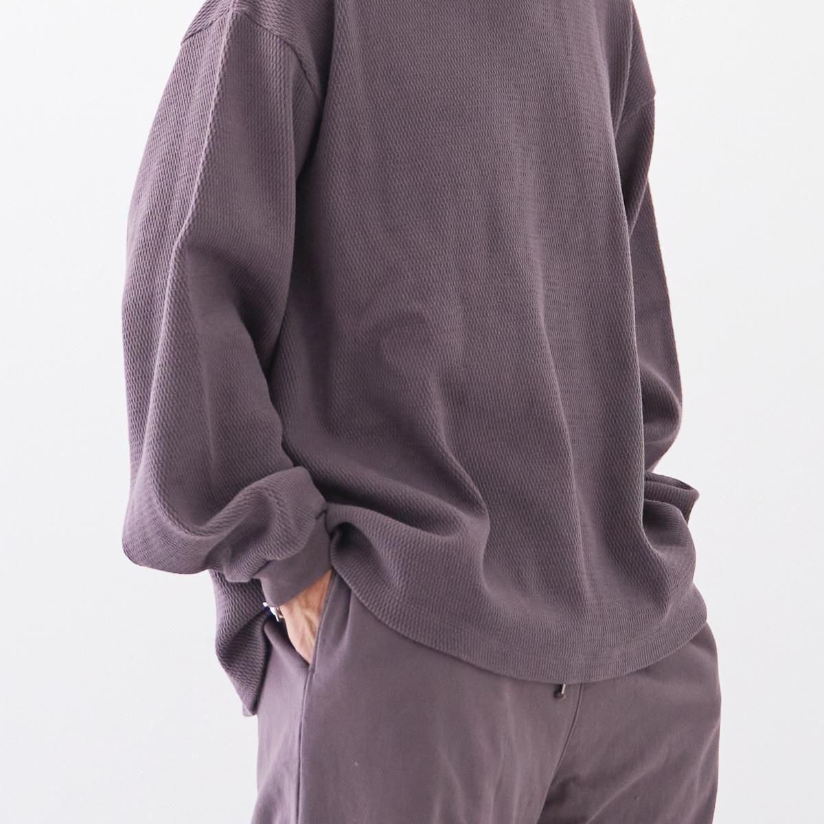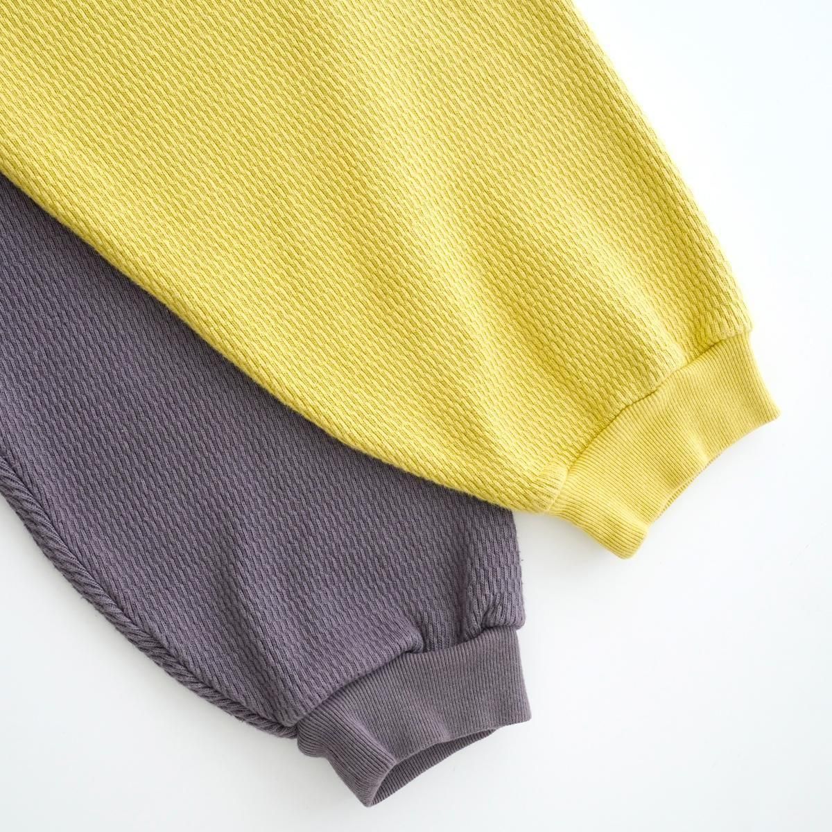ヘビーウエイトのダブルフェイスサーマル生地を使用したロングスリーブTシャツです。 凹凸のある生地に程よい厚みがあるのでスウエット感覚で楽しんでいただけます。 全体的にゆったりとしたパターンですが、袖口はキュッと絞られ、裾も前後差があるので華奢な方や小柄な方でも着用しやすく、着る方の体格を選ばないカットソーです。 新色としてDUSK YELLOWとBERRY STONEが登場いたしました。 日本製 25AW size:1,3 size1: 着丈69cm,身幅64cm,肩幅54cm, 袖丈55.5cm size3: 着丈75cm,身幅70cm,肩幅58cm, 袖丈58.5cm color: DUSK YELLOW,BERRY STONE material:COTTON 100% model:168cm(size3着用) 173cm(size3着用) 取り扱い店舗・・・dieci kyutaro店2F ------------------------------------------------------- ポリプロイド(POLYPLOID)は、2017年にドイツ・ベルリンにてイゾルデ・オーギュスト・リッチリー(Isolde Auguste Richly)により設立。2018-19年秋冬コレクションにてデビュー。ブランド名のポリプロイドは化学用語で、「多倍数体」を意味する。3種類の異なる素材と色で展開することで、プロダクトに奥行きや広がりをもたらす実験的アプローチを試みている。生産はドイツおよび日本で行っている。ヨーロッパのマテリアルはドイツで縫製され、日本のマテリアルは日本で作られる。