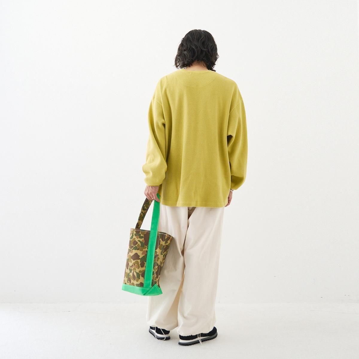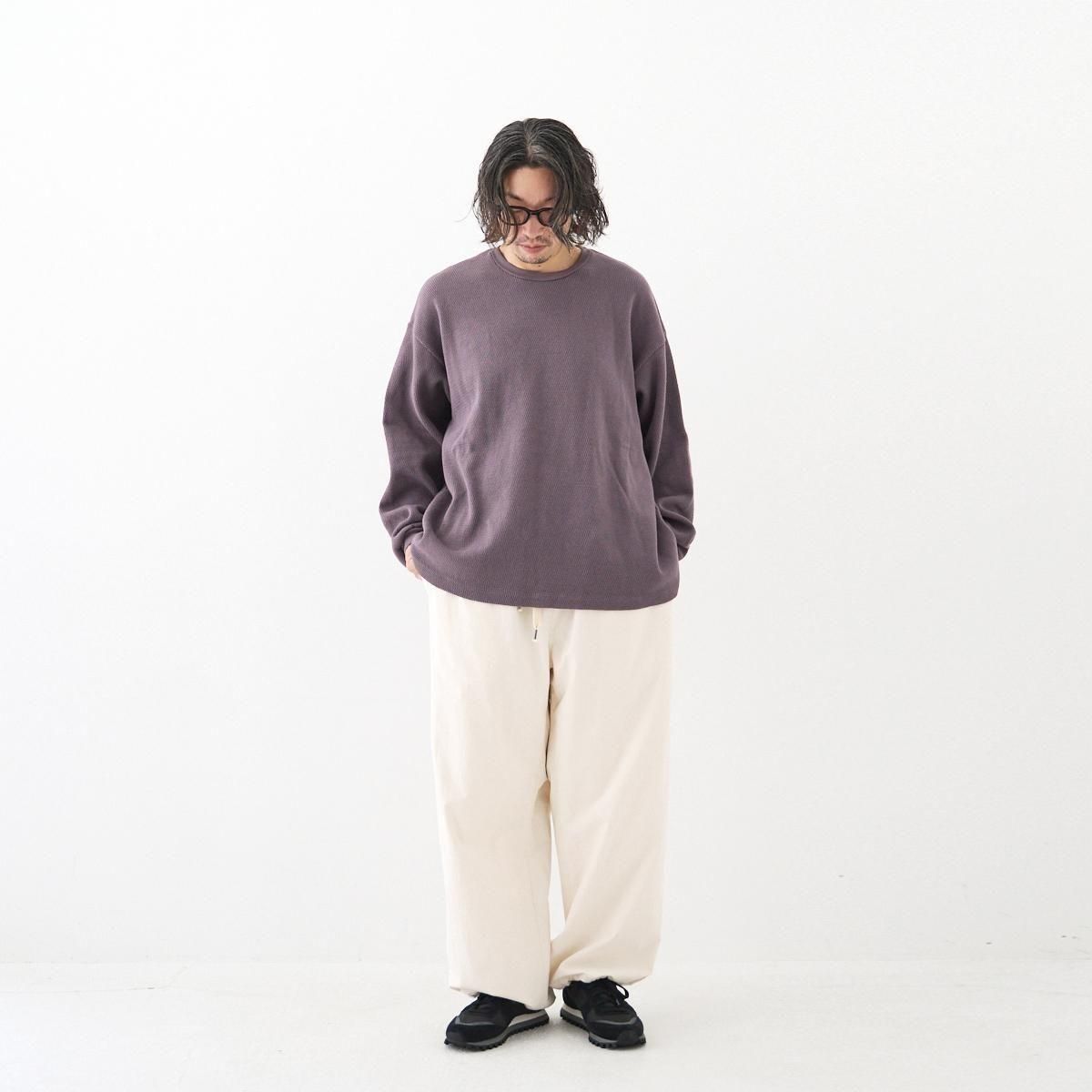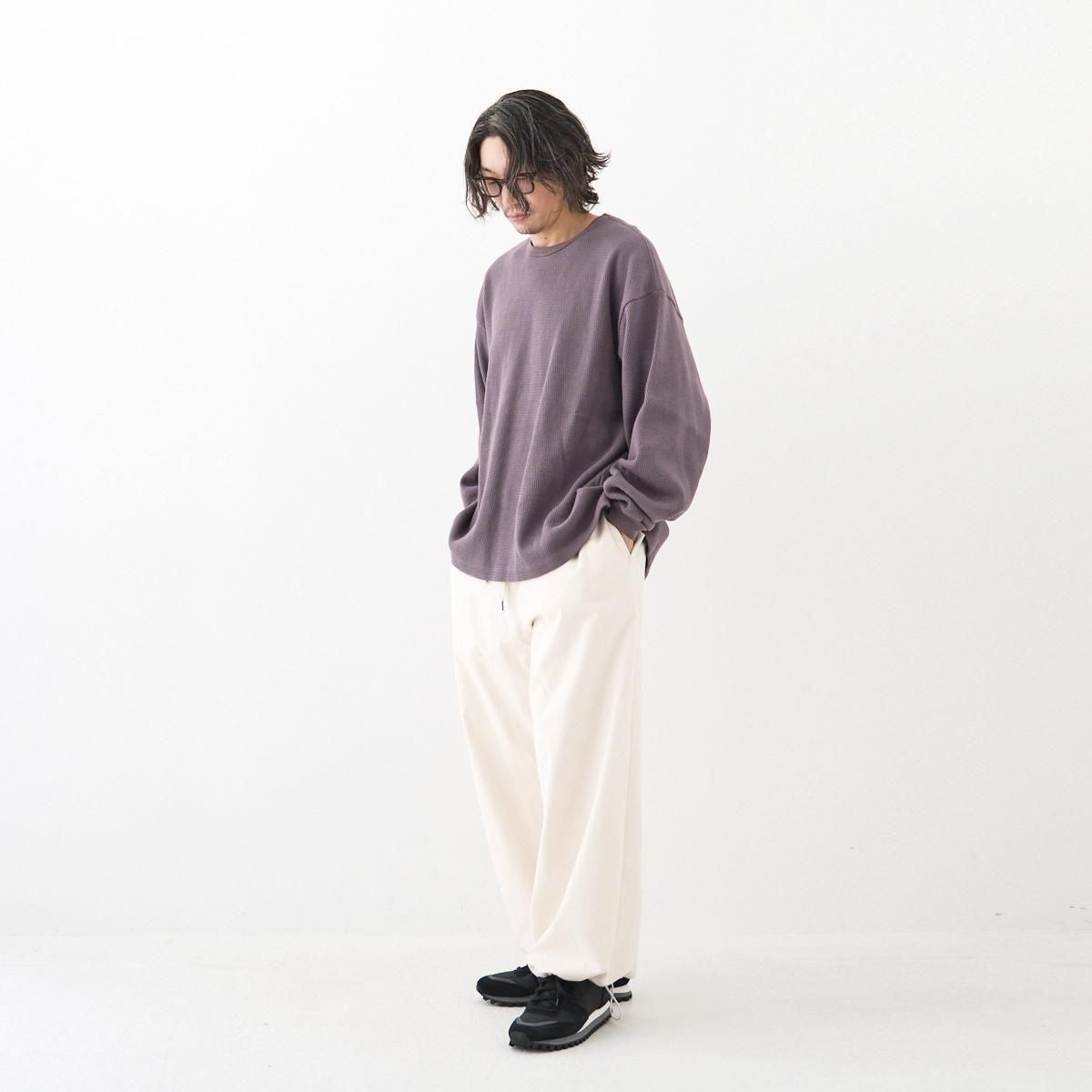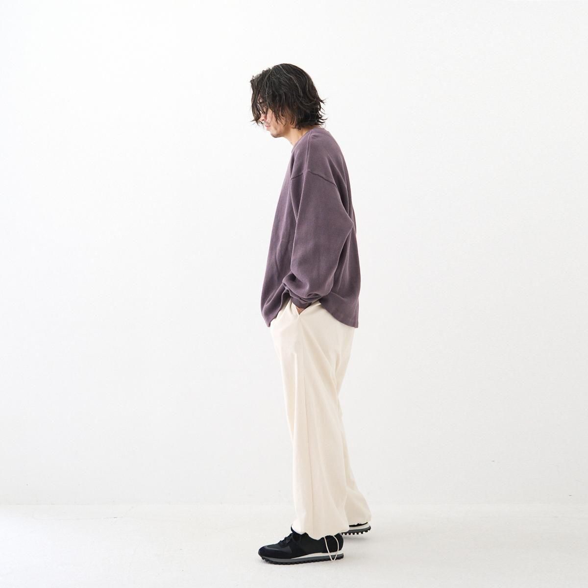 ヘビーウエイトのダブルフェイスサーマル生地を使用したロングスリーブTシャツです。 凹凸のある生地に程よい厚みがあるのでスウエット感覚で楽しんでいただけます。 全体的にゆったりとしたパターンですが、袖口はキュッと絞られ、裾も前後差があるので華奢な方や小柄な方でも着用しやすく、着る方の体格を選ばないカットソーです。 新色としてDUSK YELLOWとBERRY STONEが登場いたしました。 日本製 25AW size:1,3 size1: 着丈69cm,身幅64cm,肩幅54cm, 袖丈55.5cm size3: 着丈75cm,身幅70cm,肩幅58cm, 袖丈58.5cm color: DUSK YELLOW,BERRY STONE material:COTTON 100% model:168cm(size3着用) 173cm(size3着用) 取り扱い店舗・・・dieci kyutaro店2F ------------------------------------------------------- ポリプロイド(POLYPLOID)は、2017年にドイツ・ベルリンにてイゾルデ・オーギュスト・リッチリー(Isolde Auguste Richly)により設立。2018-19年秋冬コレクションにてデビュー。ブランド名のポリプロイドは化学用語で、「多倍数体」を意味する。3種類の異なる素材と色で展開することで、プロダクトに奥行きや広がりをもたらす実験的アプローチを試みている。生産はドイツおよび日本で行っている。ヨーロッパのマテリアルはドイツで縫製され、日本のマテリアルは日本で作られる。