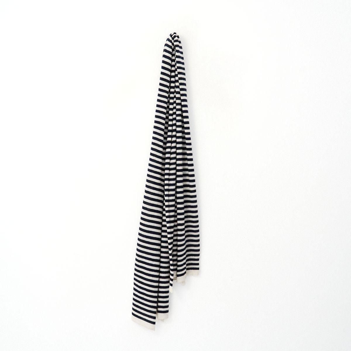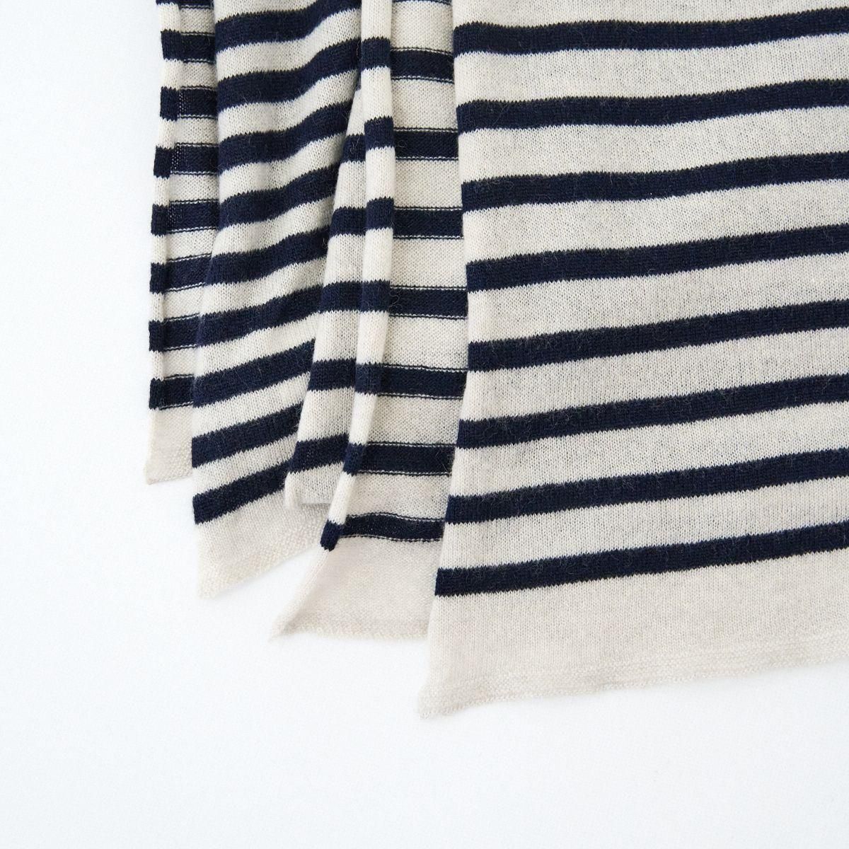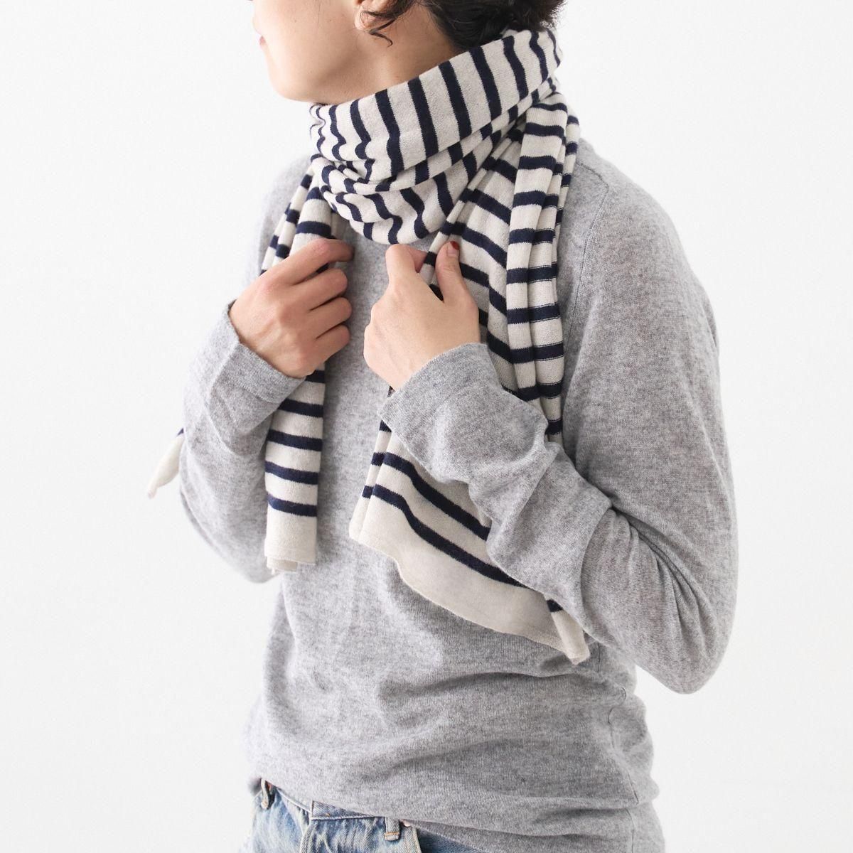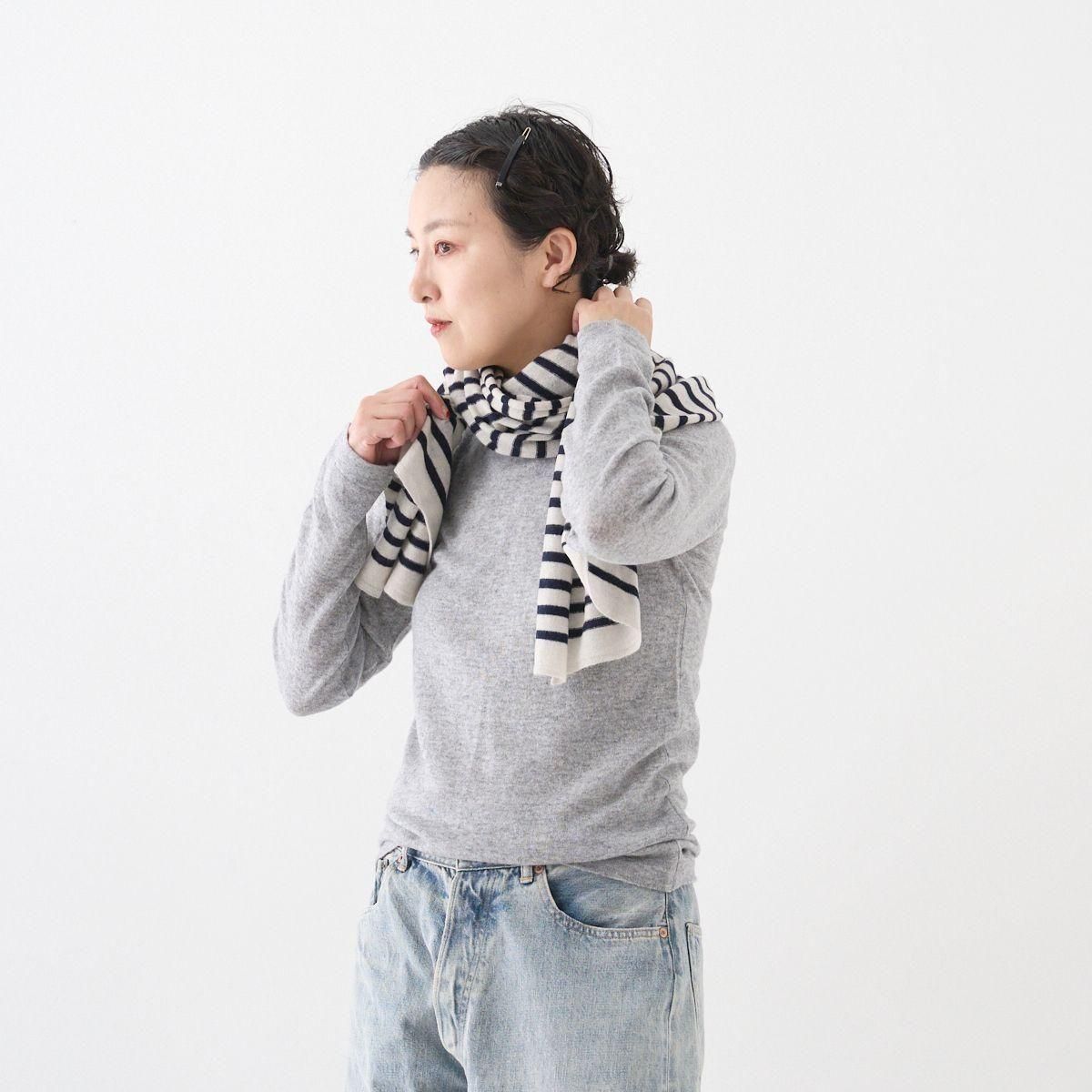 eleven 2ndは橋本靖代さんによる暮らしを意識したニットプロダクトです。20AWより上質なニットウエアやストールを展開しています。 こちらは世界においてもトップレベルのカシミア極細糸を使用したレギュラーサイズのストールです。 高い技術を持つ日本の職人により手間をかけて丁寧に生産されています。 ふくらみ感のある細いカシミヤ糸をその風合いを生かすように糸を撚り合せることなく単糸で編み上げ、ふくらみが糸に十分に生かされていて、軽くソフトな肌触りはとても気持ちが良いです。 レギュラーはマフラー的な巻き方、ふんわり巻く、羽織るように巻くなどさまざまな楽しみ方が出来ます。秋口や春先にも使いやすいサイズです。 25AW size:レギュラー(F) 約180cm×52cm 参考寸法(平置き) ニットの為多少の差異がございます。 color: White Smoke/navy , Navy Border(太) material:cashmere 100% ※使用している糸が繊細な為、力の加わり方により破れの原因になることがあります。着脱時には充分にご注意ください。 素材の特性上、ねじれ(斜行)が見られる事があります。 着用中の摩擦や洗濯により毛羽立ちや毛玉が発生しやすく、その場合は毛玉を引っ張ることをお避けください。 衣料の重ね着の際、摩擦や雨で濡れた状態で移染する恐れがあります。ご注意ください。 取扱い店舗…dieci芝川ビル店 size_chart