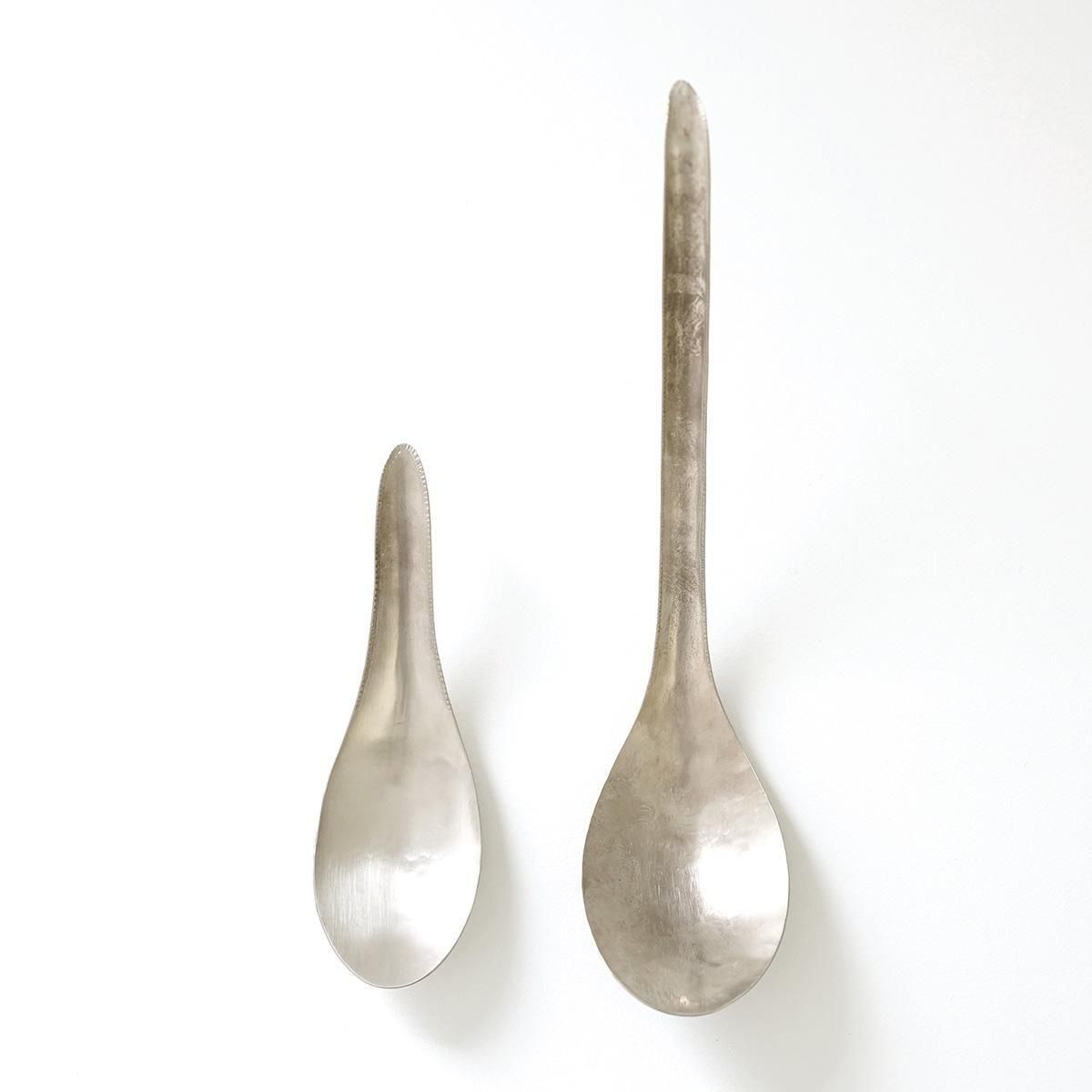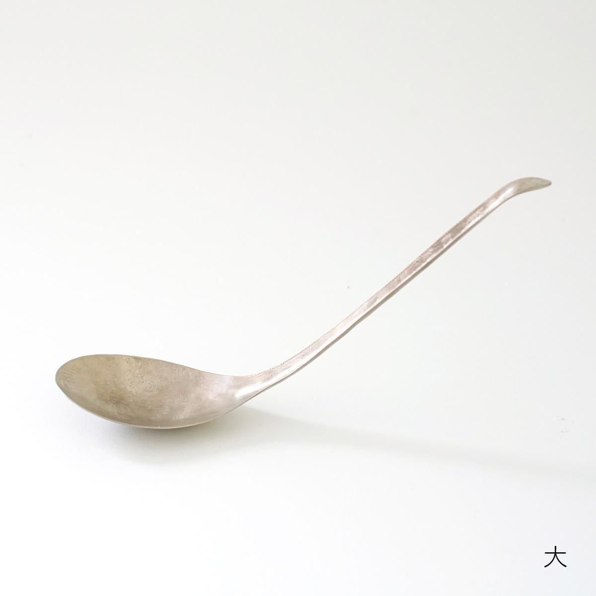 すばらしい技術と楽しさが当たり前に共存するモノづくりのスタイルを大切にするF/style(エフスタイル)さん。 こちらは新潟在住の金工作家・大桃沙織さんとの協働で生まれた鍛金のレンゲ小と大です。 立体的なフォルムで持ちやすく、柄の縁には細かな模様が刻まれています。 洋白でできたレンゲは口に入れた時の金属特有の素材感を感じにくく、冷たいものはもちろん、熱いものにもお使いいただけます。 小さめのサイズはデザートやスープに、大きめのサイズは深い鉢にも沈まないため取り分け用のレードルとしてもおすすめです。 size: 小 幅3.5 × 全長11 cm 大 幅4 × 全長18 cm ※サイズには個体差がございます。 material:洋白(銅と亜鉛とニッケルの合金) price: 小 4,180円(税込) 大 4,950円(税込) 取り扱い店舗:dieci kyutaro店 1F