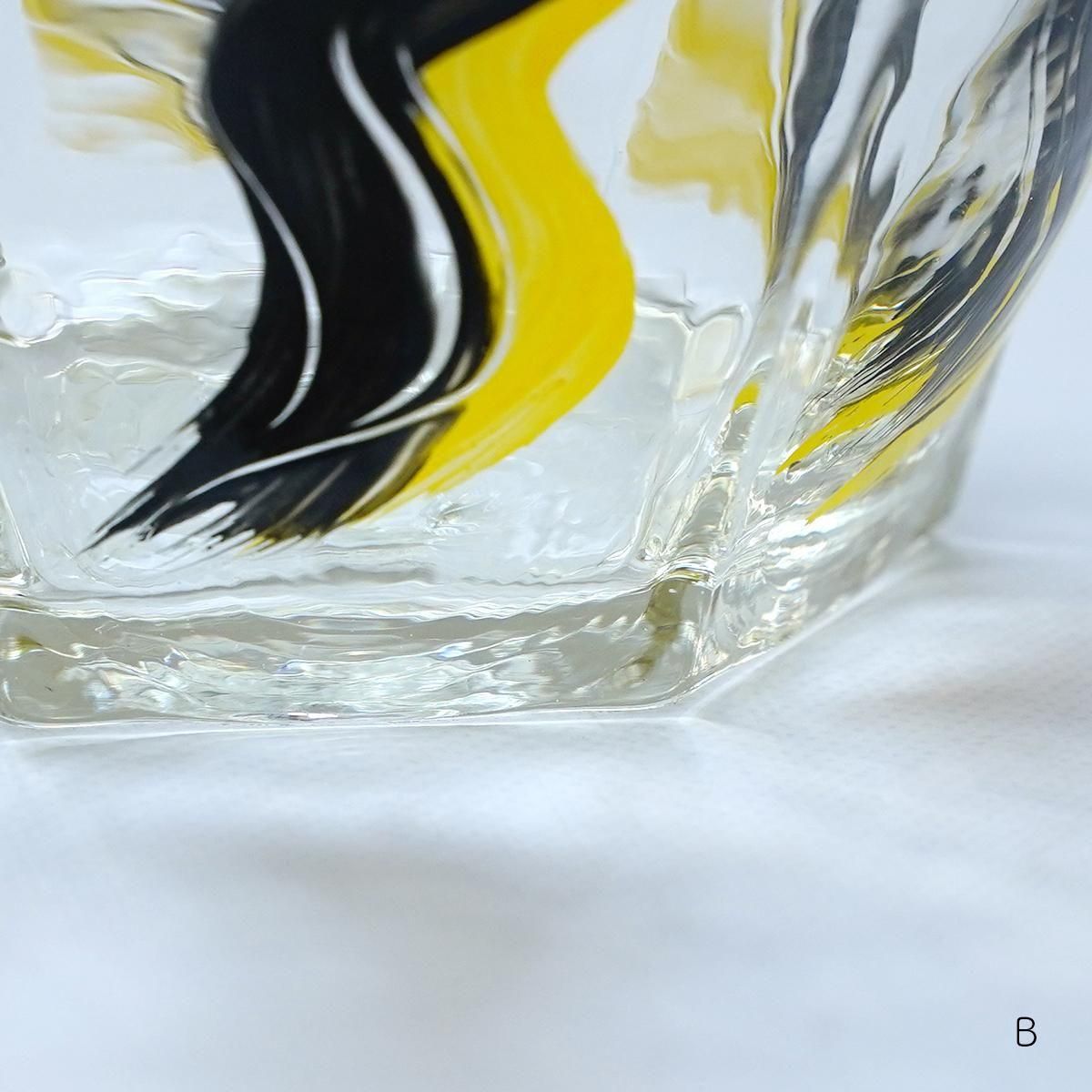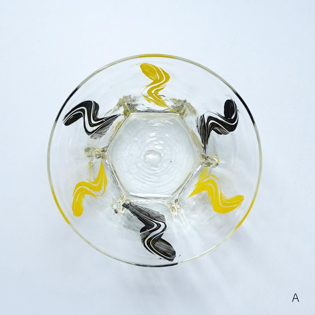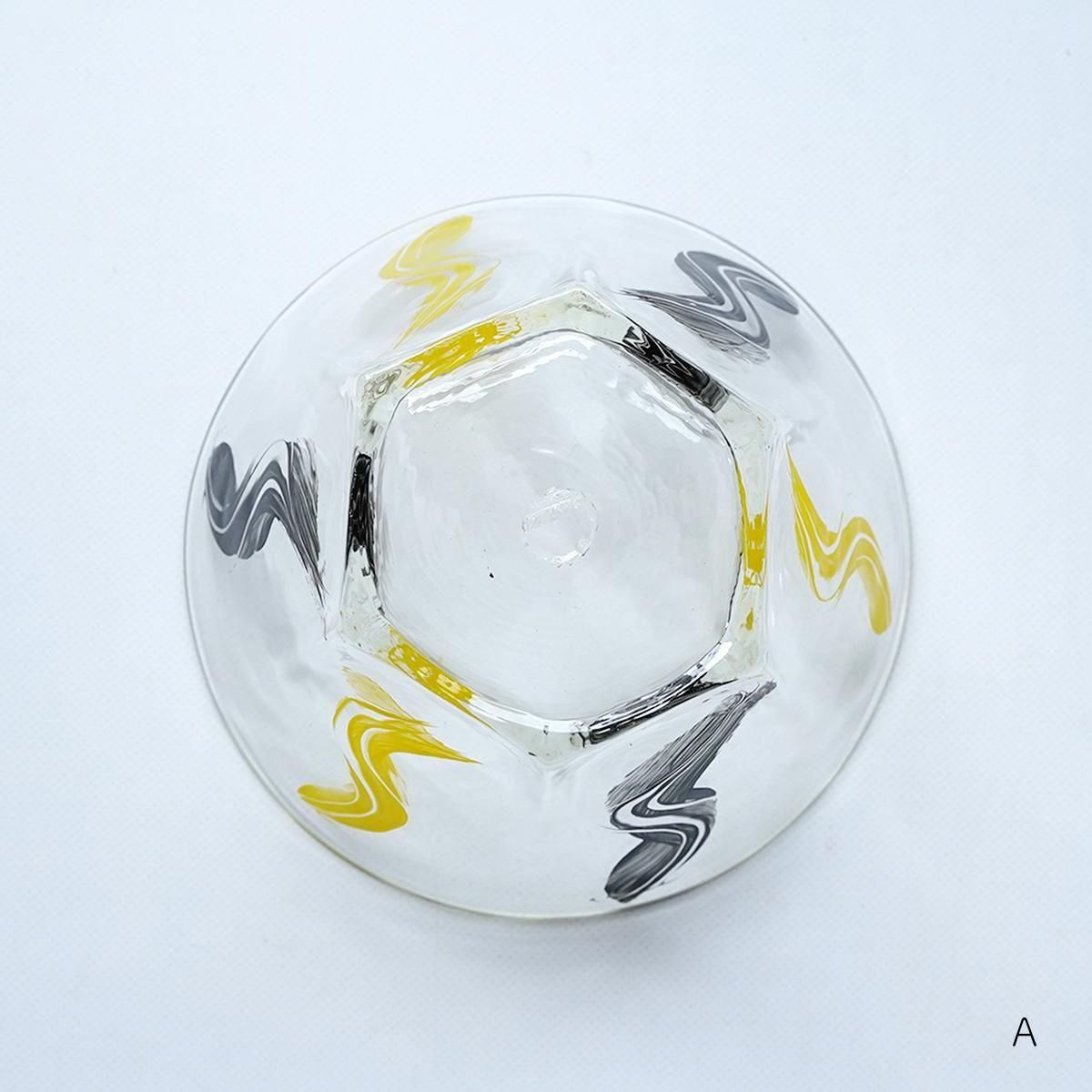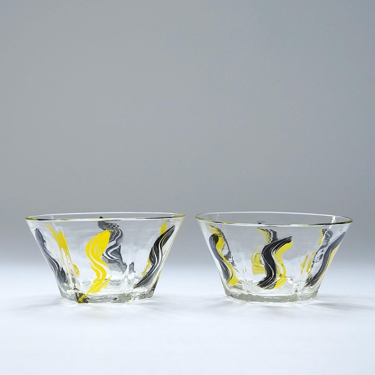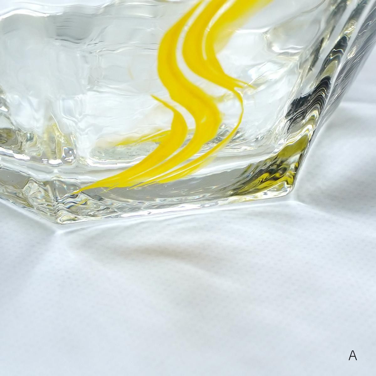 岡山・倉敷でガラス作りをされている石川硝子工藝舎、石川昌浩さんの作品です。 石川昌浩さんは倉敷にてガラス工芸を学ばれた後「石川硝子工藝舎」を立ち上げ、日々の生活にとけ込む日用の器を作り続けていらっしゃいます。 暮らしのそばで静かに光をたたえる石川昌浩さんの硝子。 硝子がもつ神聖さを感じて欲しいと願い生まれた今回の展示【石川硝子工藝舎展 二〇二五】では、祈りの対象物のように日々に寄り添う作品を制作していただきました。 こちらは石川さんの硝子に、熊本県・ふもと窯の井上尚之さんが絵付けをしたコラボシリーズの面取鉢(中)です。 普段はスリップウェアの器を製作されている井上尚之さん。 今回は硝子に黒、白、黄の線で井上さんらしい伸びやかな装飾を施していただきました。 底の六角形から縁に向かってゆるやかに丸くなったシンプルな鉢。 硝子特有のゆらぎが感じられ、シャープな形でありながら、柔らかな印象ももっています。 サラダなどの取り皿として、ヨーグルトやアイスなどを盛り付けるお皿としてもおすすめです。 ※サイズ・カラーには個体差がございます。 ※裏面の突起は手吹きガラスの製造工程で出来る物で、傷ではございません。作品の風合としてお楽しみ頂けますと幸いです。 ※気泡などが混じる場合がございます。製造過程で出来るものですので、作品の風合としてお楽しみくださいませ。 size:約 Φ12.5cm, H6.5cm お取り扱い店舗・・・dieci kyutaro店 1F