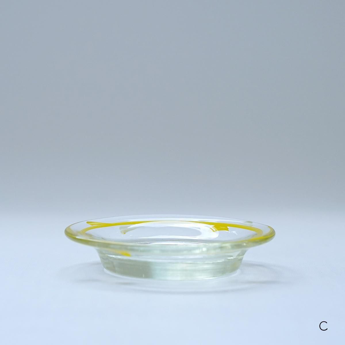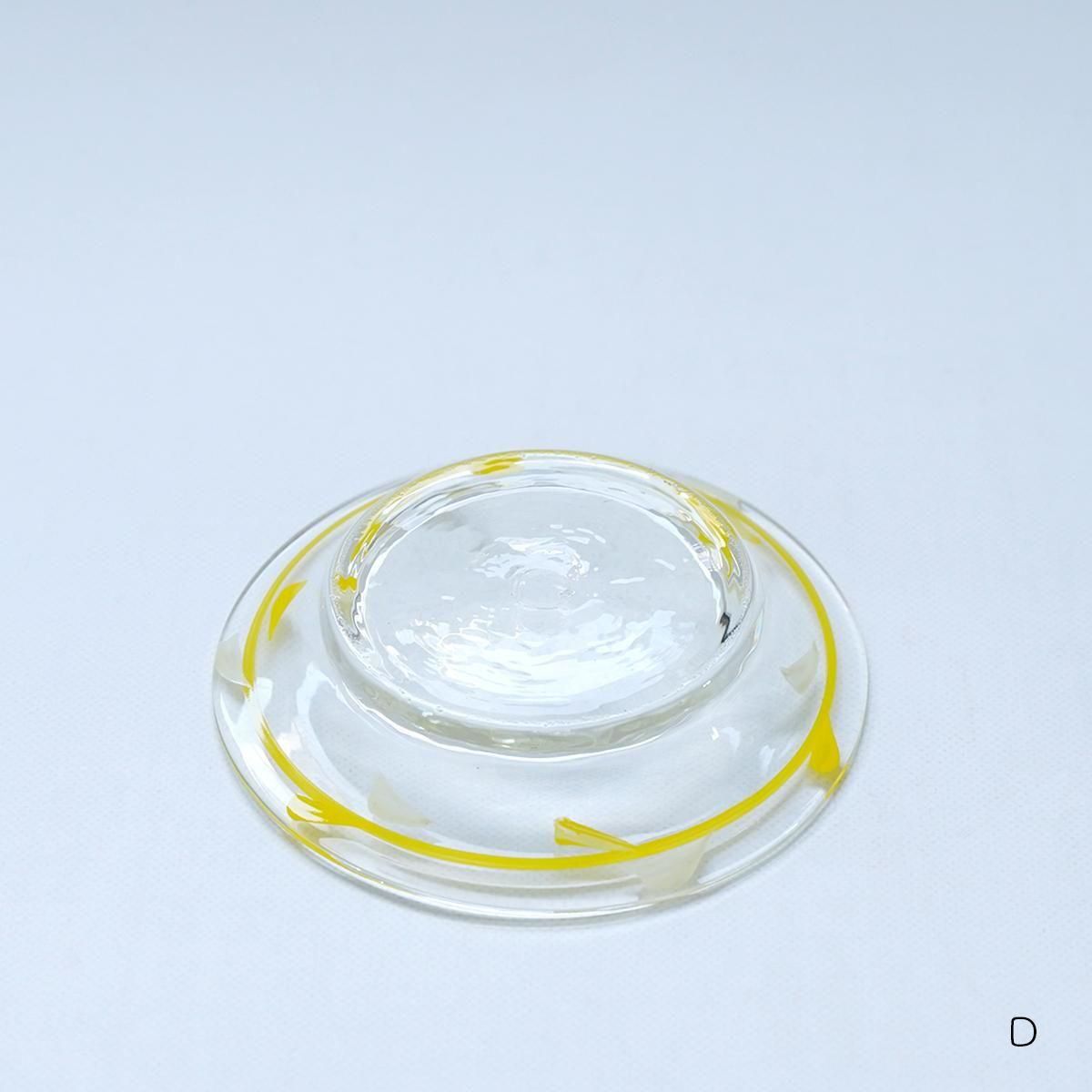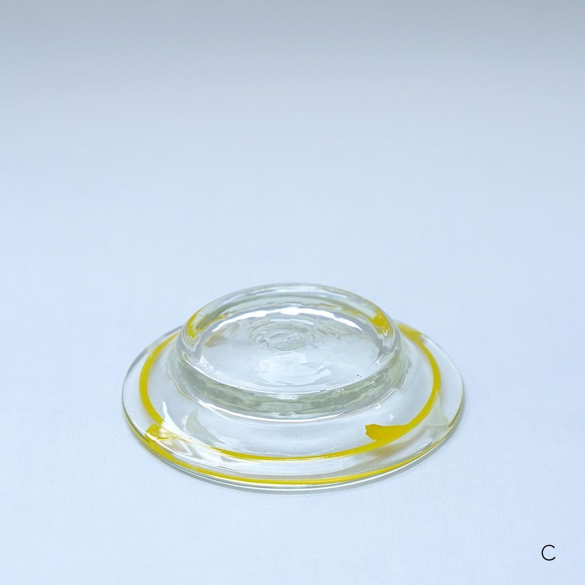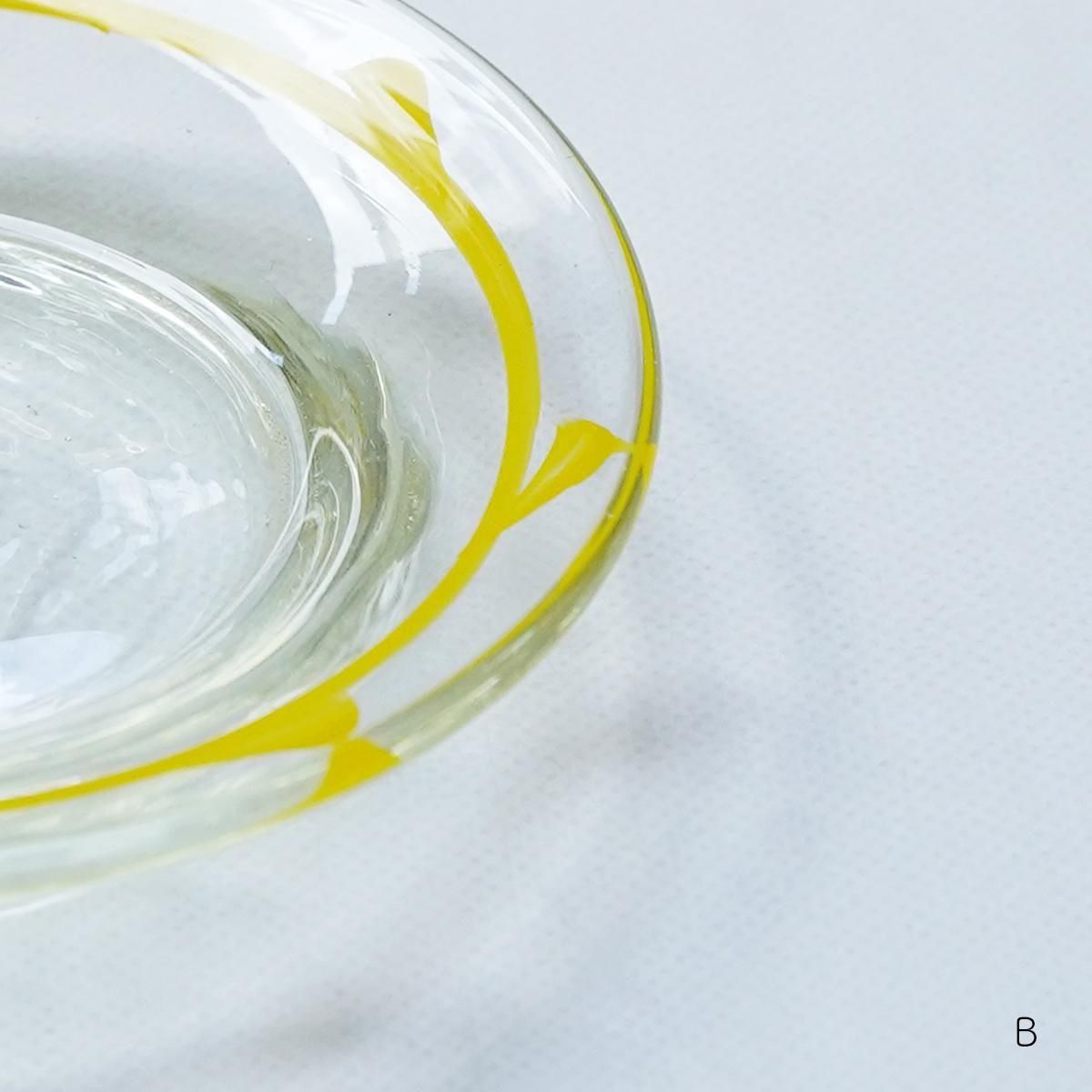 岡山・倉敷でガラス作りをされている石川硝子工藝舎、石川昌浩さんの作品です。 石川昌浩さんは倉敷にてガラス工芸を学ばれた後「石川硝子工藝舎」を立ち上げ、日々の生活にとけ込む日用の器を作り続けていらっしゃいます。 暮らしのそばで静かに光をたたえる石川昌浩さんの硝子。 硝子がもつ神聖さを感じて欲しいと願い生まれた今回の展示【石川硝子工藝舎展 二〇二五】では、祈りの対象物のように日々に寄り添う作品を制作していただきました。 こちらは石川さんの硝子に、熊本県・ふもと窯の井上尚之さんが絵付けをしたコラボシリーズの小皿です。 普段はスリップウェアの器を製作されている井上尚之さん。 今回は硝子に黒、白、黄の線で井上さんらしい伸びやかな装飾を施していただきました。 お皿の縁が一段上がっているシンプルな小皿。 薬味や豆菓子など、ちょっとした副菜やおやつを盛りつけるのにちょうどいい大きさです。 食器としてだけではなく、アクセサリーを置くプレートとしてもおすすめです。 ※サイズ・カラーには個体差がございます。 ※裏面の突起は手吹きガラスの製造工程で出来る物で、傷ではございません。作品の風合としてお楽しみ頂けますと幸いです。 ※気泡などが混じる場合がございます。製造過程で出来るものですので、作品の風合としてお楽しみくださいませ。 size:約 Φ10cm, H2cm お取り扱い店舗・・・dieci kyutaro店 1F