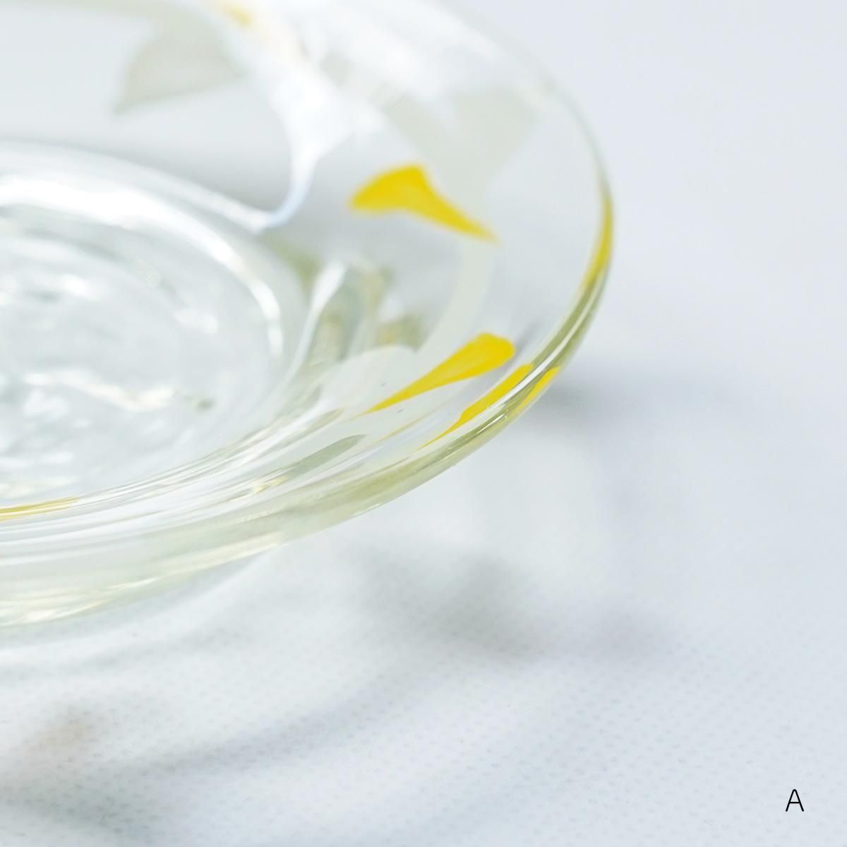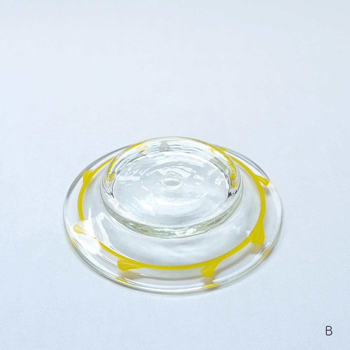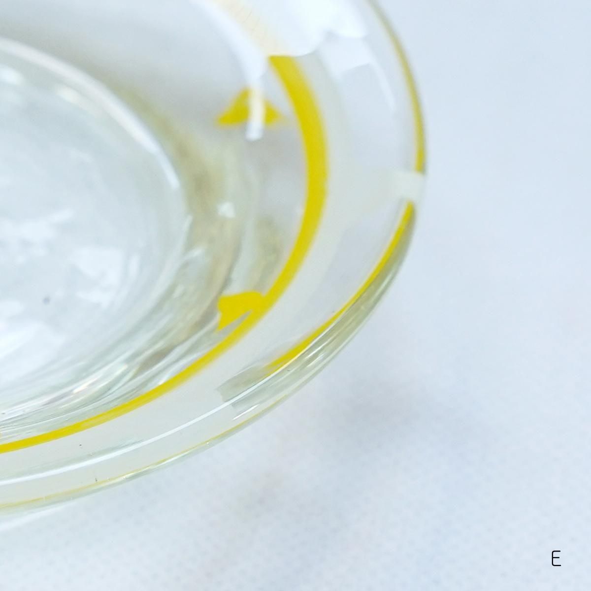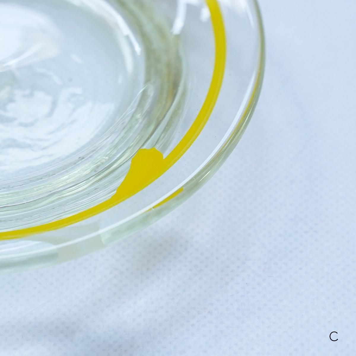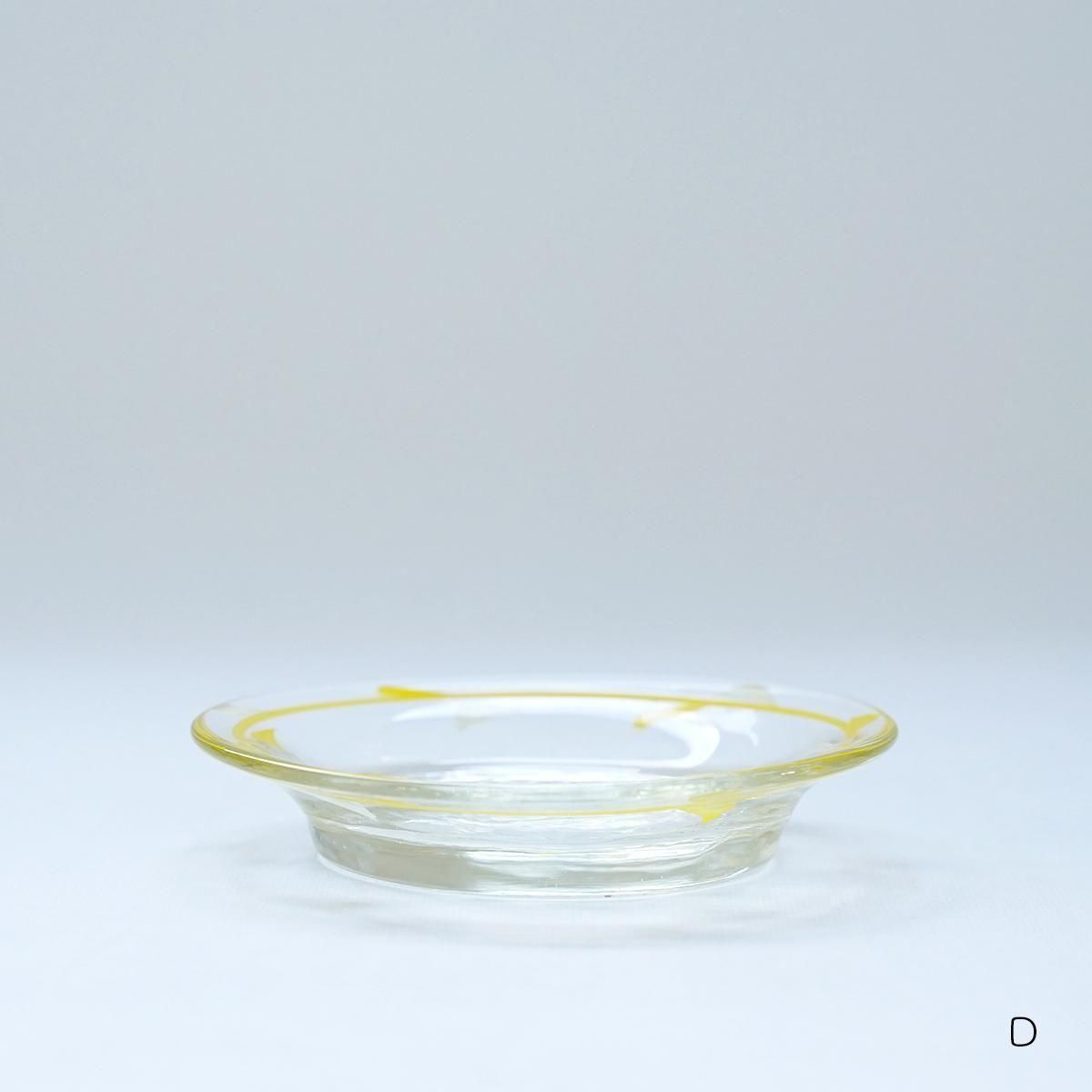 岡山・倉敷でガラス作りをされている石川硝子工藝舎、石川昌浩さんの作品です。 石川昌浩さんは倉敷にてガラス工芸を学ばれた後「石川硝子工藝舎」を立ち上げ、日々の生活にとけ込む日用の器を作り続けていらっしゃいます。 暮らしのそばで静かに光をたたえる石川昌浩さんの硝子。 硝子がもつ神聖さを感じて欲しいと願い生まれた今回の展示【石川硝子工藝舎展 二〇二五】では、祈りの対象物のように日々に寄り添う作品を制作していただきました。 こちらは石川さんの硝子に、熊本県・ふもと窯の井上尚之さんが絵付けをしたコラボシリーズの小皿です。 普段はスリップウェアの器を製作されている井上尚之さん。 今回は硝子に黒、白、黄の線で井上さんらしい伸びやかな装飾を施していただきました。 お皿の縁が一段上がっているシンプルな小皿。 薬味や豆菓子など、ちょっとした副菜やおやつを盛りつけるのにちょうどいい大きさです。 食器としてだけではなく、アクセサリーを置くプレートとしてもおすすめです。 ※サイズ・カラーには個体差がございます。 ※裏面の突起は手吹きガラスの製造工程で出来る物で、傷ではございません。作品の風合としてお楽しみ頂けますと幸いです。 ※気泡などが混じる場合がございます。製造過程で出来るものですので、作品の風合としてお楽しみくださいませ。 size:約 Φ10cm, H2cm お取り扱い店舗・・・dieci kyutaro店 1F