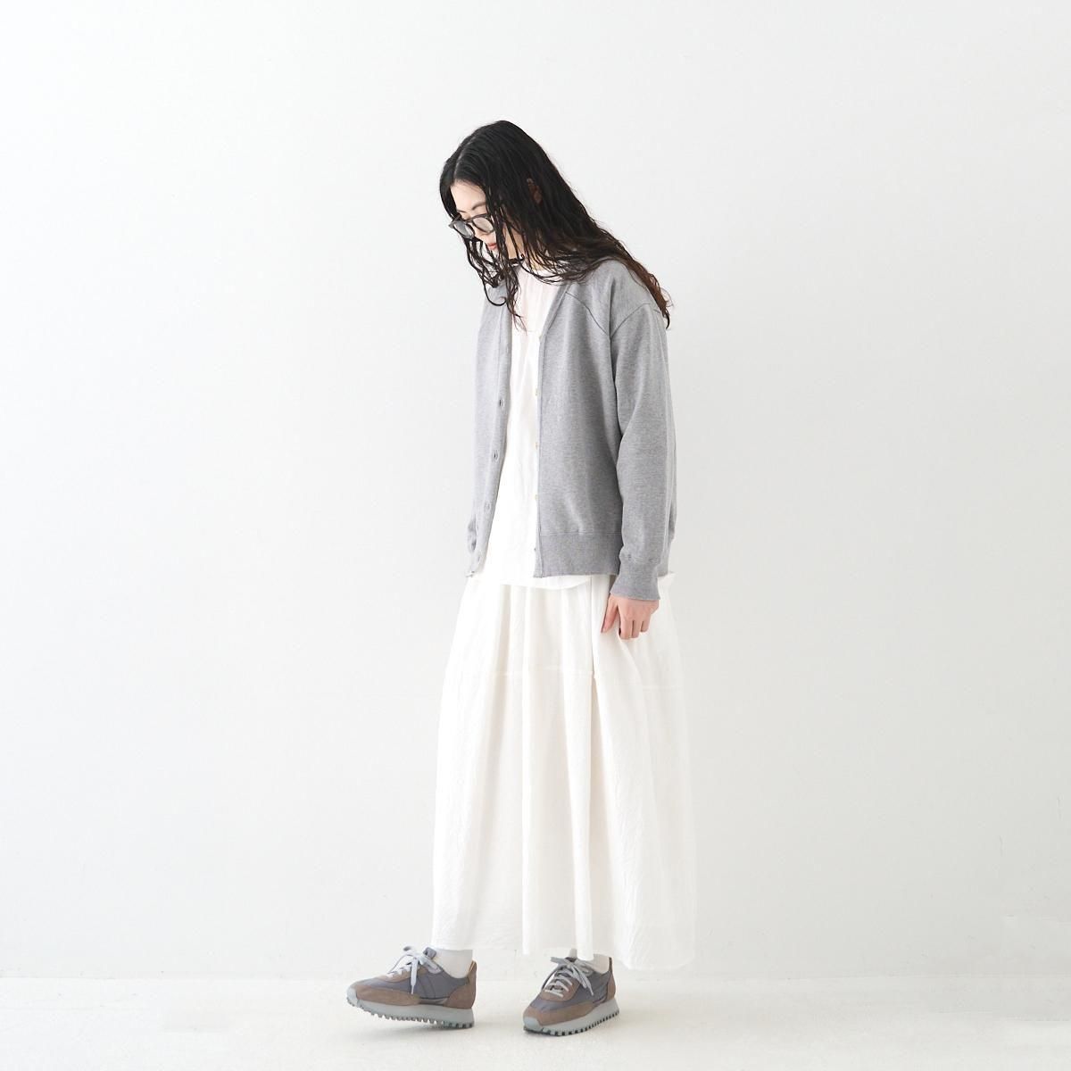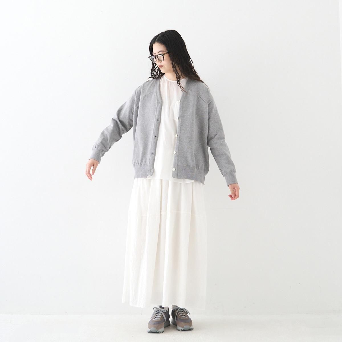 着回し力抜群のVネックカーディガン。 柔らかなコットン素材を使用し、カットソーよりややしっかり、スウェットより軽やかな中肉厚の生地感が特徴です。すっきりとしたVネックデザインは、シャツやカットソー、タートルネックなど様々なトップスとも相性が良いです。 袖口と裾はリブ仕立てで、程よいフィット感ときちんと感を演出します。 肌寒い秋口には軽い羽織として、寒さの増す冬場にはアウターの下に重ね着してももたつかず、ロングシーズン活躍してくれる1枚です。 25AW size:M 着丈65.6cm 肩幅48cm 身幅59cm 袖丈55cm color:グレー / ブラック material:綿100% model:168cm 取扱い店舗・・・dieci kyutaro店2F ------------------------------------------------------- 2000年に3人の女性でスタートされたhomspun(ホームスパン)。「シンプルで自分たちが毎日着たいと思える服を」、そんな彼女たちの思いから生まれたブランドです。