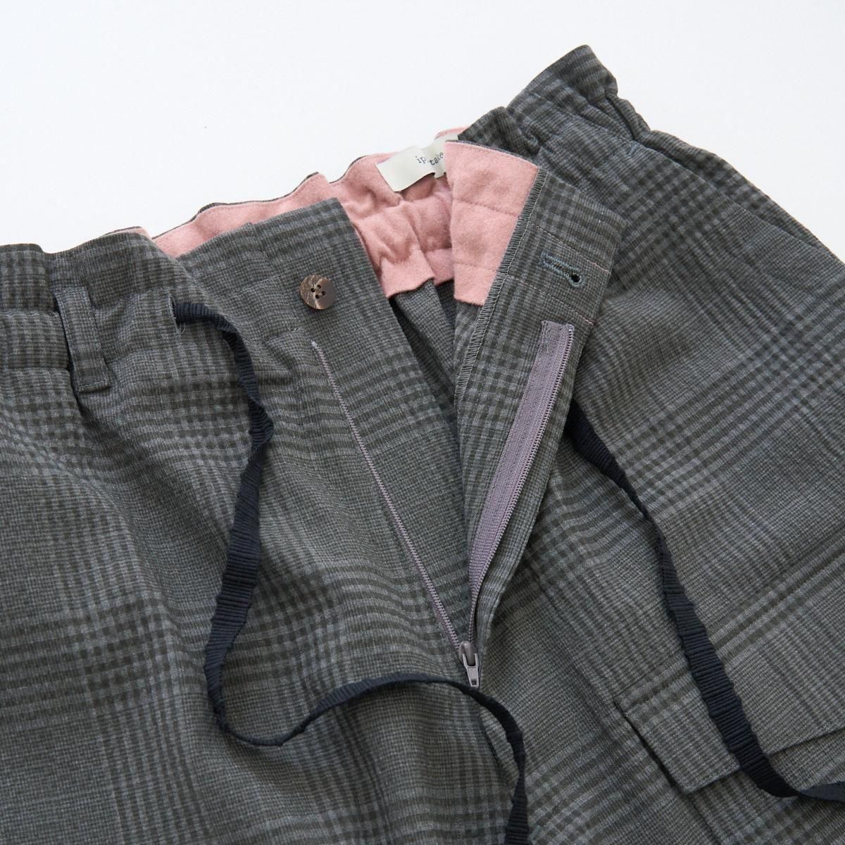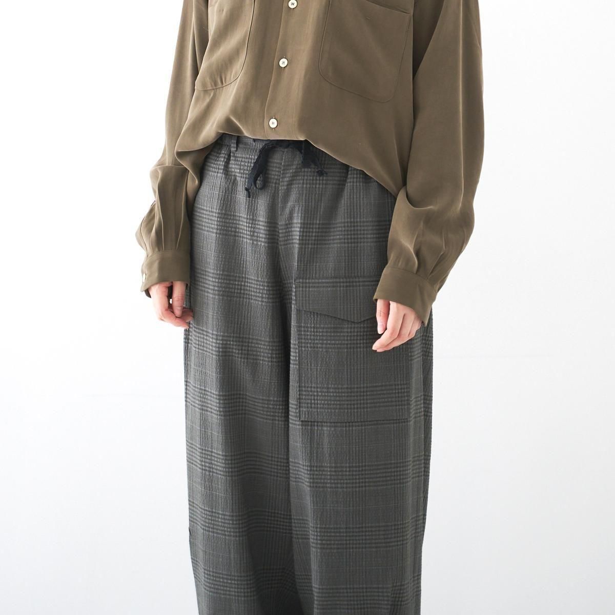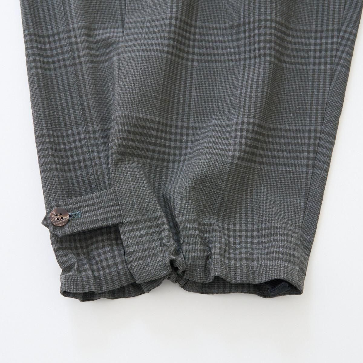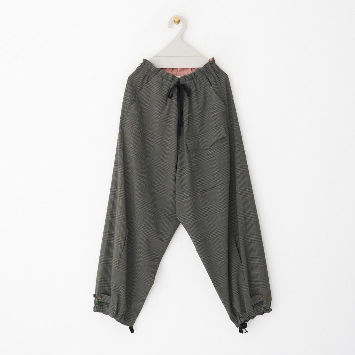 ゆったりとした履き心地の良いカーゴパンツ。 小柄な方も裾にボタン調節と紐での調節があるので、お好みで裾幅を変えてよりカーゴパンツっぽく着用いただけます。 ボリュームのあるシルエットですが、シャリ感のある薄手のウール生地なので、収まりが良く綺麗な印象に。シーズン問わずお使いいただける万能なパンツです。 size:1 ウエスト〜44cm(調整可能)/股上40.5cm/股下69cm/わたり43.5cm/裾幅〜28.5cm(調整可能) color:gray check material : wool98%,polyurethane2% model : 168cm 取り扱い店舗・・・dieci kyutaro店 2F size_chart ---------------------------------------------------- ippei takei/イッペイ タケイ レディースウェアを中心としたブランド。パターン、縫製など全てを自ら行うパンツの受注生産を経て2000年にスタートしました。コンセプトは男性のワードローブを女性に向けて開放すること。ユニセックスなアイテムを敢えて女性らしくアレンジしたり、コレクションごとにテーマを変えて展開されています。