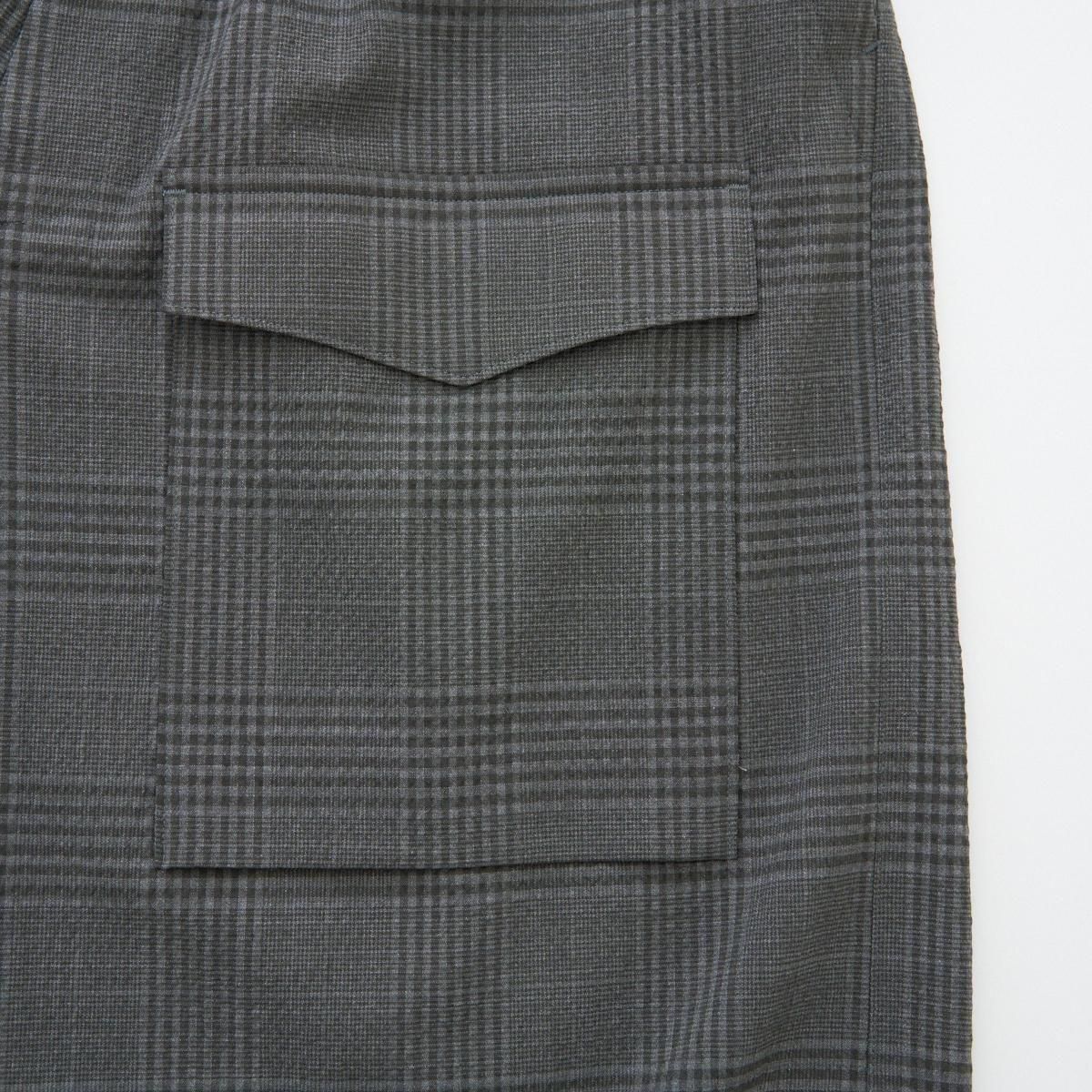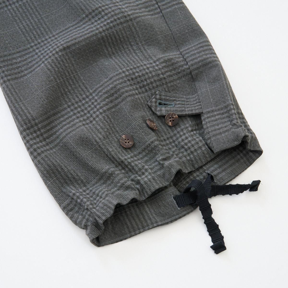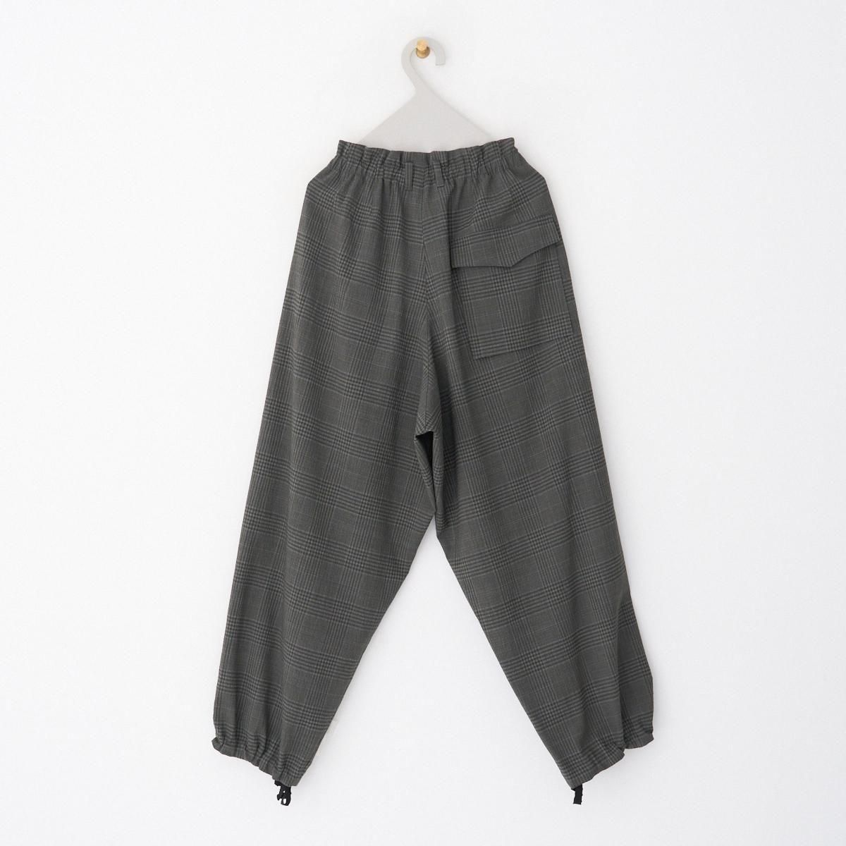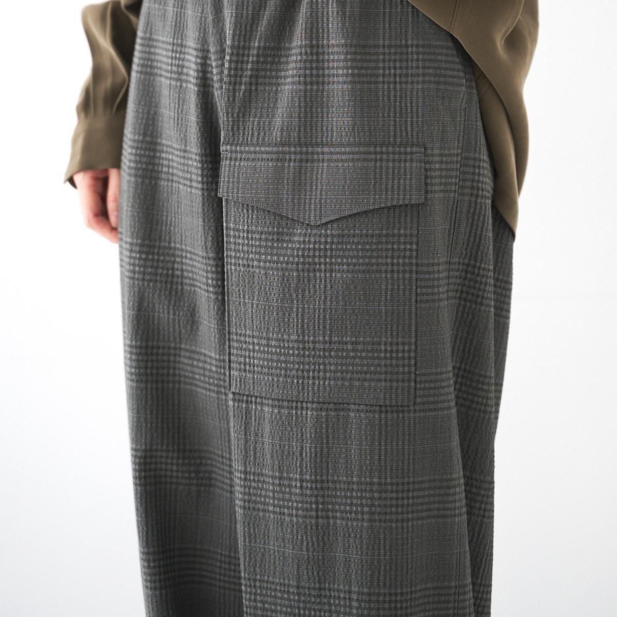ゆったりとした履き心地の良いカーゴパンツ。 小柄な方も裾にボタン調節と紐での調節があるので、お好みで裾幅を変えてよりカーゴパンツっぽく着用いただけます。 ボリュームのあるシルエットですが、シャリ感のある薄手のウール生地なので、収まりが良く綺麗な印象に。シーズン問わずお使いいただける万能なパンツです。 size:1 ウエスト〜44cm(調整可能)/股上40.5cm/股下69cm/わたり43.5cm/裾幅〜28.5cm(調整可能) color:gray check material : wool98%,polyurethane2% model : 168cm 取り扱い店舗・・・dieci kyutaro店 2F size_chart ---------------------------------------------------- ippei takei/イッペイ タケイ レディースウェアを中心としたブランド。パターン、縫製など全てを自ら行うパンツの受注生産を経て2000年にスタートしました。コンセプトは男性のワードローブを女性に向けて開放すること。ユニセックスなアイテムを敢えて女性らしくアレンジしたり、コレクションごとにテーマを変えて展開されています。