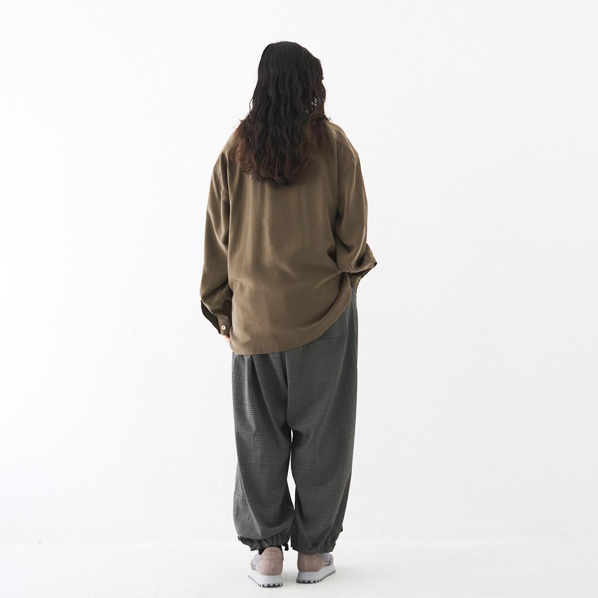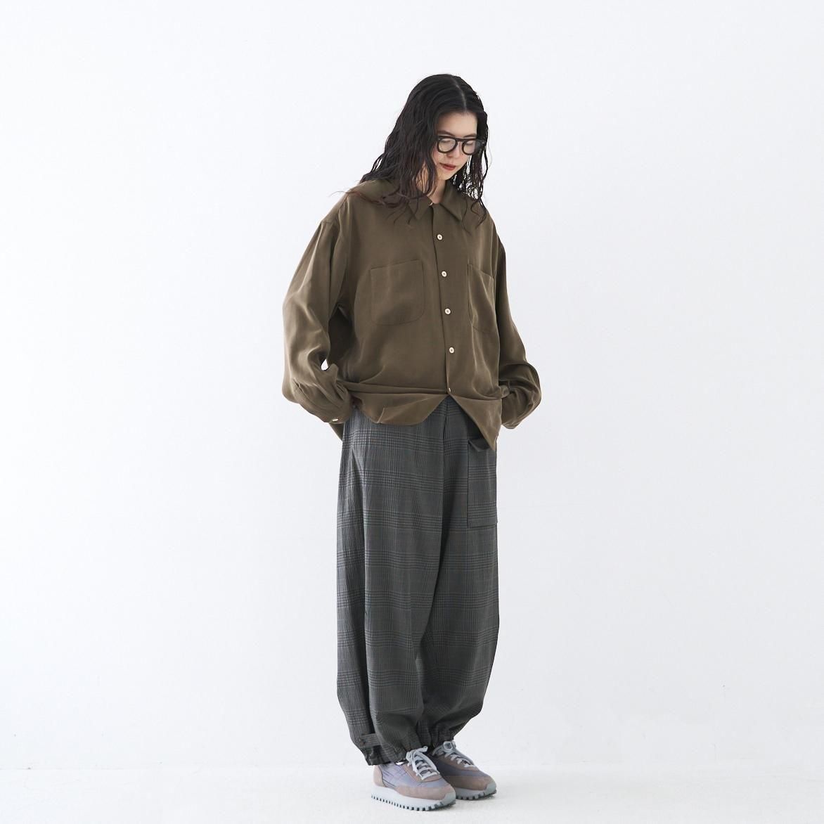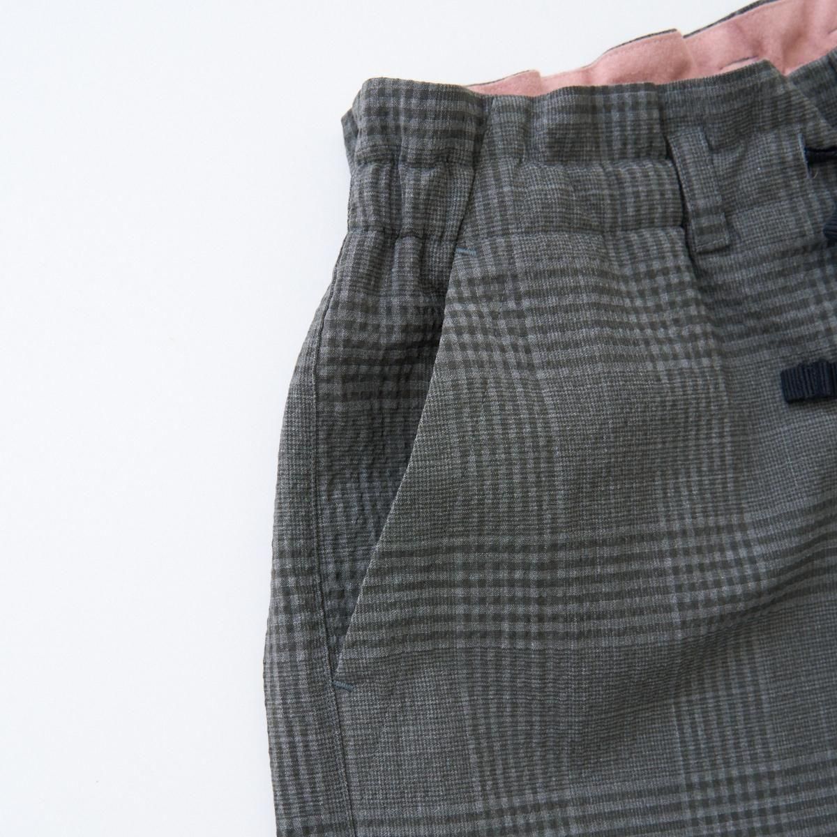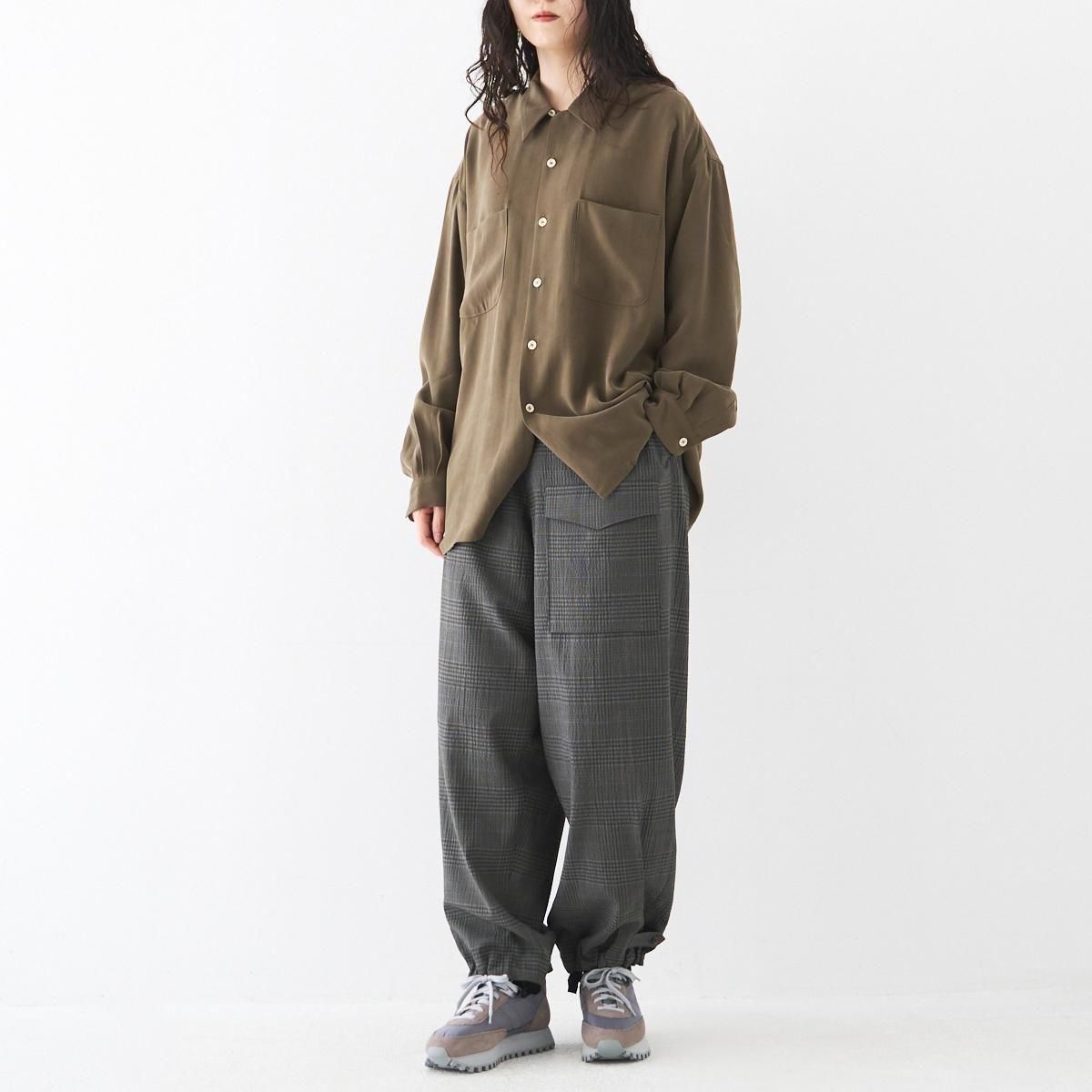 ゆったりとした履き心地の良いカーゴパンツ。 小柄な方も裾にボタン調節と紐での調節があるので、お好みで裾幅を変えてよりカーゴパンツっぽく着用いただけます。 ボリュームのあるシルエットですが、シャリ感のある薄手のウール生地なので、収まりが良く綺麗な印象に。シーズン問わずお使いいただける万能なパンツです。 size:1 ウエスト〜44cm(調整可能)/股上40.5cm/股下69cm/わたり43.5cm/裾幅〜28.5cm(調整可能) color:gray check material : wool98%,polyurethane2% model : 168cm 取り扱い店舗・・・dieci kyutaro店 2F size_chart ---------------------------------------------------- ippei takei/イッペイ タケイ レディースウェアを中心としたブランド。パターン、縫製など全てを自ら行うパンツの受注生産を経て2000年にスタートしました。コンセプトは男性のワードローブを女性に向けて開放すること。ユニセックスなアイテムを敢えて女性らしくアレンジしたり、コレクションごとにテーマを変えて展開されています。