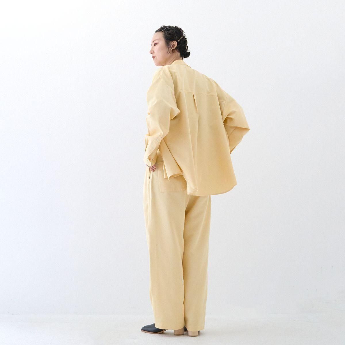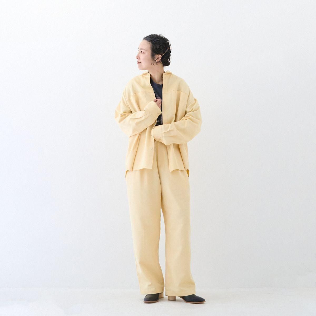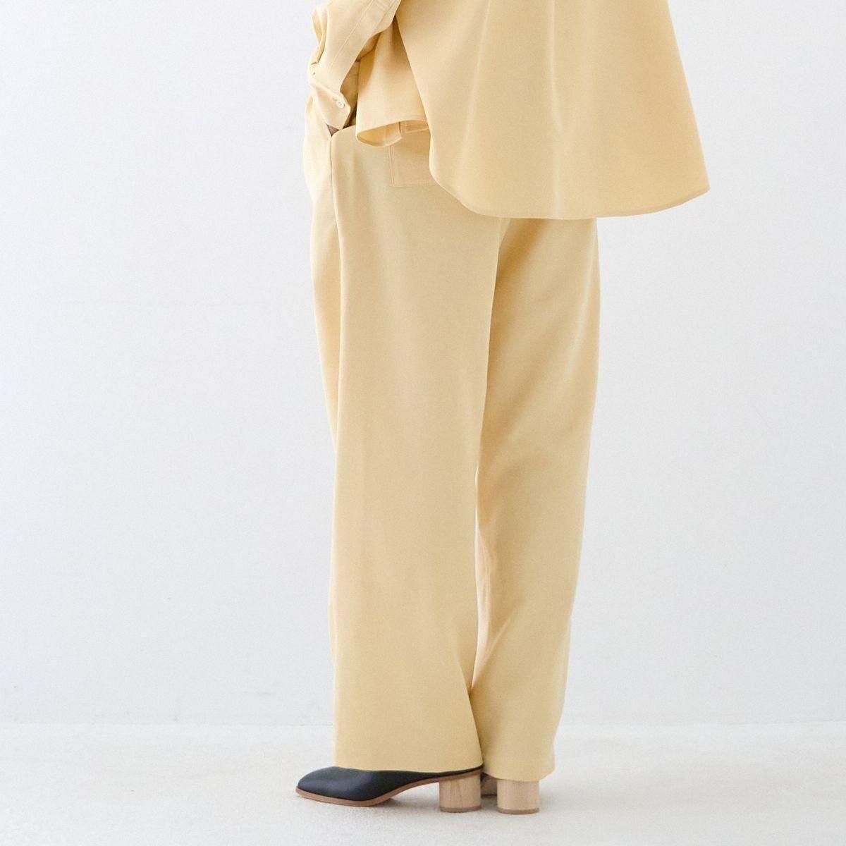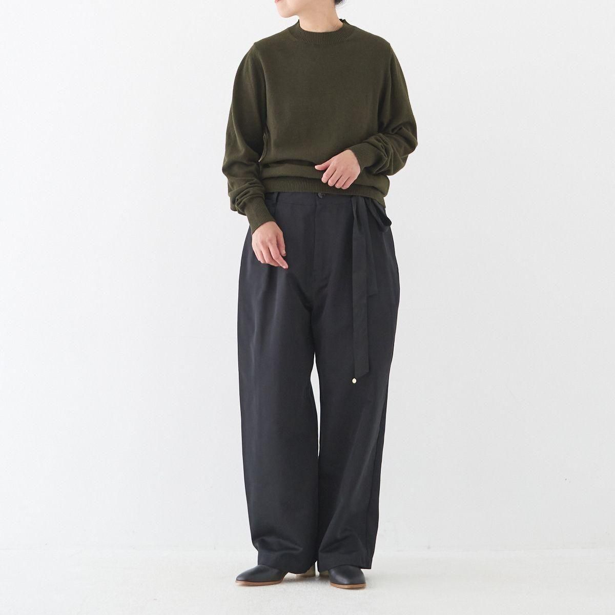 ワイドストレートのmen’s pantsは、リピートしてくださる方も多い人気のパンツ 今季はタテ糸にコットン、ヨコ糸にシルクを打った特殊なサテン生地を使いました。コットンとシルクを使ったサテン生地では、表面に見えるタテ糸にシルクを配することが多く、今回のようにコットンを主役に迎えた構成はとても珍しい試みです。脇役となったシルクがコットンのふかっとした表情を引き立て、なめらかな表面を覆う上品な艶が静かな華やかさを添える仕上がりになりました。 ウエストからすとんと落ちるゆとりのあるワイドなストレートシルエットで、フロントには2タックを配し、動きやすさとリラックス感を両立しています。後にはフラップポケットをあしらい、どこかワークパンツを思わせるディテールも魅力のひとつです。 ふっくらとした素材感は季節を問わず快適に穿いていただけます。 素材とシルエットのバランスにこだわった大人の日常にちょうど良いパンツです。 (オフィシャルサイトより引用) カラーはぬくもりを含んだ穏やかなegg、夜の気配を纏ったようなblackの2色をセレクトしました。men’s shirtとセットアップでもお楽しみください。 ※天然素材を使用しておりますため、織ムラやかすれ、フシやヨレによる不均一さ、 小さなほつれなどがある場合や、画像の色味や風合いと異なる場合もございます。 デリケートな素材もございますので、引っ掛けやひきつれにはご注意ください。 素材によって仕上がりに個体差が出ること、サイズ感、色、風合いについての特徴を、 天然素材ならではの良さとしてご理解の上、ご購入くださいますようお願いします。 color: egg, black size: M ウエスト44cm 股上33cm 股下66cm わたり37cm material: silk55% cotton45% お取り扱い店舗・・・dieci芝川ビル店 -------------------------------------------------------------- humoresque(ユーモレスク) デザイナー 渡辺由夏 編み機と人の手により、丁寧に時間をかけて編み立ててゆく工程は 機械と人との意識が共鳴し形を紡ぐリズムとなり、 ひとつの形が生まれてゆきます。 豊かな時間や美しさを感じられるニットを作りたいと思い、 humoresqueを始めました。 人は、年を重ねる毎に美しく、 柔らかくなってゆくのだと思います。 その魅力を、控えめながらも満足のゆく質感で表現し、 着る人と服が親密で在りたいと願っています。 沢山の時間を共有した服は、 いつの日か親友のような存在になるのではないかと、期待を込めて。 size_chart