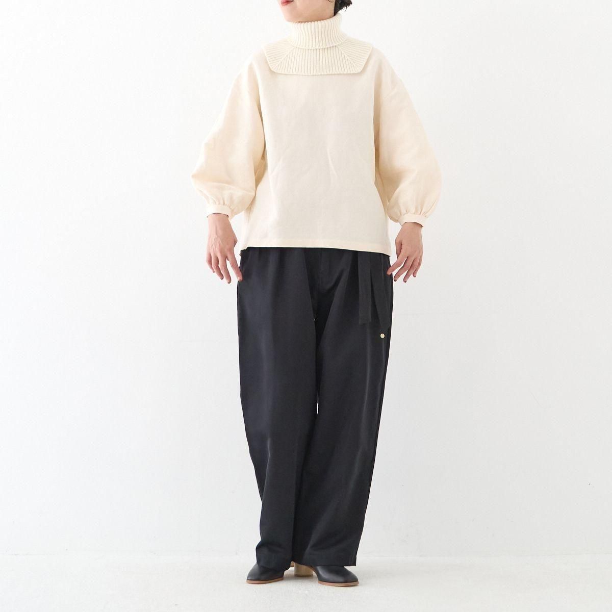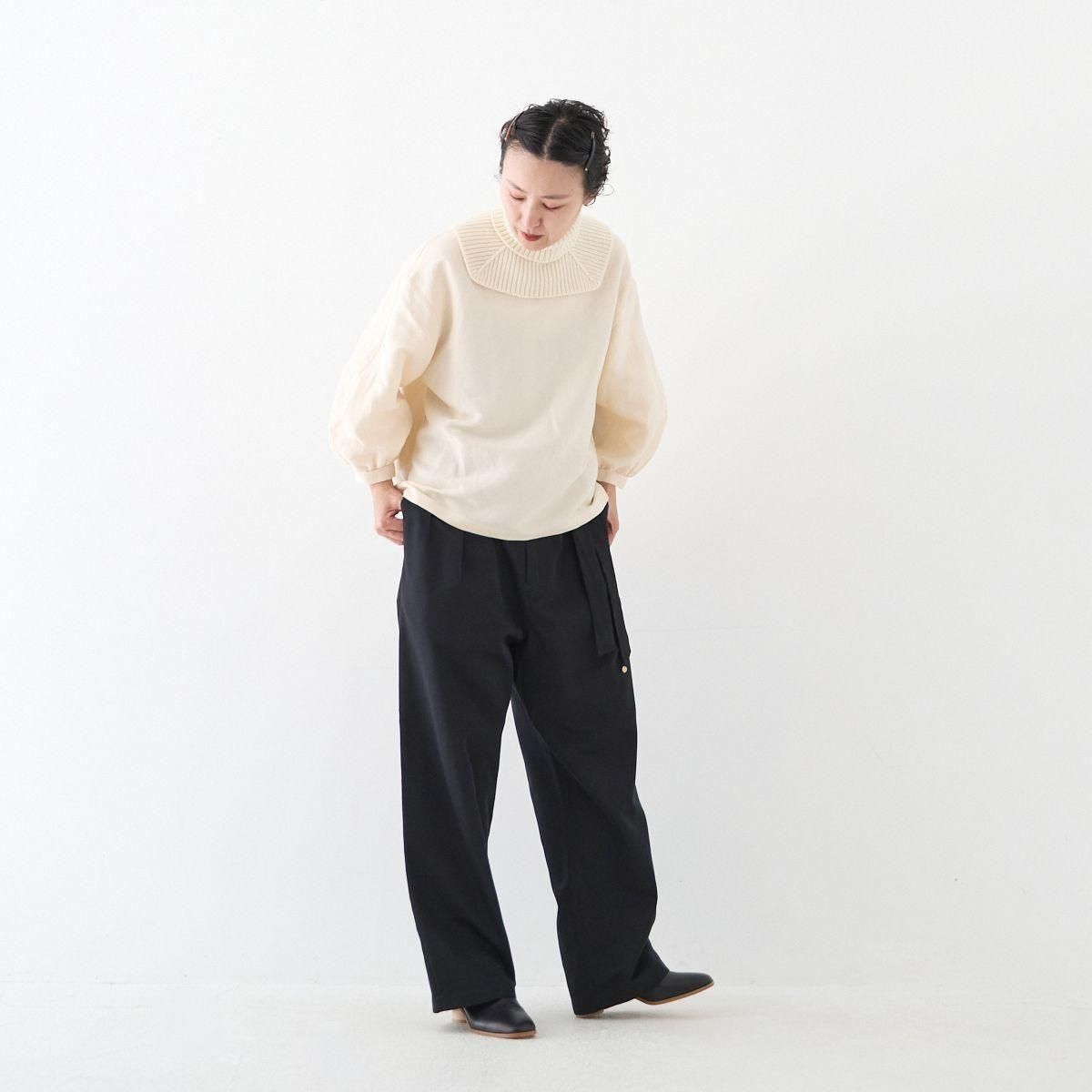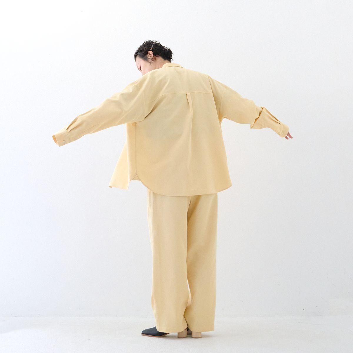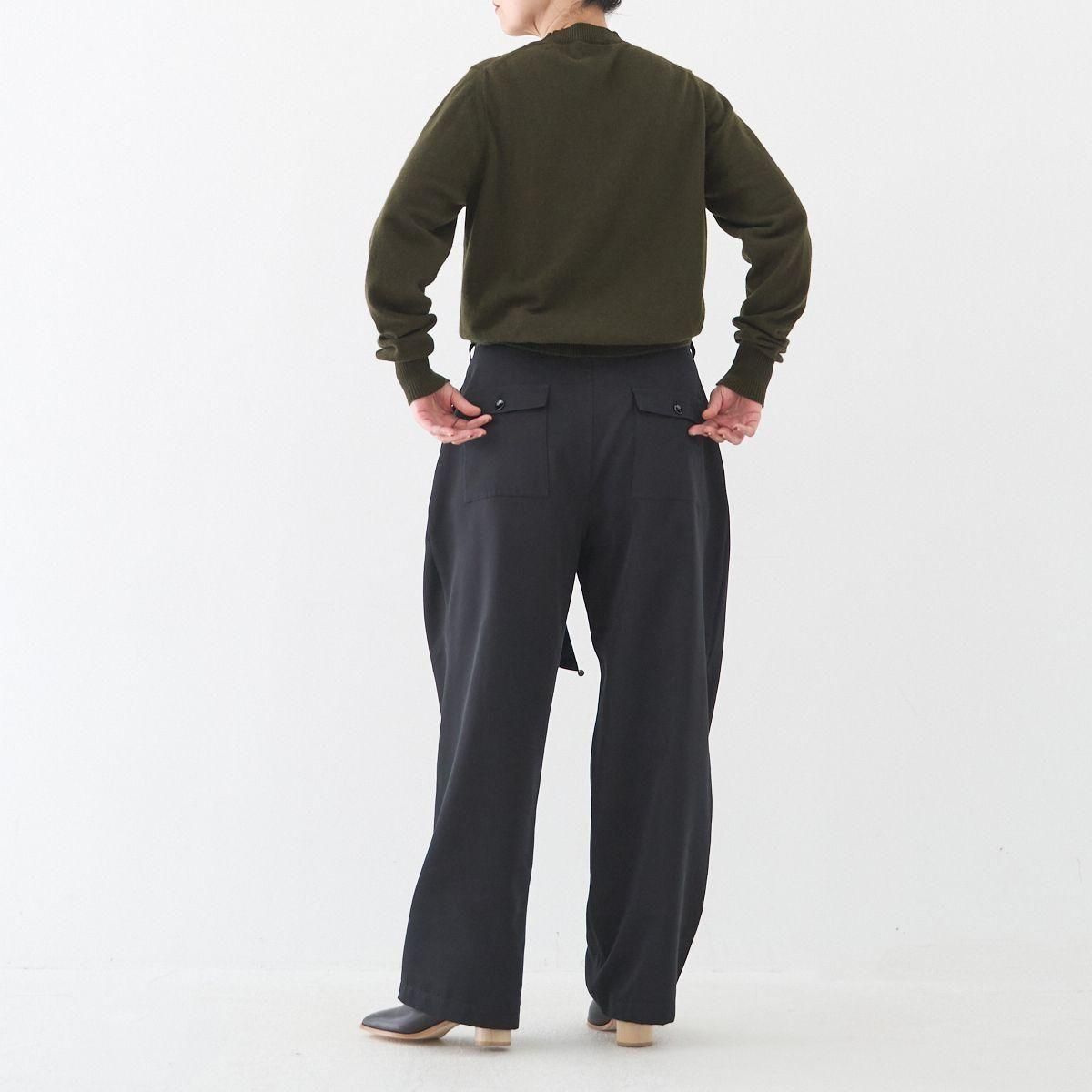 ワイドストレートのmen’s pantsは、リピートしてくださる方も多い人気のパンツ 今季はタテ糸にコットン、ヨコ糸にシルクを打った特殊なサテン生地を使いました。コットンとシルクを使ったサテン生地では、表面に見えるタテ糸にシルクを配することが多く、今回のようにコットンを主役に迎えた構成はとても珍しい試みです。脇役となったシルクがコットンのふかっとした表情を引き立て、なめらかな表面を覆う上品な艶が静かな華やかさを添える仕上がりになりました。 ウエストからすとんと落ちるゆとりのあるワイドなストレートシルエットで、フロントには2タックを配し、動きやすさとリラックス感を両立しています。後にはフラップポケットをあしらい、どこかワークパンツを思わせるディテールも魅力のひとつです。 ふっくらとした素材感は季節を問わず快適に穿いていただけます。 素材とシルエットのバランスにこだわった大人の日常にちょうど良いパンツです。 (オフィシャルサイトより引用) カラーはぬくもりを含んだ穏やかなegg、夜の気配を纏ったようなblackの2色をセレクトしました。men’s shirtとセットアップでもお楽しみください。 ※天然素材を使用しておりますため、織ムラやかすれ、フシやヨレによる不均一さ、 小さなほつれなどがある場合や、画像の色味や風合いと異なる場合もございます。 デリケートな素材もございますので、引っ掛けやひきつれにはご注意ください。 素材によって仕上がりに個体差が出ること、サイズ感、色、風合いについての特徴を、 天然素材ならではの良さとしてご理解の上、ご購入くださいますようお願いします。 color: egg, black size: M ウエスト44cm 股上33cm 股下66cm わたり37cm material: silk55% cotton45% お取り扱い店舗・・・dieci芝川ビル店 -------------------------------------------------------------- humoresque(ユーモレスク) デザイナー 渡辺由夏 編み機と人の手により、丁寧に時間をかけて編み立ててゆく工程は 機械と人との意識が共鳴し形を紡ぐリズムとなり、 ひとつの形が生まれてゆきます。 豊かな時間や美しさを感じられるニットを作りたいと思い、 humoresqueを始めました。 人は、年を重ねる毎に美しく、 柔らかくなってゆくのだと思います。 その魅力を、控えめながらも満足のゆく質感で表現し、 着る人と服が親密で在りたいと願っています。 沢山の時間を共有した服は、 いつの日か親友のような存在になるのではないかと、期待を込めて。 size_chart