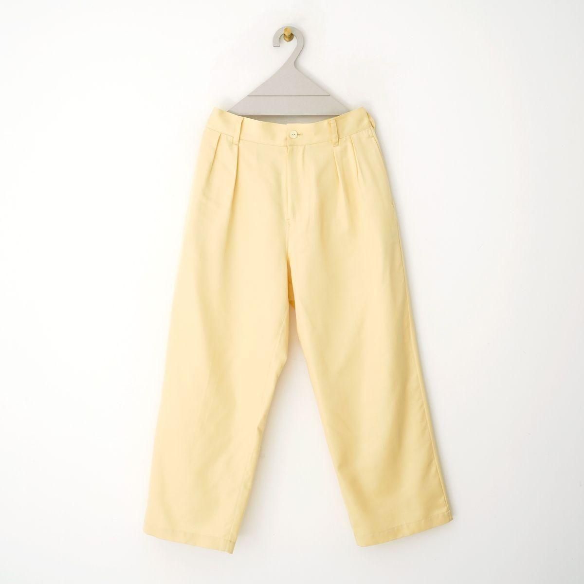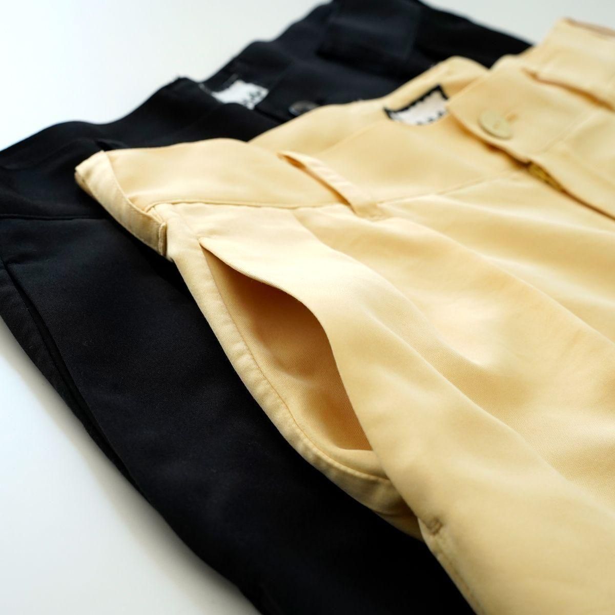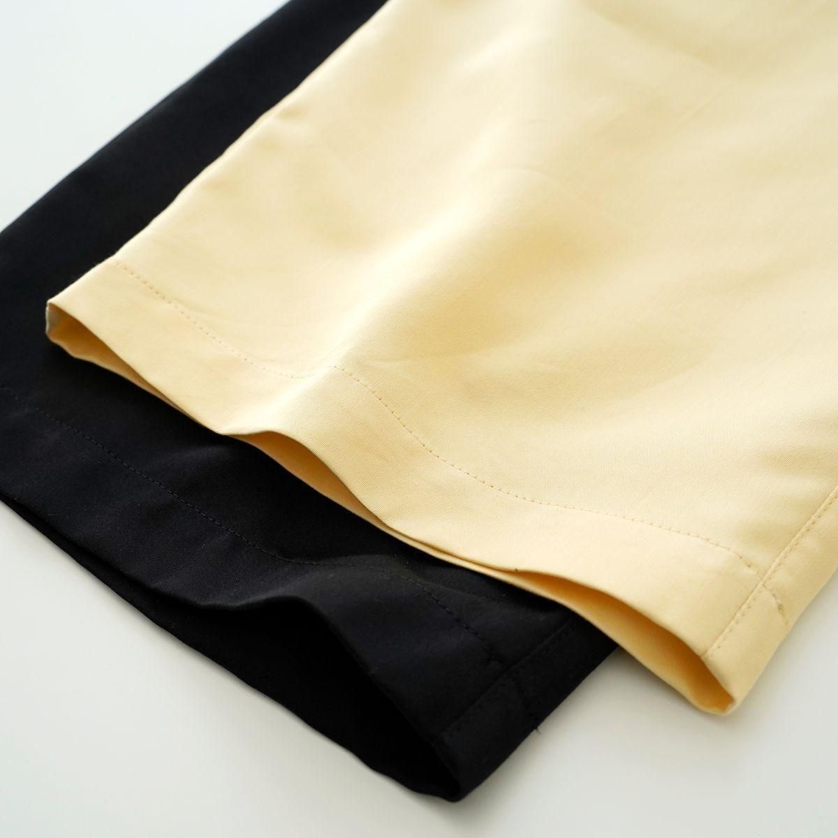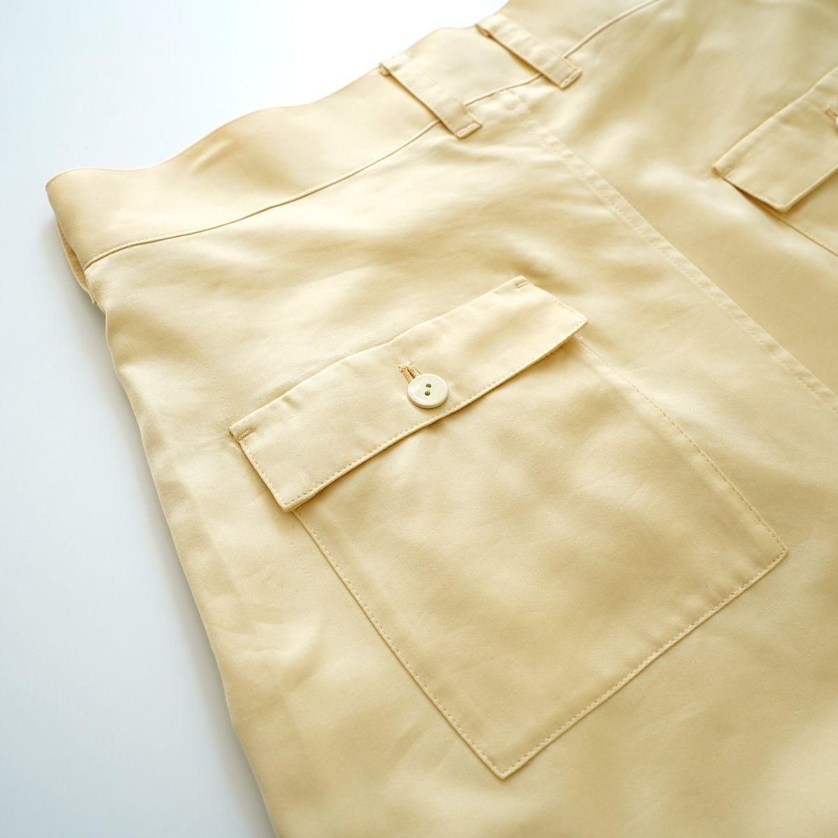 ワイドストレートのmen’s pantsは、リピートしてくださる方も多い人気のパンツ 今季はタテ糸にコットン、ヨコ糸にシルクを打った特殊なサテン生地を使いました。コットンとシルクを使ったサテン生地では、表面に見えるタテ糸にシルクを配することが多く、今回のようにコットンを主役に迎えた構成はとても珍しい試みです。脇役となったシルクがコットンのふかっとした表情を引き立て、なめらかな表面を覆う上品な艶が静かな華やかさを添える仕上がりになりました。 ウエストからすとんと落ちるゆとりのあるワイドなストレートシルエットで、フロントには2タックを配し、動きやすさとリラックス感を両立しています。後にはフラップポケットをあしらい、どこかワークパンツを思わせるディテールも魅力のひとつです。 ふっくらとした素材感は季節を問わず快適に穿いていただけます。 素材とシルエットのバランスにこだわった大人の日常にちょうど良いパンツです。 (オフィシャルサイトより引用) カラーはぬくもりを含んだ穏やかなegg、夜の気配を纏ったようなblackの2色をセレクトしました。men’s shirtとセットアップでもお楽しみください。 ※天然素材を使用しておりますため、織ムラやかすれ、フシやヨレによる不均一さ、 小さなほつれなどがある場合や、画像の色味や風合いと異なる場合もございます。 デリケートな素材もございますので、引っ掛けやひきつれにはご注意ください。 素材によって仕上がりに個体差が出ること、サイズ感、色、風合いについての特徴を、 天然素材ならではの良さとしてご理解の上、ご購入くださいますようお願いします。 color: egg, black size: M ウエスト44cm 股上33cm 股下66cm わたり37cm material: silk55% cotton45% お取り扱い店舗・・・dieci芝川ビル店 -------------------------------------------------------------- humoresque(ユーモレスク) デザイナー 渡辺由夏 編み機と人の手により、丁寧に時間をかけて編み立ててゆく工程は 機械と人との意識が共鳴し形を紡ぐリズムとなり、 ひとつの形が生まれてゆきます。 豊かな時間や美しさを感じられるニットを作りたいと思い、 humoresqueを始めました。 人は、年を重ねる毎に美しく、 柔らかくなってゆくのだと思います。 その魅力を、控えめながらも満足のゆく質感で表現し、 着る人と服が親密で在りたいと願っています。 沢山の時間を共有した服は、 いつの日か親友のような存在になるのではないかと、期待を込めて。 size_chart