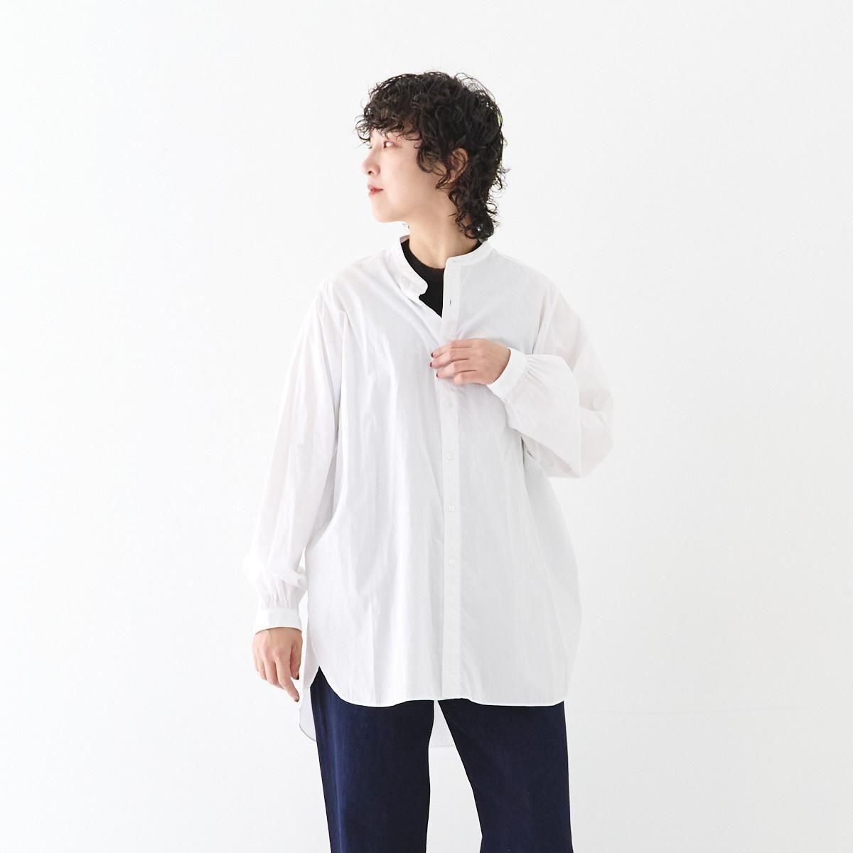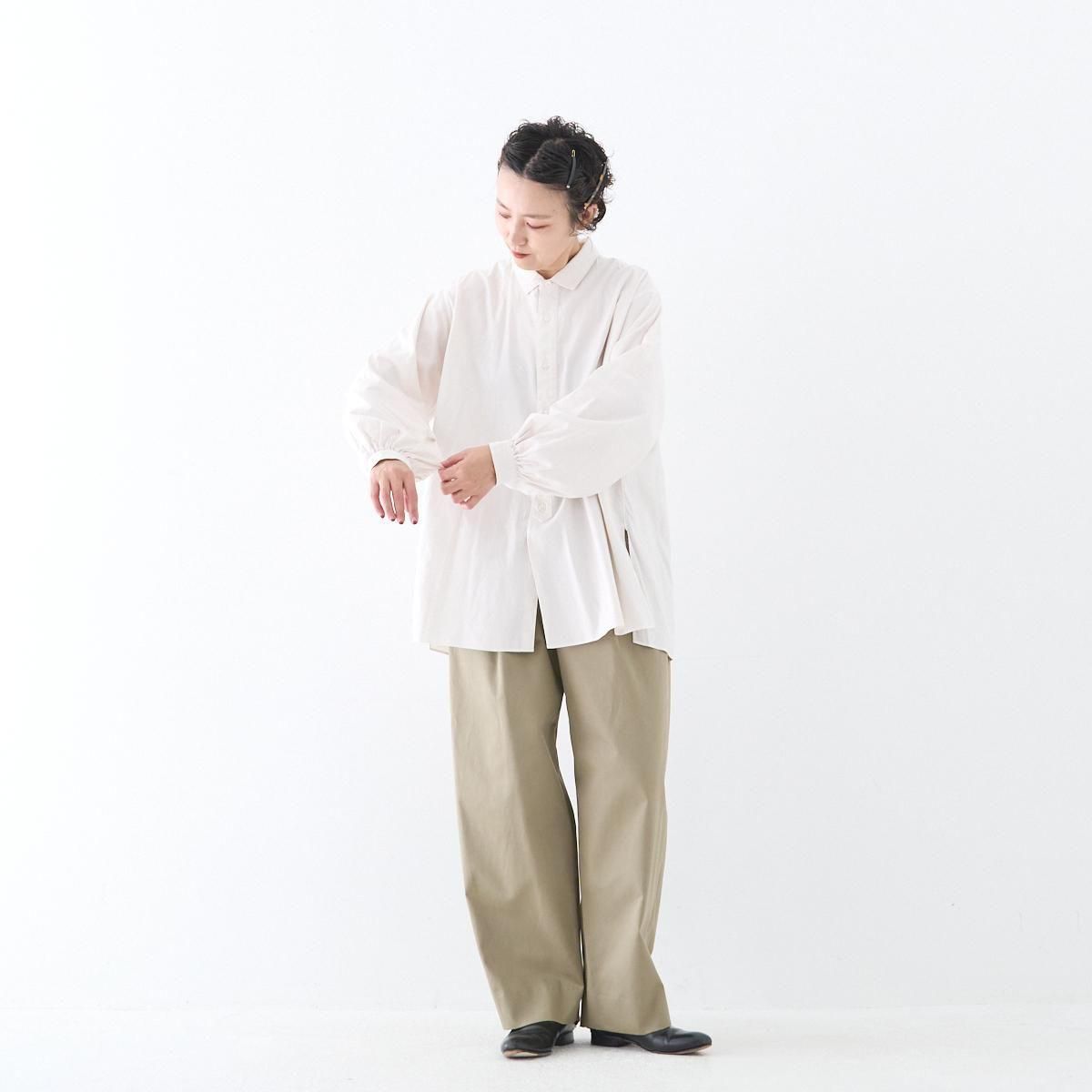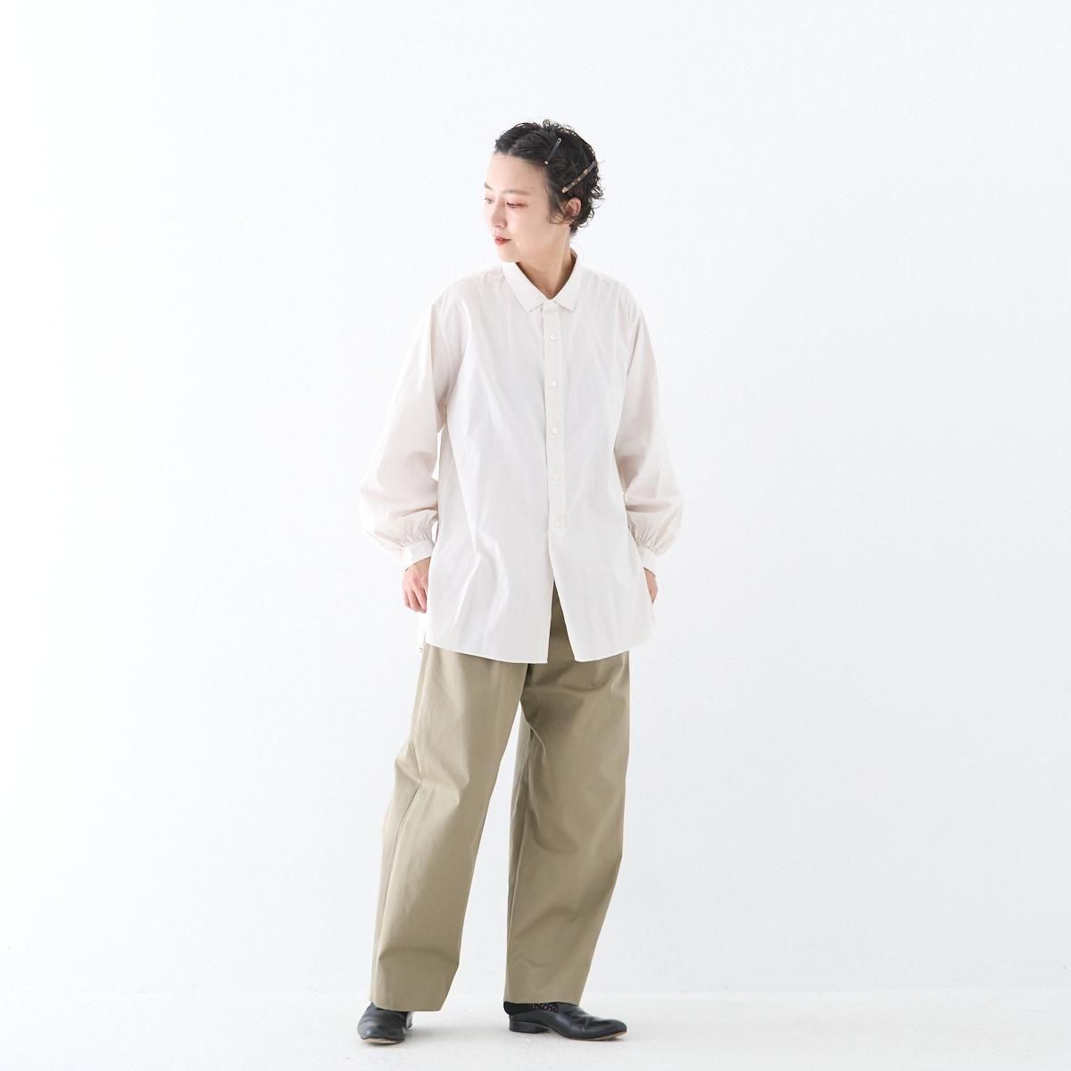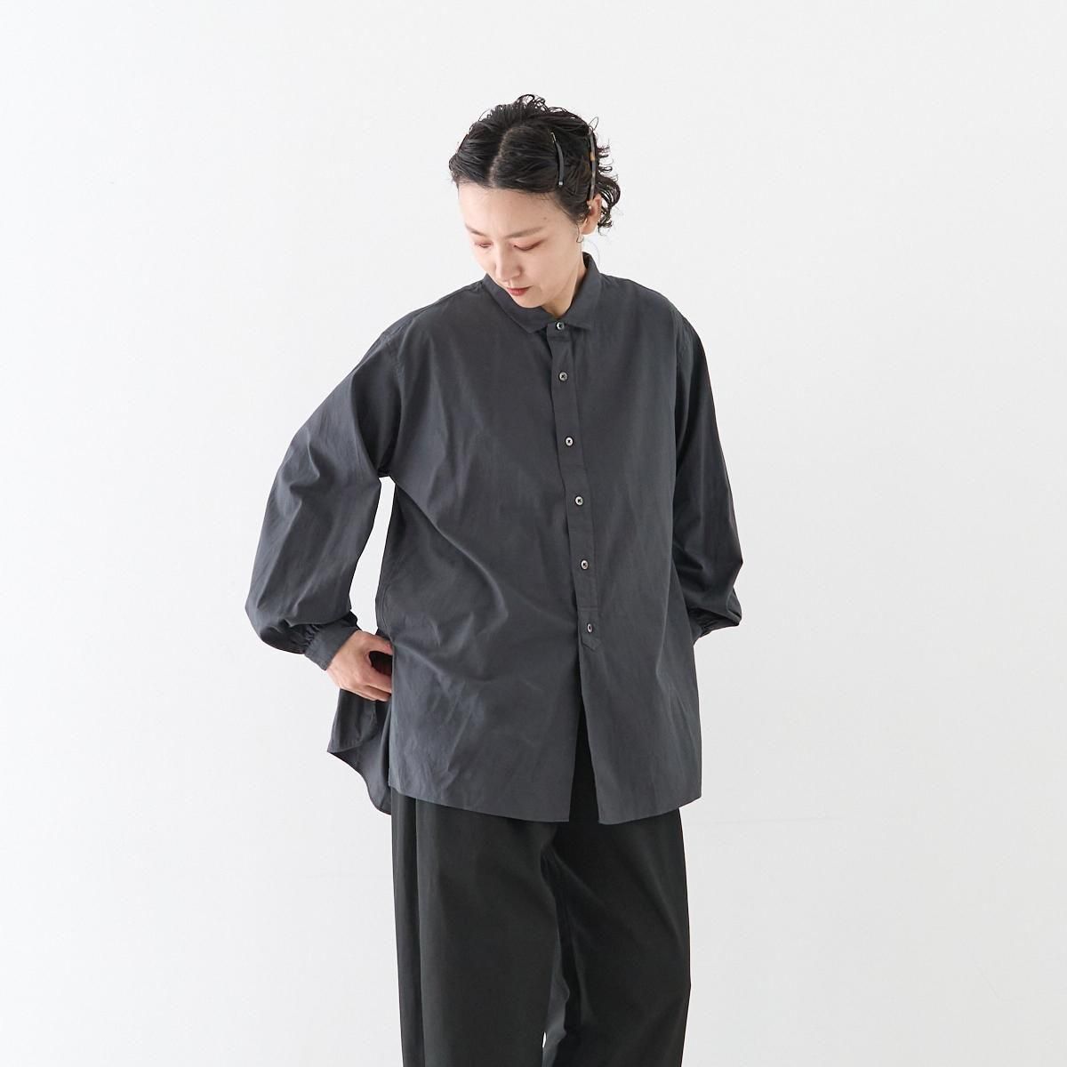 ◇organic cotton shritシリーズ 40番単糸のオーソドックスなオックスフォード生地ですが、オーガニックコットンを甘撚りにし、旧式のシャトル織機で織ることで、丈夫ながら、柔らかい素材になっています。 縫製は、とても細かなステッチが特徴で、脇の縫い代も細く、手の込んだ繊細な印象になっています。 型紙は、20世紀初頭のシャツを参考にしていて、今の服にはない、ゆるい雰囲気があります。 インナーのレイヤードやベストなど合わせたりとシーズンレスでお召しいただける1枚です。 size : F 着丈66cm(+6) / 身幅60cm / 肩幅49cm / 袖丈55cm color:SAXEBLUE,VINTAGEWHITE,CHARCOAL,BLACK material:ORGANIC COTTON100% □お洗濯は手洗いをおすすめします。 □素材の特性上 織りムラや織り段、ネップなどが見られますが 天然素材による風合いとしてお楽しみください。 □ご覧頂く環境により実物の色は画像と微妙に異なる場合がございます。 □製品の仕上げ加工等により実物のサイズは表示と若干異なる場合がございます。 model:163cm(SAXEBLUE,VINTAGEWHITE,CHARCOAL着用) お取り扱い店舗・・・ dieci芝川ビル店 -------------------------------------------------------- ŠP/エシュペー 2022年にスタートしたブランド。ブランド名のŠP は「幸福の製品」を意味する 言葉の頭文字です。 19 世紀頃のヴィンテージの衣服や民族衣装などのディテールを取り入れつつ、 着心地やスタイルは今を生きる人のことを考え、 私たちの生活になじむ形となっています。 企画から製造までの多くを日本国内でおこなっており、繊細なディテールと丁寧な素材作りのため、作り手の方との親密で正確なやりとりを大切にしています。