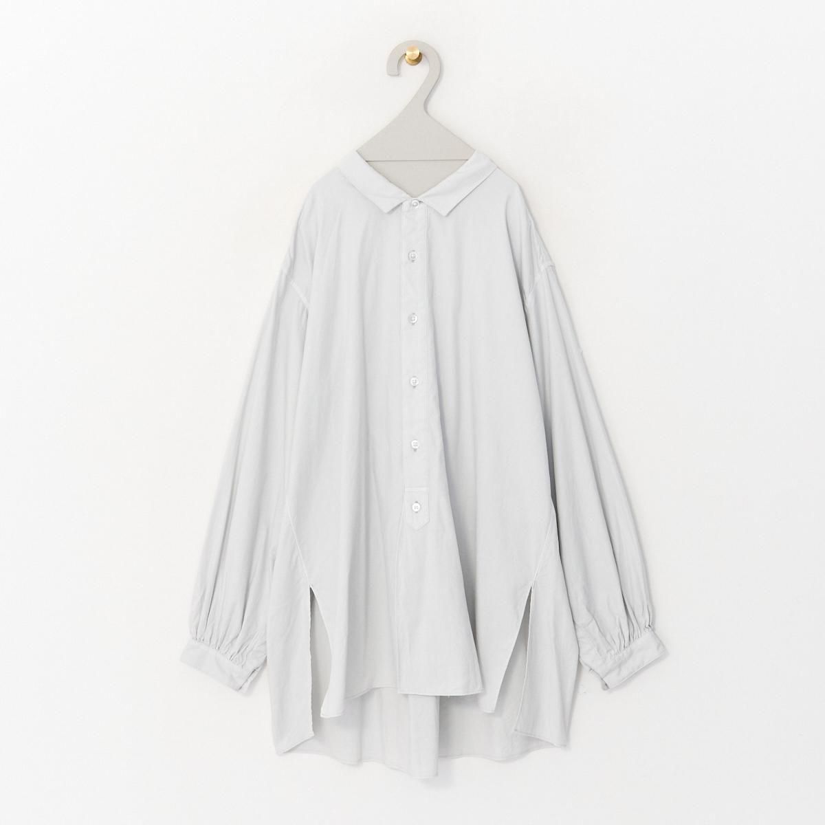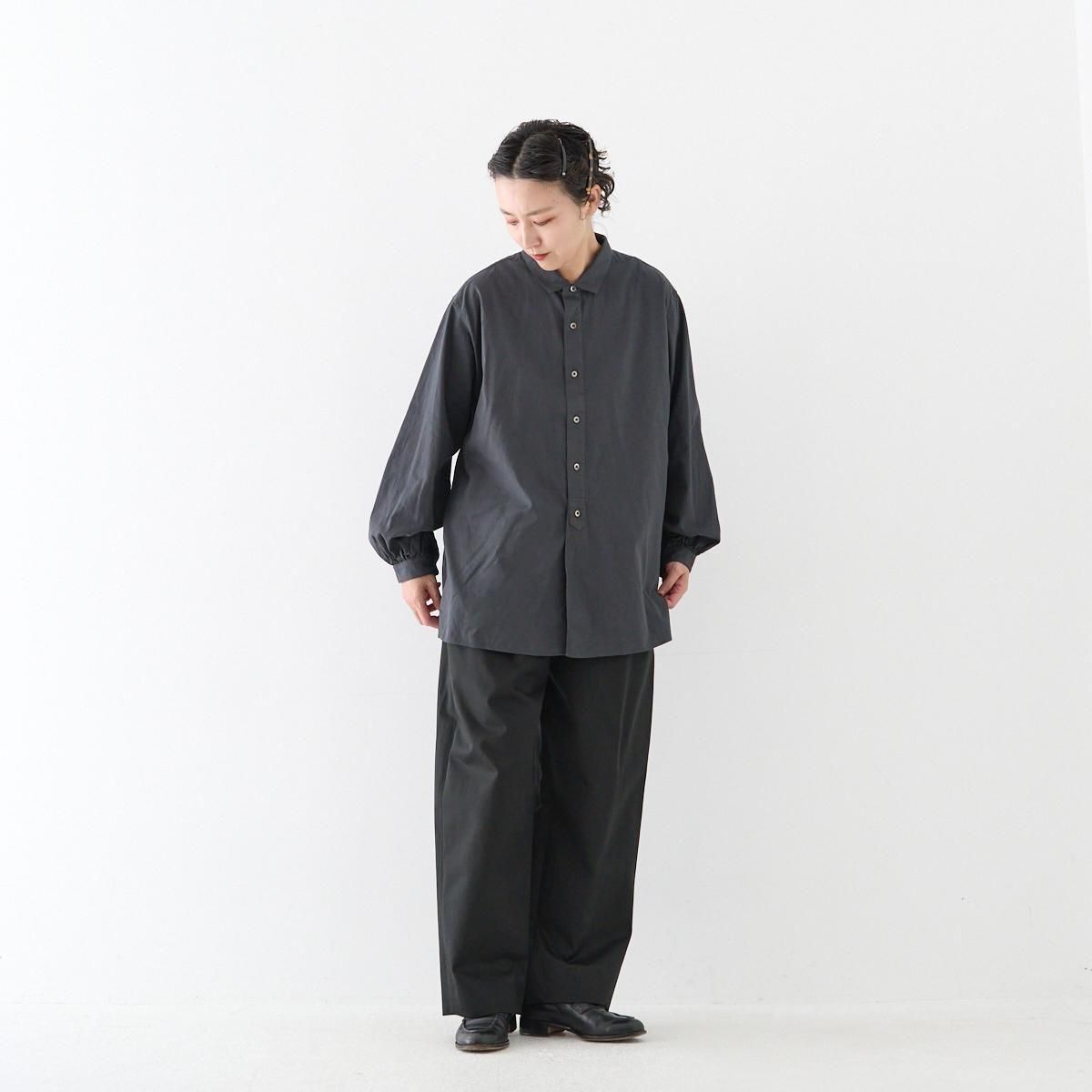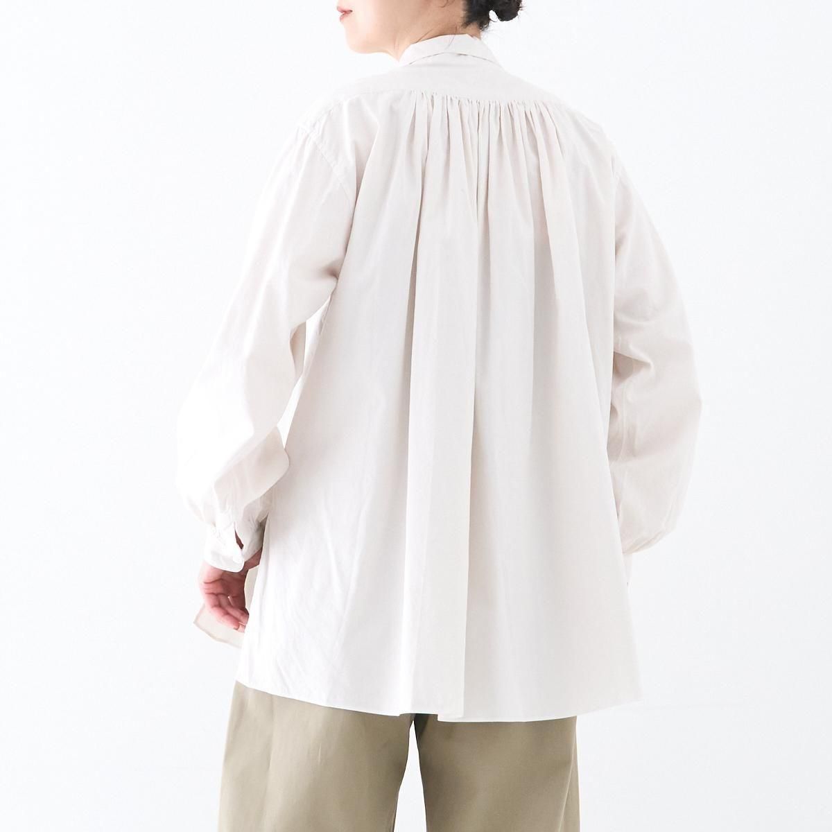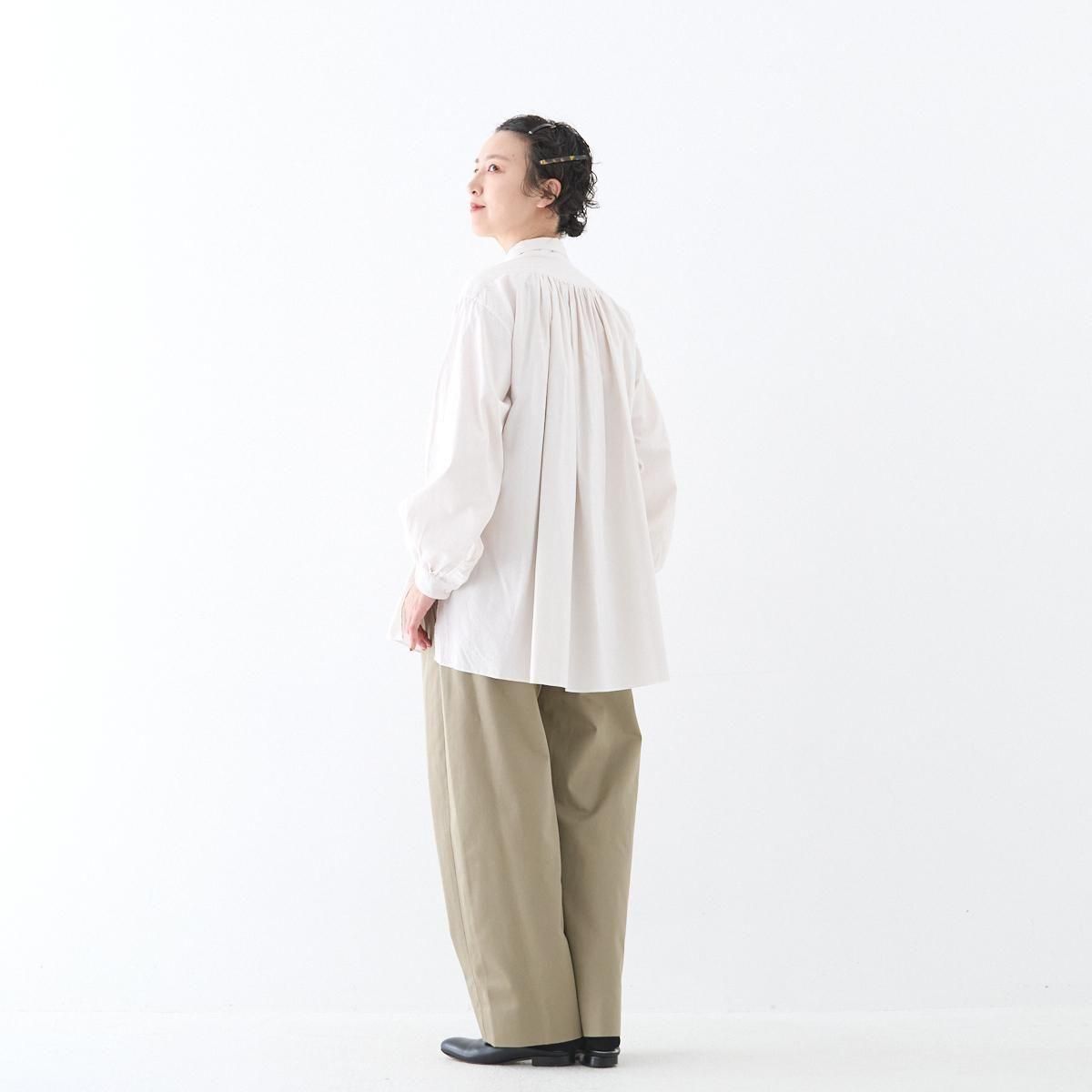 ◇organic cotton shritシリーズ 40番単糸のオーソドックスなオックスフォード生地ですが、オーガニックコットンを甘撚りにし、旧式のシャトル織機で織ることで、丈夫ながら、柔らかい素材になっています。 縫製は、とても細かなステッチが特徴で、脇の縫い代も細く、手の込んだ繊細な印象になっています。 型紙は、20世紀初頭のシャツを参考にしていて、今の服にはない、ゆるい雰囲気があります。 インナーのレイヤードやベストなど合わせたりとシーズンレスでお召しいただける1枚です。 size : F 着丈66cm(+6) / 身幅60cm / 肩幅49cm / 袖丈55cm color:SAXEBLUE,VINTAGEWHITE,CHARCOAL,BLACK material:ORGANIC COTTON100% □お洗濯は手洗いをおすすめします。 □素材の特性上 織りムラや織り段、ネップなどが見られますが 天然素材による風合いとしてお楽しみください。 □ご覧頂く環境により実物の色は画像と微妙に異なる場合がございます。 □製品の仕上げ加工等により実物のサイズは表示と若干異なる場合がございます。 model:163cm(SAXEBLUE,VINTAGEWHITE,CHARCOAL着用) お取り扱い店舗・・・ dieci芝川ビル店 -------------------------------------------------------- ŠP/エシュペー 2022年にスタートしたブランド。ブランド名のŠP は「幸福の製品」を意味する 言葉の頭文字です。 19 世紀頃のヴィンテージの衣服や民族衣装などのディテールを取り入れつつ、 着心地やスタイルは今を生きる人のことを考え、 私たちの生活になじむ形となっています。 企画から製造までの多くを日本国内でおこなっており、繊細なディテールと丁寧な素材作りのため、作り手の方との親密で正確なやりとりを大切にしています。