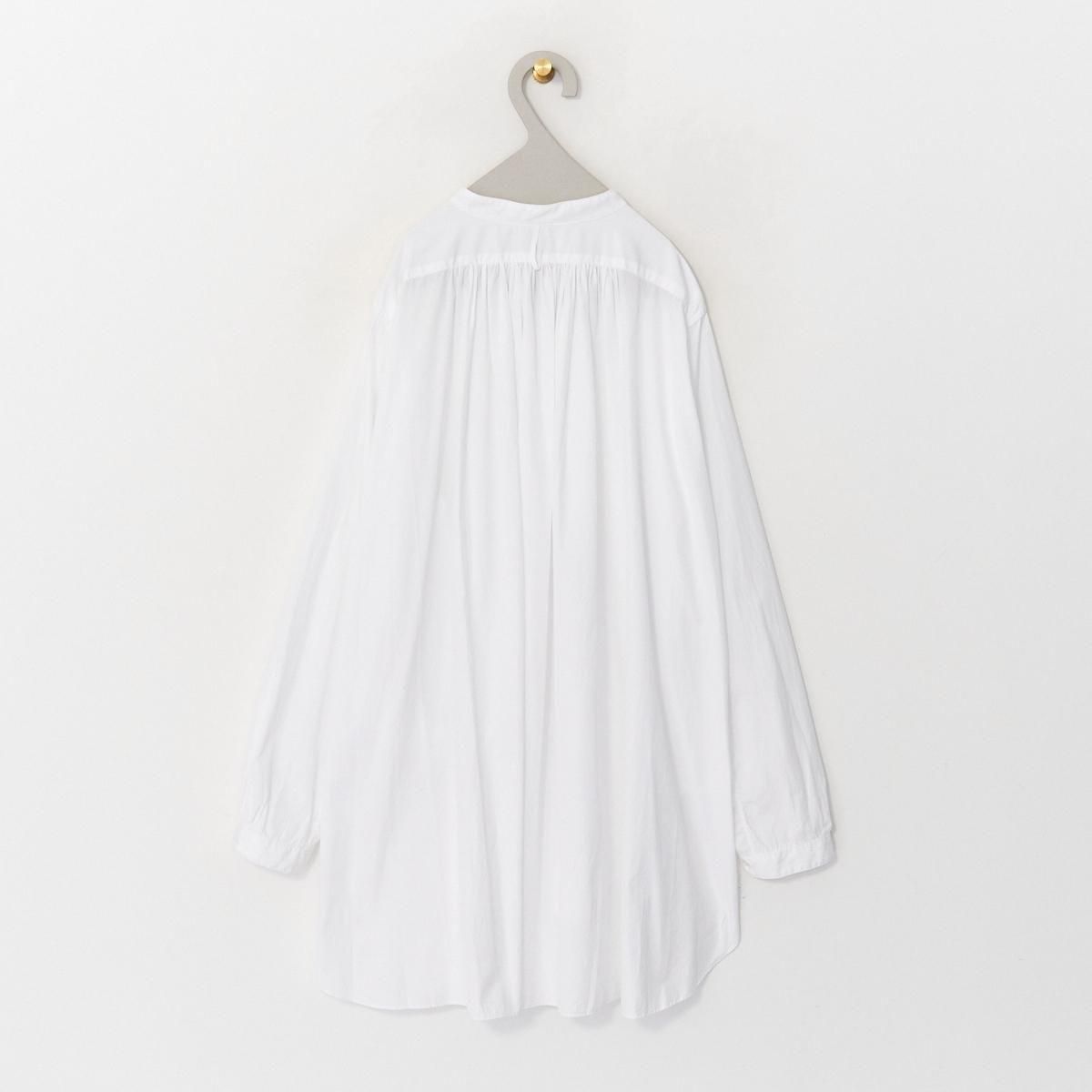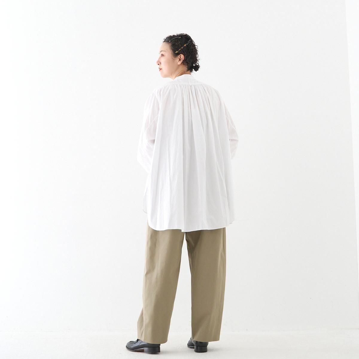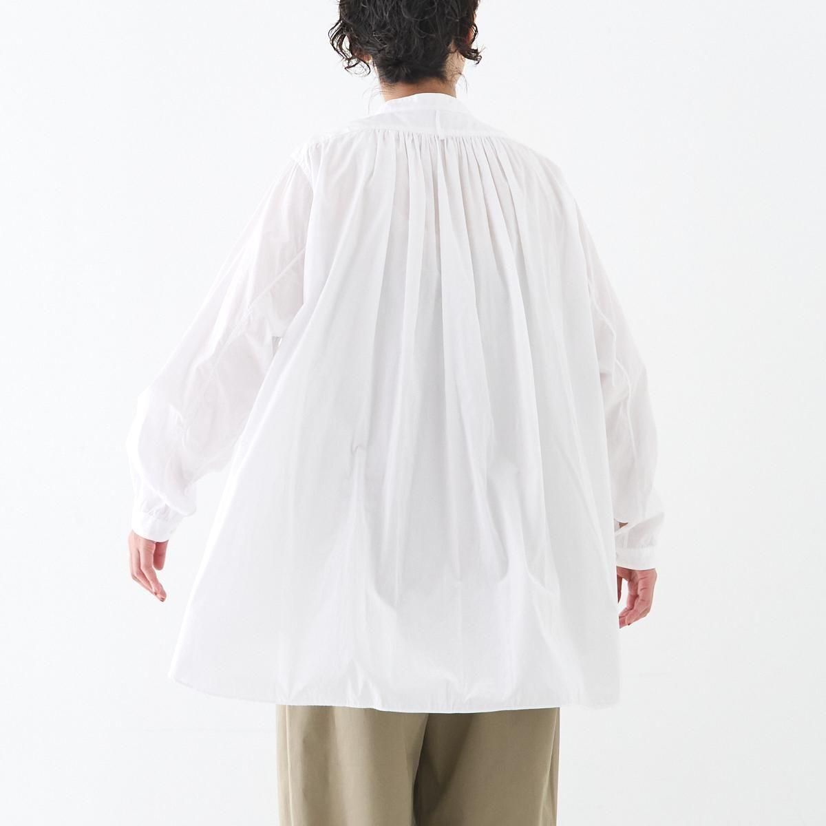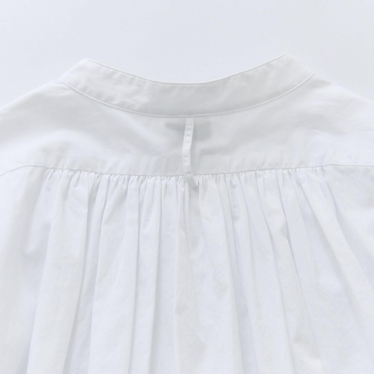 縦170/2横糸80/1のブロード生地で作られたバンドカラーシャツ。とても細い糸を縦糸に使用し、シャトル織機でゆっくりと織られとても滑らかで上品な印象の仕上がりです。 前から見た時のすっきりとした印象と後の細やかなギャザーとの表情の違いや、前後差のある着丈のバランスも美しい一着です。サラッとシンプルに着ても様になり、重ね着もしやすい生地感です。 size : F 着丈68(+7)cm,身幅62cm,肩幅43cm,袖59cm color:WHITE material:COTTON100% □お洗濯は手洗いをおすすめします。 □素材の特性上 織りムラや織り段、ネップなどが見られますが 天然素材による風合いとしてお楽しみください。 □ご覧頂く環境により実物の色は画像と微妙に異なる場合がございます。 □製品の仕上げ加工等により実物のサイズは表示と若干異なる場合がございます。 model:163cm お取り扱い店舗・・・ dieci芝川ビル店 -------------------------------------------------------- ŠP/エシュペー 2022年にスタートしたブランド。ブランド名のŠP は「幸福の製品」を意味する 言葉の頭文字です。 19 世紀頃のヴィンテージの衣服や民族衣装などのディテールを取り入れつつ、 着心地やスタイルは今を生きる人のことを考え、 私たちの生活になじむ形となっています。 企画から製造までの多くを日本国内でおこなっており、繊細なディテールと丁寧な素材作りのため、作り手の方との親密で正確なやりとりを大切にしています。