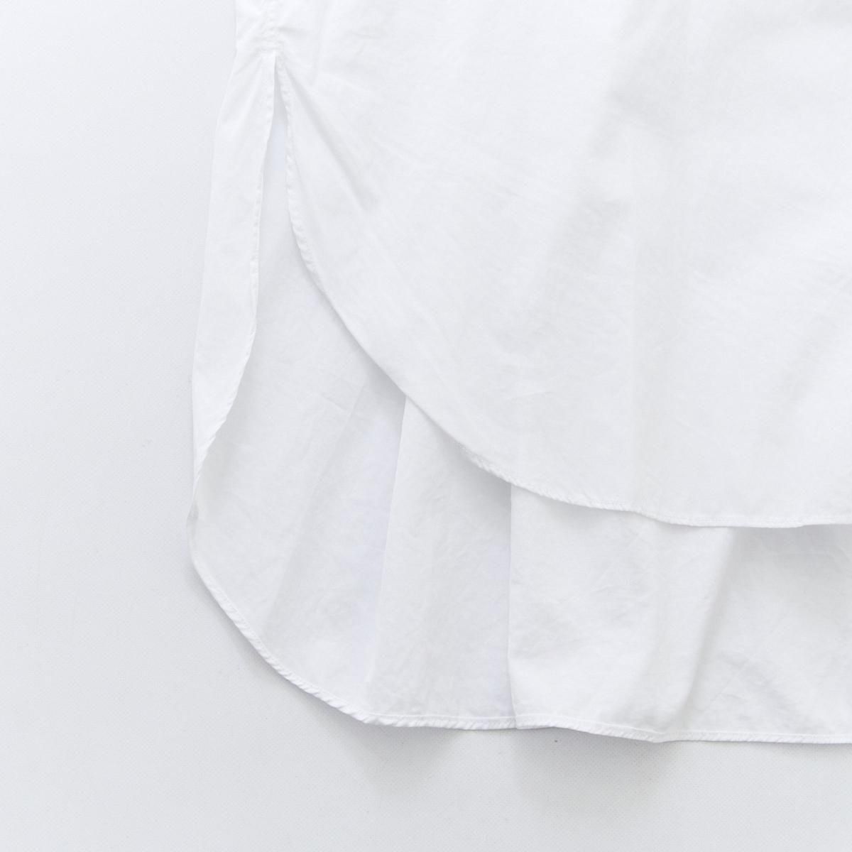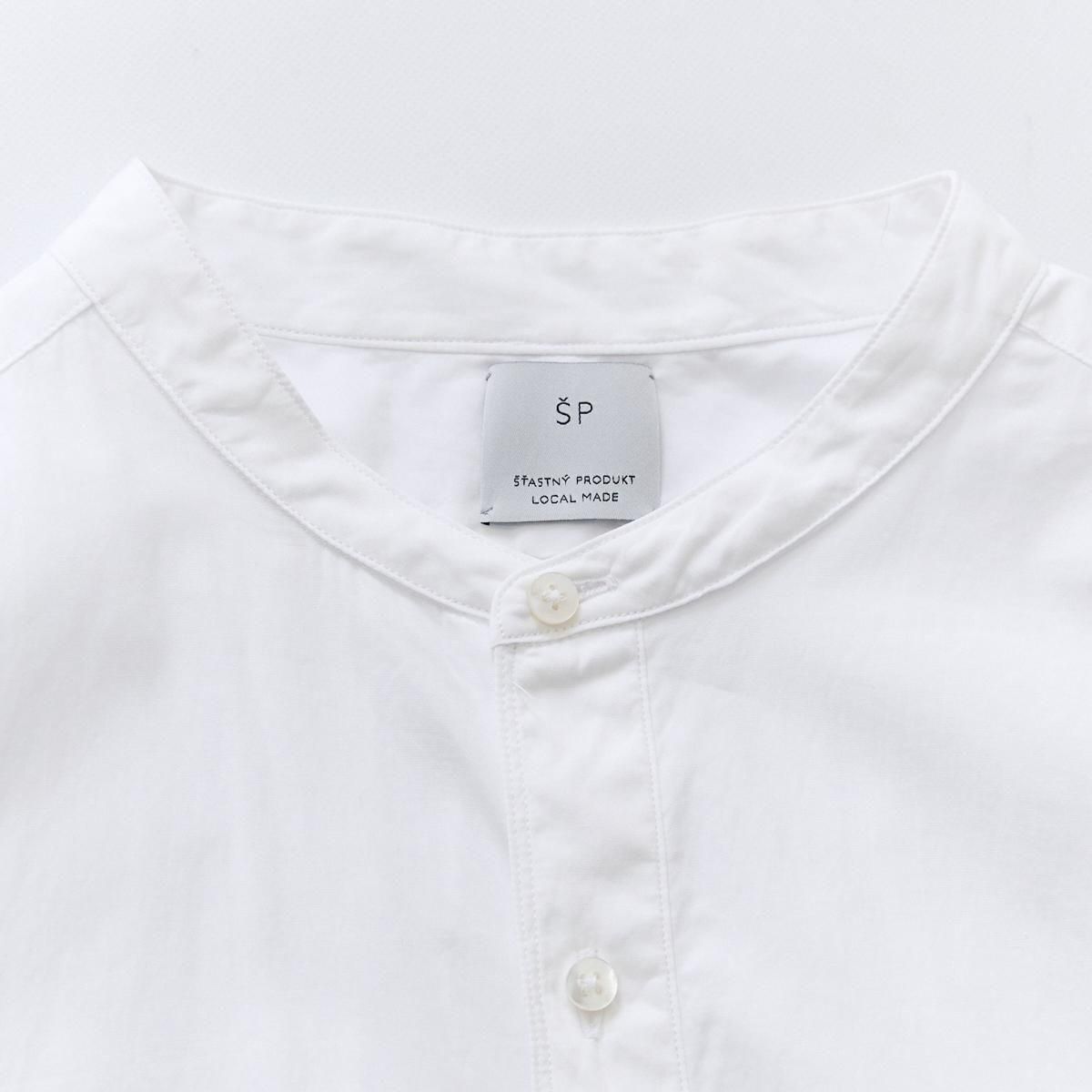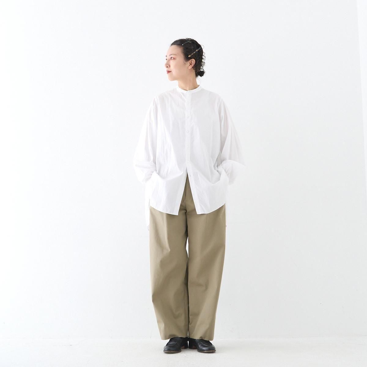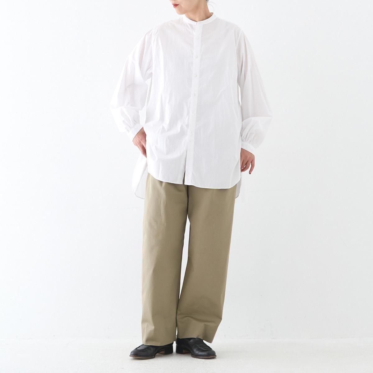 縦170/2横糸80/1のブロード生地で作られたバンドカラーシャツ。とても細い糸を縦糸に使用し、シャトル織機でゆっくりと織られとても滑らかで上品な印象の仕上がりです。 前から見た時のすっきりとした印象と後の細やかなギャザーとの表情の違いや、前後差のある着丈のバランスも美しい一着です。サラッとシンプルに着ても様になり、重ね着もしやすい生地感です。 size : F 着丈68(+7)cm,身幅62cm,肩幅43cm,袖59cm color:WHITE material:COTTON100% □お洗濯は手洗いをおすすめします。 □素材の特性上 織りムラや織り段、ネップなどが見られますが 天然素材による風合いとしてお楽しみください。 □ご覧頂く環境により実物の色は画像と微妙に異なる場合がございます。 □製品の仕上げ加工等により実物のサイズは表示と若干異なる場合がございます。 model:163cm お取り扱い店舗・・・ dieci芝川ビル店 -------------------------------------------------------- ŠP/エシュペー 2022年にスタートしたブランド。ブランド名のŠP は「幸福の製品」を意味する 言葉の頭文字です。 19 世紀頃のヴィンテージの衣服や民族衣装などのディテールを取り入れつつ、 着心地やスタイルは今を生きる人のことを考え、 私たちの生活になじむ形となっています。 企画から製造までの多くを日本国内でおこなっており、繊細なディテールと丁寧な素材作りのため、作り手の方との親密で正確なやりとりを大切にしています。