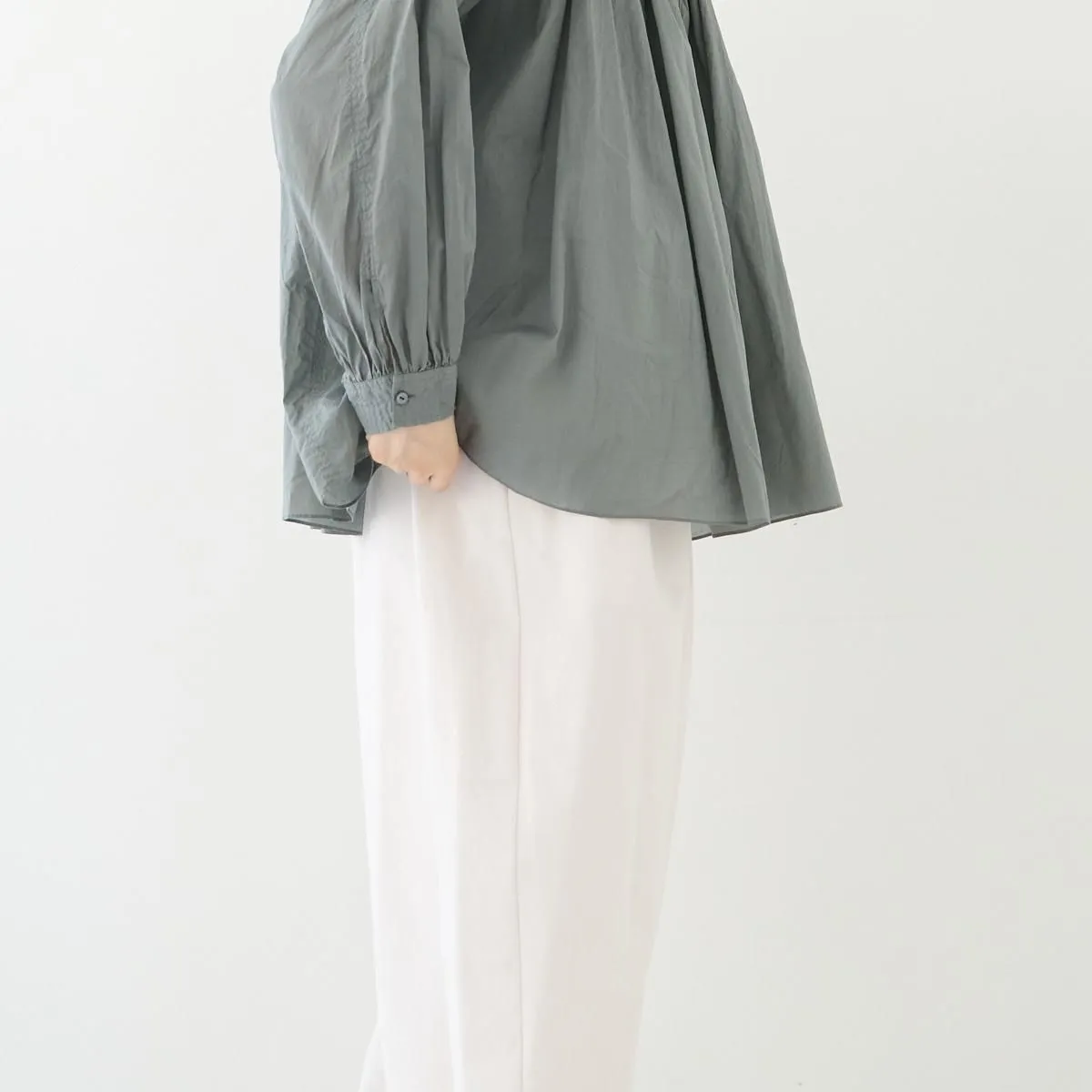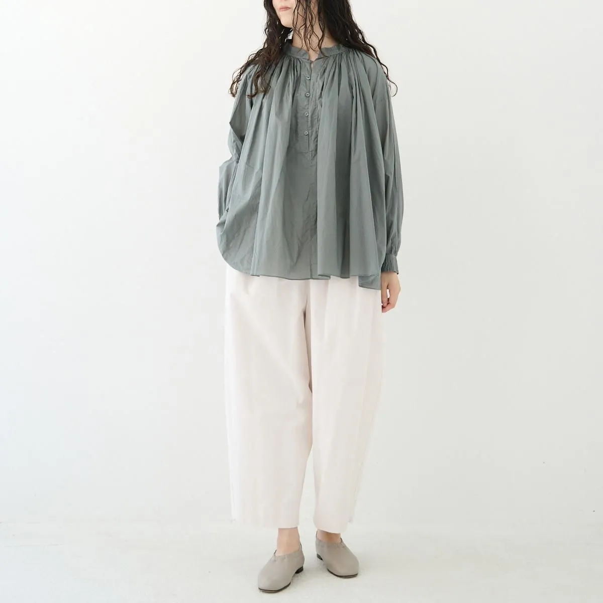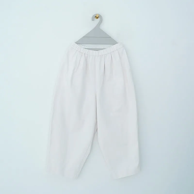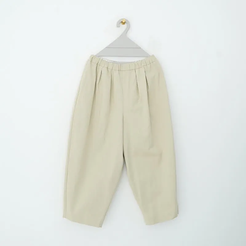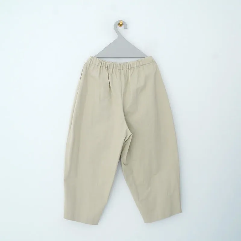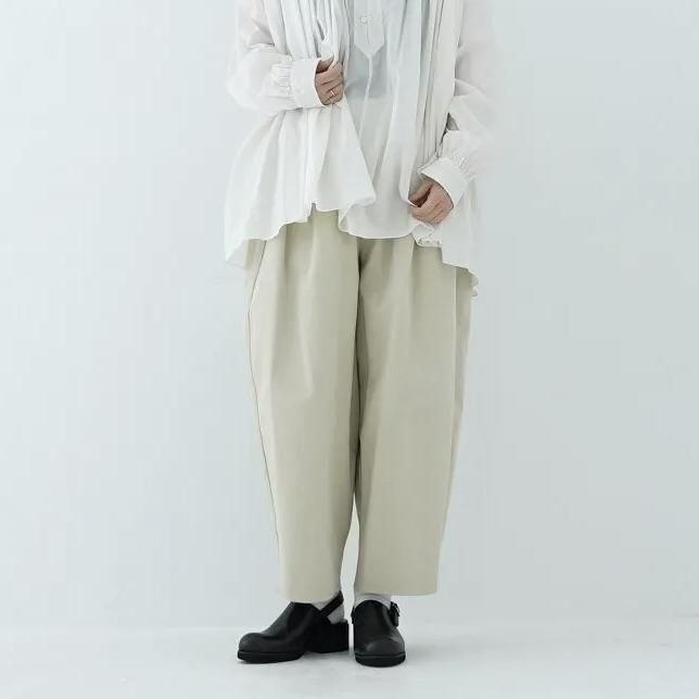 ヴィンテージのフランス軍のチノクロスを参考に生地を作成し、シルエットのボリュームに対して、適応しやすいよう滑らかに改良が加えられ、肌触りも良くなりました。 ヒップからわたりにゆとりがあり、フロントにタックが、二つ。裾にかけてキュッと絞ったシルエットが、とてもきれいな定番トラウザーです。 ヒップ周りにかなりのゆとりがありますが、オリジナルのチノクロスは、長年はき込まれたように柔らかく落ち感がありすっきりとした印象です。 スカートを履くような感覚でリラックス感があり、合わせるトップスも問いません。 size:0/1 0:ウエスト~37cm/股上41.5cm/股下55.5cm/わたり39.5cm/裾幅23cm 1:ウエスト~38cm/股上44cm/股下57cm/わたり43cm/裾幅23.5cm ※サイズ計測の多少の誤差はご了承下さい。 color:WHITE・LIGHT BEIGE・BLACK material:COTTON 100% model:168cm(#1着用)158cm(#0 着用) お取り扱い店舗・・・dieci芝川ビル店 -------------------------------------------------------- ŠP/エシュペー 2022年にスタートしたブランド。ブランド名のŠP は「幸福の製品」を意味する 言葉の頭文字です。 19 世紀頃のヴィンテージの衣服や民族衣装などのディテールを取り入れつつ、 着心地やスタイルは今を生きる人のことを考え、 私たちの生活になじむ形となっています。 企画から製造までの多くを日本国内でおこなっており、繊細なディテールと丁寧な素材作りのため、作り手の方との親密で正確なやりとりを大切にしています。