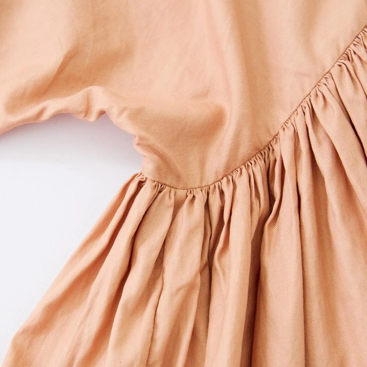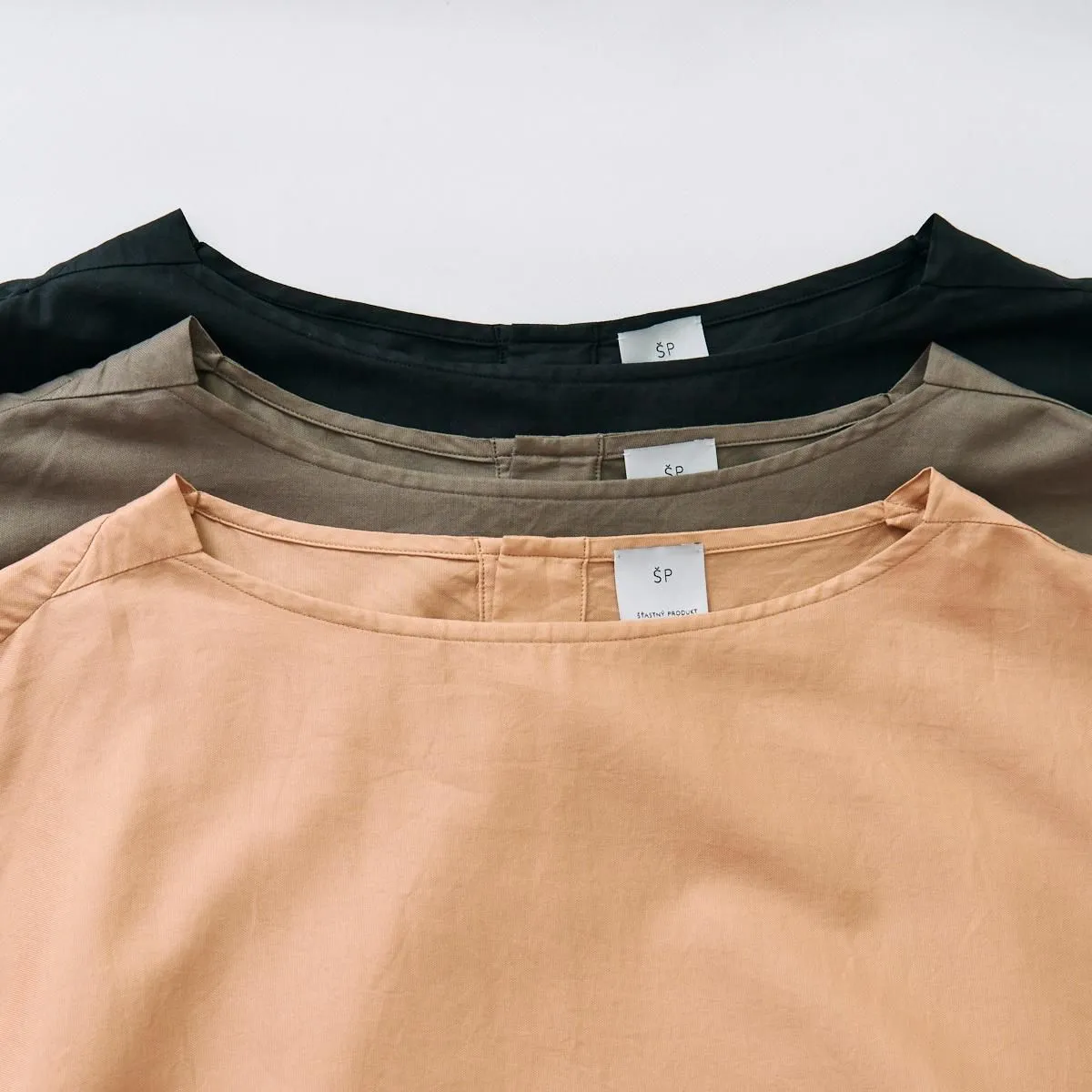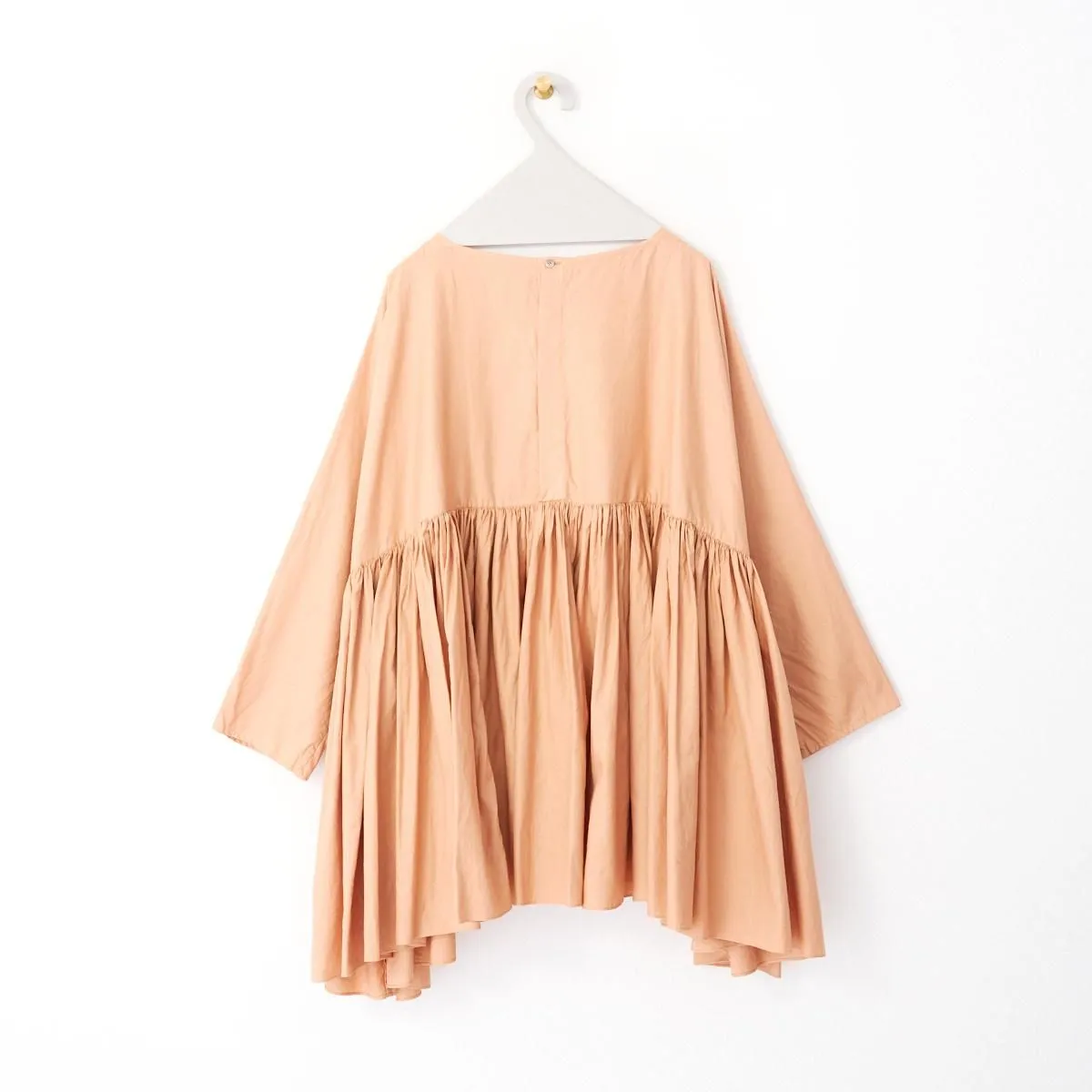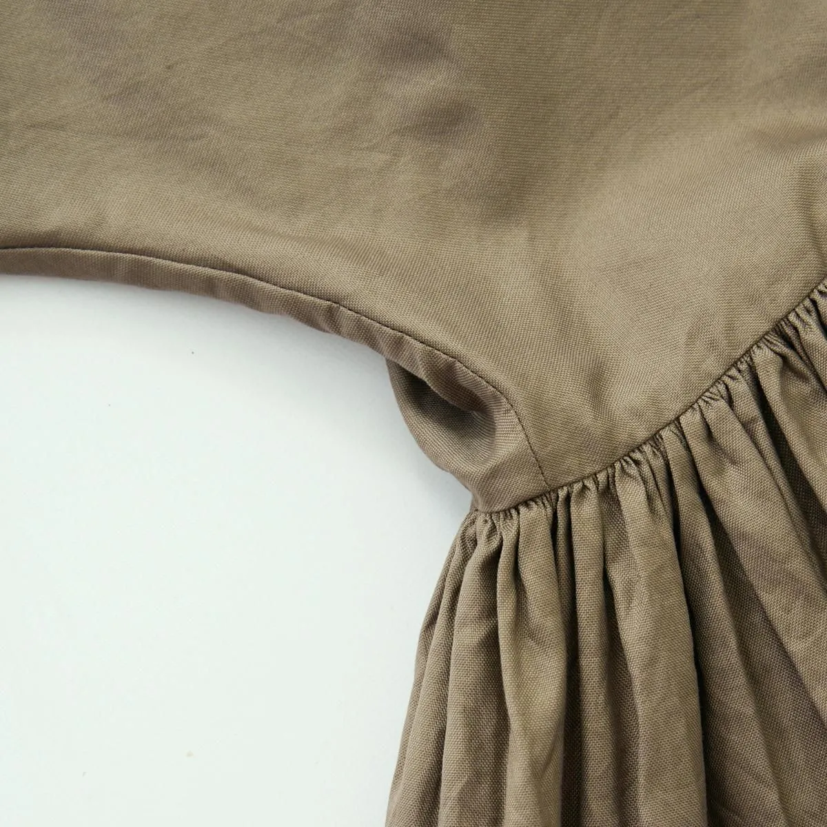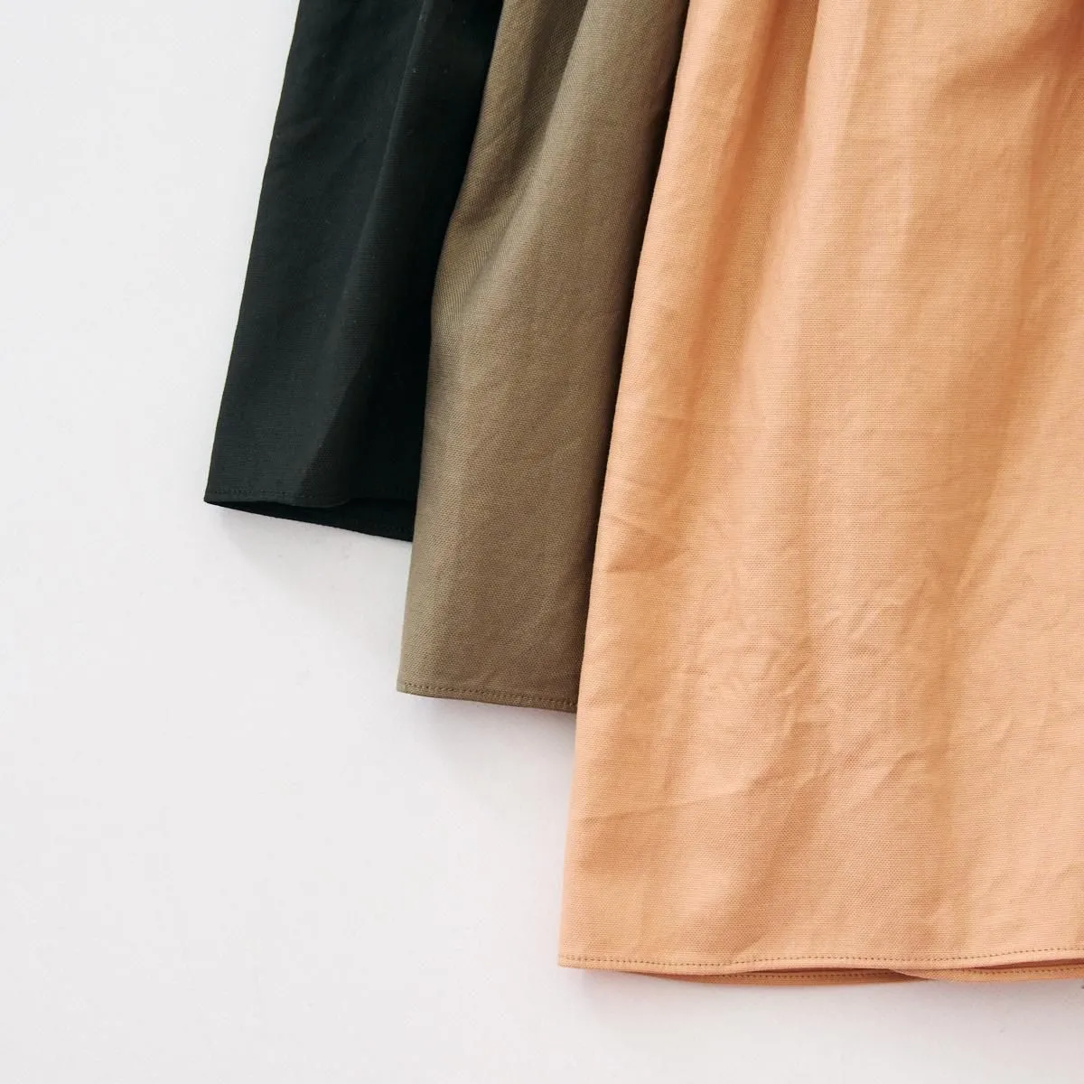 こちらはボリュームたっぷりのワイドギャザーブラウス。ウエストに外周162cm(スカート裾の外周ほどの長さ)の生地幅をとり、繊細な作業を重ね美しいギャザーを寄せています。一枚のブラウスに約5mもの生地を使用して完成した拘りの逸品です。 背面の比翼ボタンを開けて着脱する仕様ですが、どちらを前にしてもご着用いただけます。 生地はツヤとハリのあるコットンローンを使用しており、ボリュームを感じさせない軽やさと適度な落ち感のある仕上がりになっています。肩の滑らかな曲線に合わせて、小さく肩マチが切りかえてあるところにもエシュペーらしい小技を感じさせます。 ボートネックの首元にインナーをレイヤードしたり、ベストなど合わせたりとシーズンレスでお召しいただける1枚です。 size:F 着丈75cm / 身幅78cm(ギャザー切り替え部分) / 裄丈77cm ※サイズ計測には個体差がございます。多少の誤差はご了承下さい。 製品染め ※多少の色むらがありますが商品の特性となります。 color:VINTAGEWHITE,MACAROON,BROWN,BLACK material:COTTON 100% model:160cm お取り扱い店舗・・・dieci芝川ビル店 -------------------------------------------------------- ŠP/エシュペー 2022年にスタートしたブランド。ブランド名のŠP は「幸福の製品」を意味する 言葉の頭文字です。 19 世紀頃のヴィンテージの衣服や民族衣装などのディテールを取り入れつつ、 着心地やスタイルは今を生きる人のことを考え、 私たちの生活になじむ形となっています。 企画から製造までの多くを日本国内でおこなっており、繊細なディテールと丁寧な素材作りのため、作り手の方との親密で正確なやりとりを大切にしています。