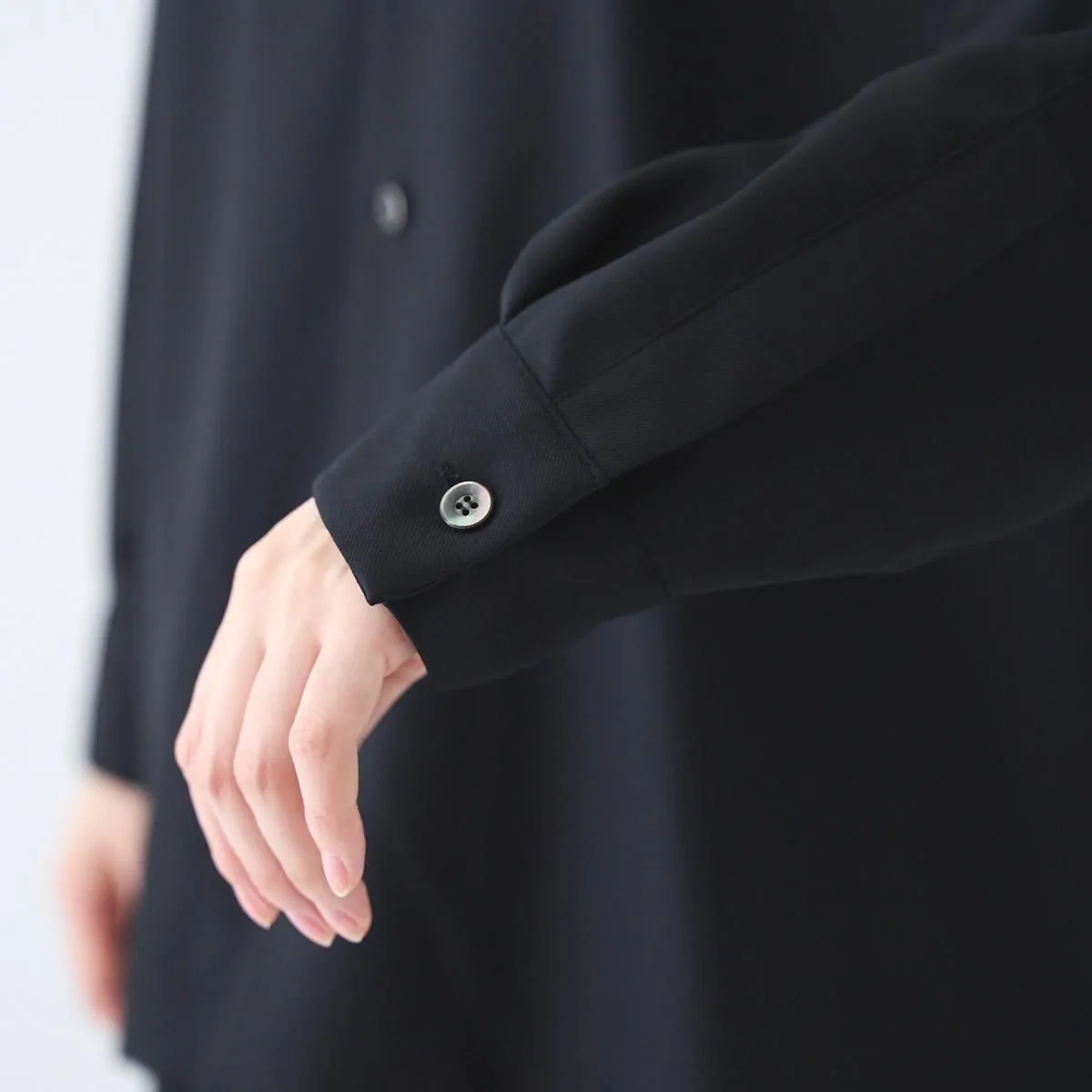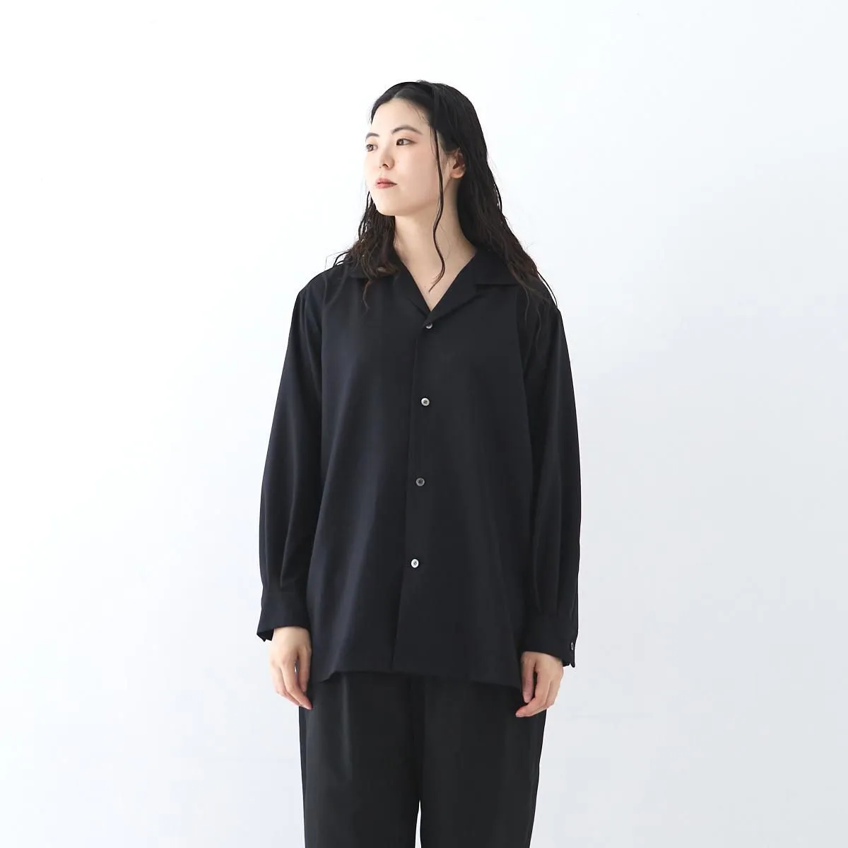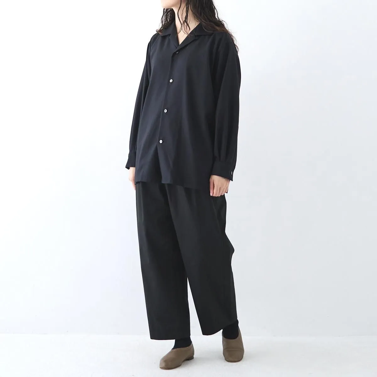 柔らかなウール生地で仕立てたオープンカラーシャツ。 しっかりとした生地感ながら、ほどよい光沢と柔らかさを併せ持ち、ふんわりとした女性らしいシルエットを描きます。 ゆとりのあるサイズ感で、シャツとしてはもちろん、軽い羽織りとしても活躍します。 自然な艶が上品さを引き立て、シックで洗練されたSPらしい一枚に仕上がっています。 size:1 着丈71cm/身幅60cm/肩幅48cm/袖丈54cm ※サイズ計測の多少の誤差はご了承下さい。 color:CHARCOAL/BLACK material:SHELL:WOOL 100% SEPARATE CLOTH :RAYON 54%,COTTON 46% model:163cm(CHARCOAL着用) 168cm(BLACK着用) お取り扱い店舗・・・dieci kyutaro店 2F,芝川ビル店 -------------------------------------------------------- SP/エシュペー 19世紀頃のヴィンテージの衣服や民族衣装などのディテールを取り入れつつ、着心地やスタイルは今を生きる人のことを考え、私たちの生活になじむ日常着を提案する日本のブランド。オリジナルのテキスタイルと細やかな縫製を得意としており、企画から製造までの多くを、関東近郊で行い、繊細なディテールと丁寧な素材作りのため、作り手の方との親密で正確なやりとりを大切にされています。 ブランド名のŠP は「幸福の製品」を意味する言葉の頭文字です。