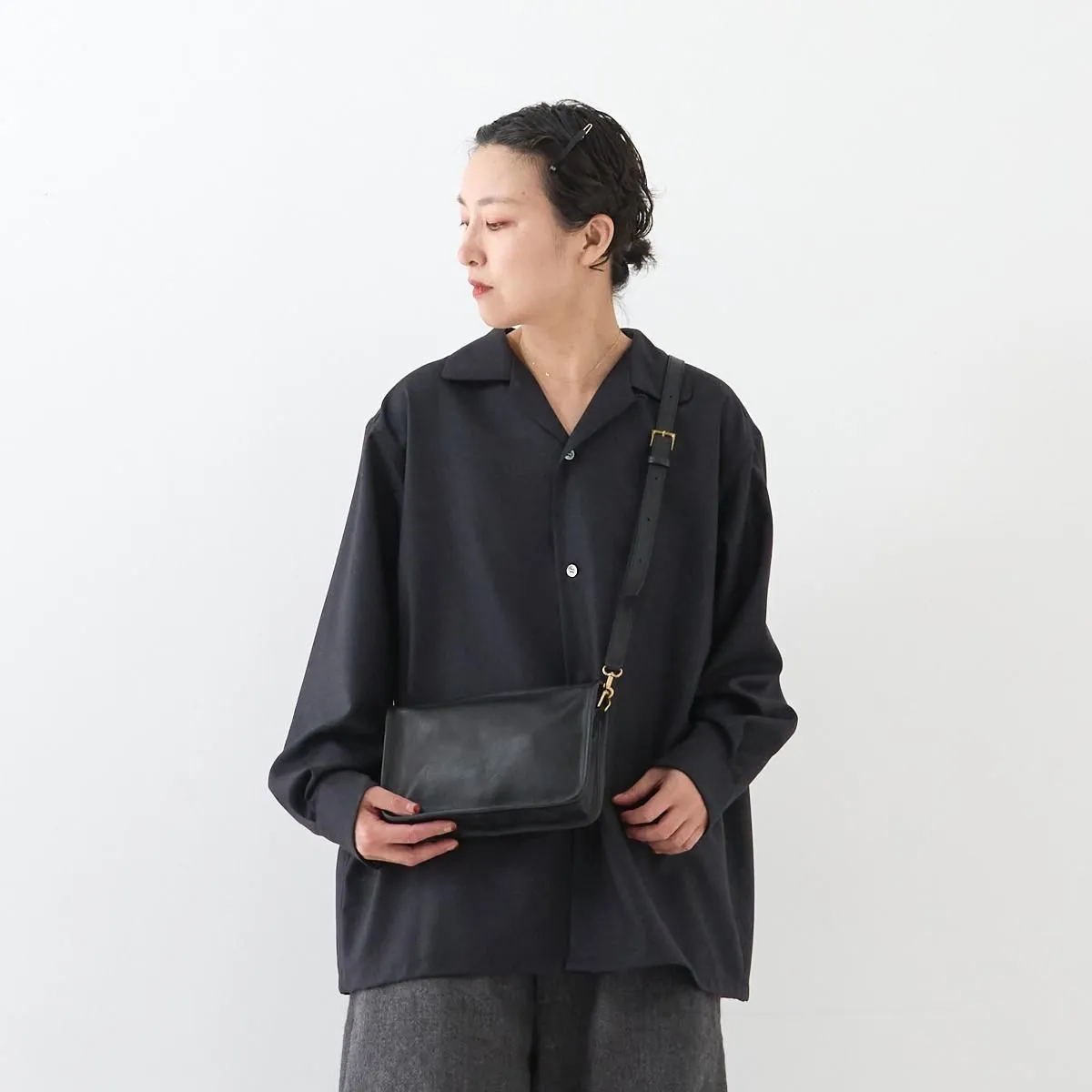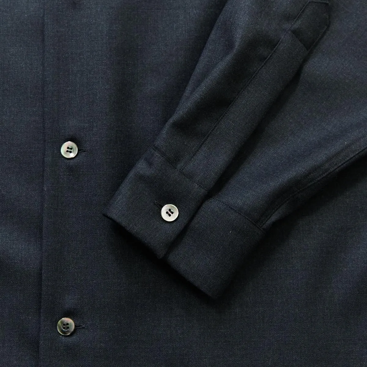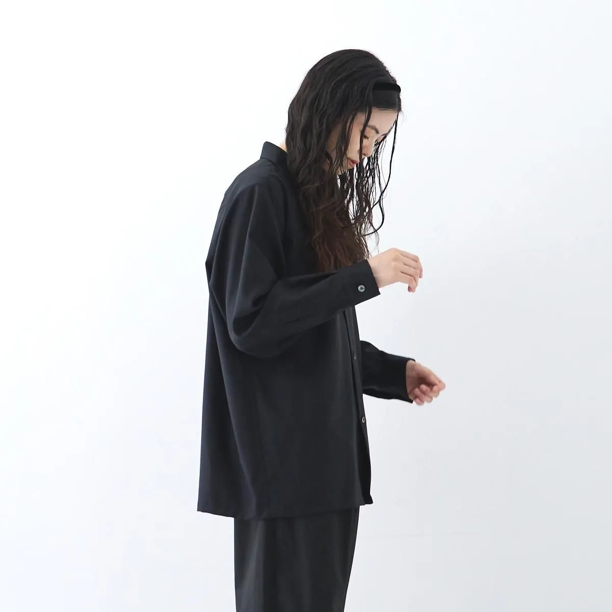 柔らかなウール生地で仕立てたオープンカラーシャツ。 しっかりとした生地感ながら、ほどよい光沢と柔らかさを併せ持ち、ふんわりとした女性らしいシルエットを描きます。 ゆとりのあるサイズ感で、シャツとしてはもちろん、軽い羽織りとしても活躍します。 自然な艶が上品さを引き立て、シックで洗練されたSPらしい一枚に仕上がっています。 size:1 着丈71cm/身幅60cm/肩幅48cm/袖丈54cm ※サイズ計測の多少の誤差はご了承下さい。 color:CHARCOAL/BLACK material:SHELL:WOOL 100% SEPARATE CLOTH :RAYON 54%,COTTON 46% model:163cm(CHARCOAL着用) 168cm(BLACK着用) お取り扱い店舗・・・dieci kyutaro店 2F,芝川ビル店 -------------------------------------------------------- SP/エシュペー 19世紀頃のヴィンテージの衣服や民族衣装などのディテールを取り入れつつ、着心地やスタイルは今を生きる人のことを考え、私たちの生活になじむ日常着を提案する日本のブランド。オリジナルのテキスタイルと細やかな縫製を得意としており、企画から製造までの多くを、関東近郊で行い、繊細なディテールと丁寧な素材作りのため、作り手の方との親密で正確なやりとりを大切にされています。 ブランド名のŠP は「幸福の製品」を意味する言葉の頭文字です。