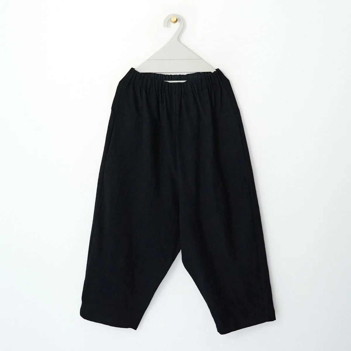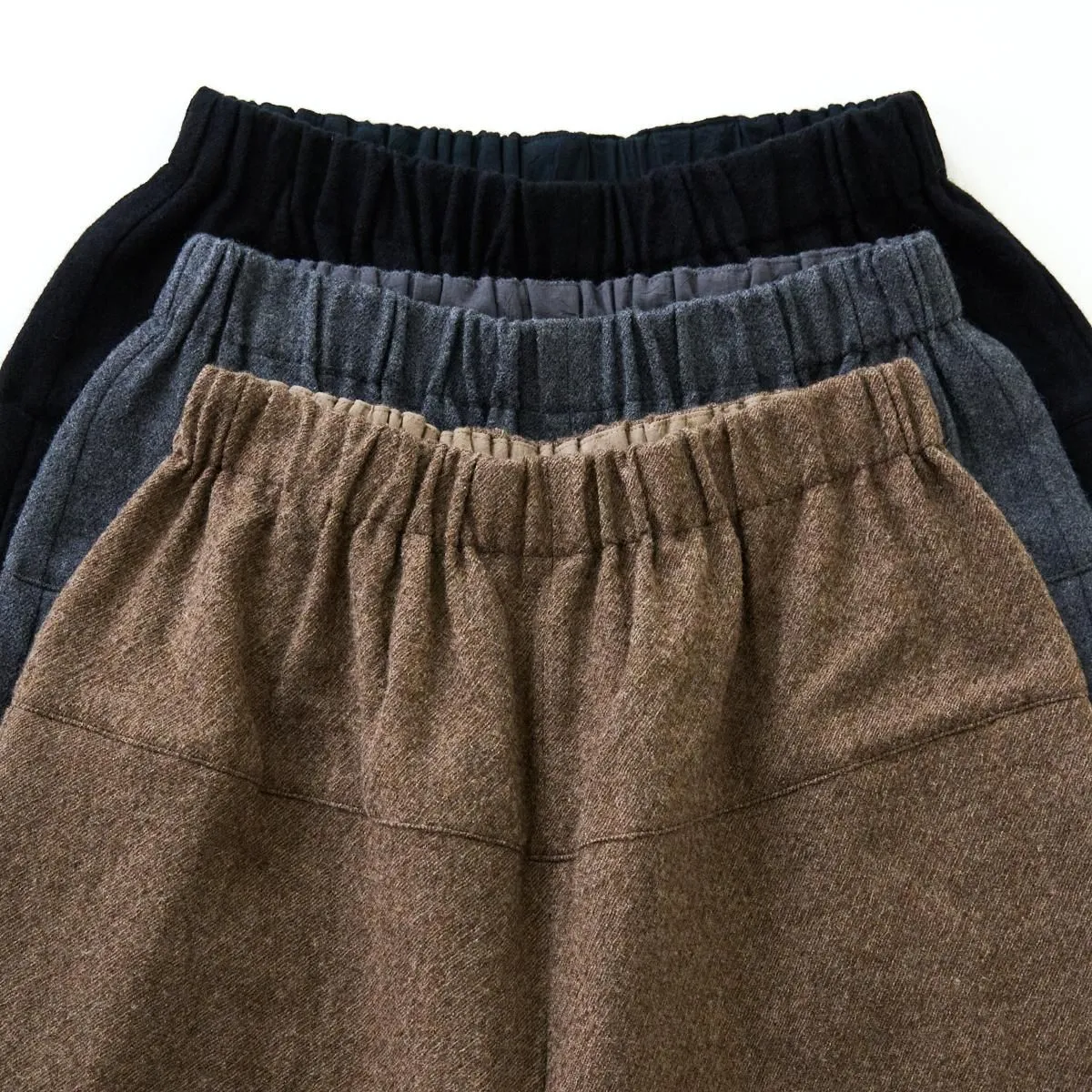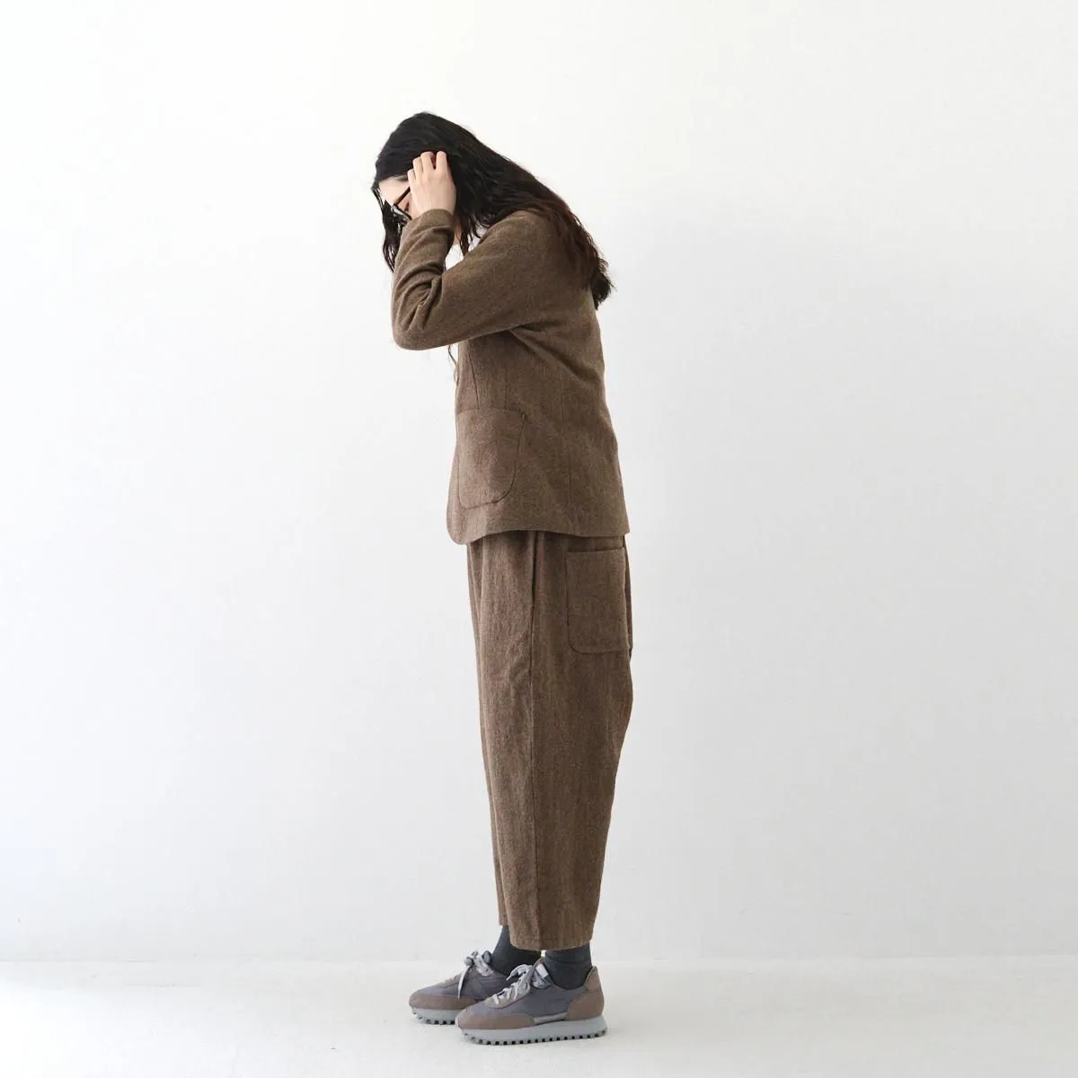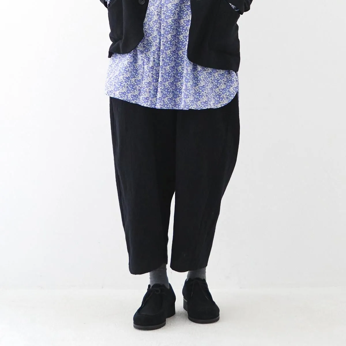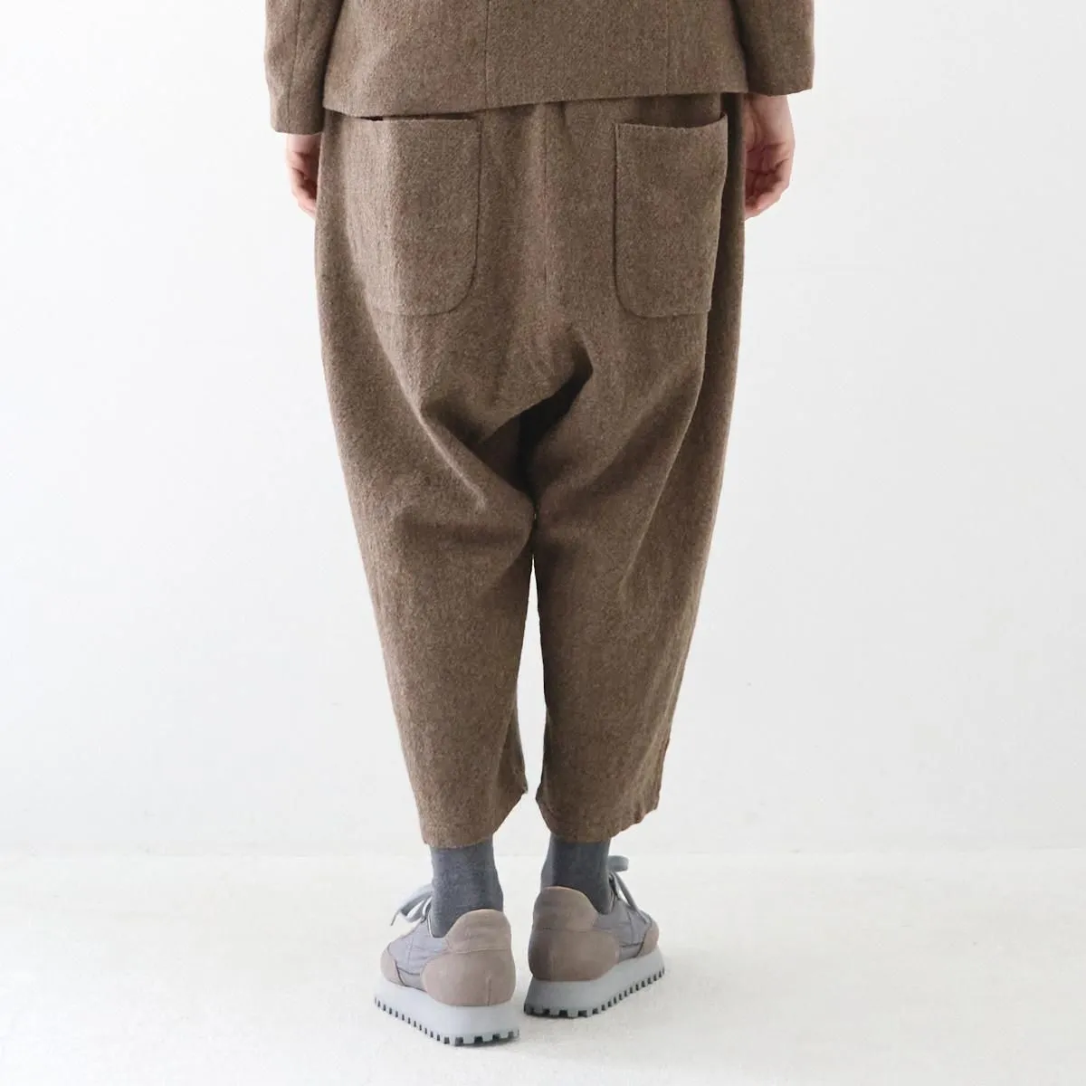 後加工によってボリューム感を出した柔らかな圧縮ウール素材のパンツ。サルエルパンツのように股上を深くとり、低めについたポケットがアクセントに。程よく太めなシルエットです。ウエストはゴム紐仕様でリラックスした着心地。同素材のジャケットとセットアップでフォーマルなシーンにもオススメです。 25AW size:F ウエスト~91cm(ゴム+紐)/股上51cm/股下46cm/ヒップ110cm/わたり39cm/裾幅23cm ※サイズ計測の多少の誤差はご了承下さい。 material:WOOL 100% color:BROWN・GRAY・BLACK model:168cm お取り扱い店舗・・・dieci kyutaro店2F -------------------------------------------------------- Veritecoeur(ヴェリテクール) 真心という意味を込めて名付けたVeritecoeur。 素材の持つ魅力を活かし、着心地を大切にした、どこか人の手の温もりを感じるモノ作り。フォーマルからデイリーまで、ブランドらしさを失わない豊富なコレクション。 着て、洗ってを繰り返し、自分らしい愛着のある1枚へと育てて欲しい作り手の想い。 それぞれの暮らしを想い描きながら届ける、心豊かになれる日常着です。 size_chart