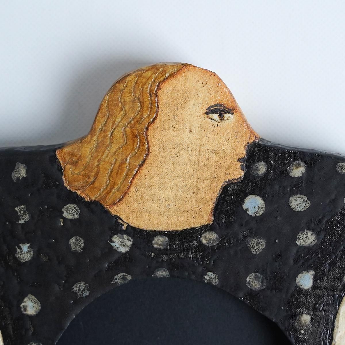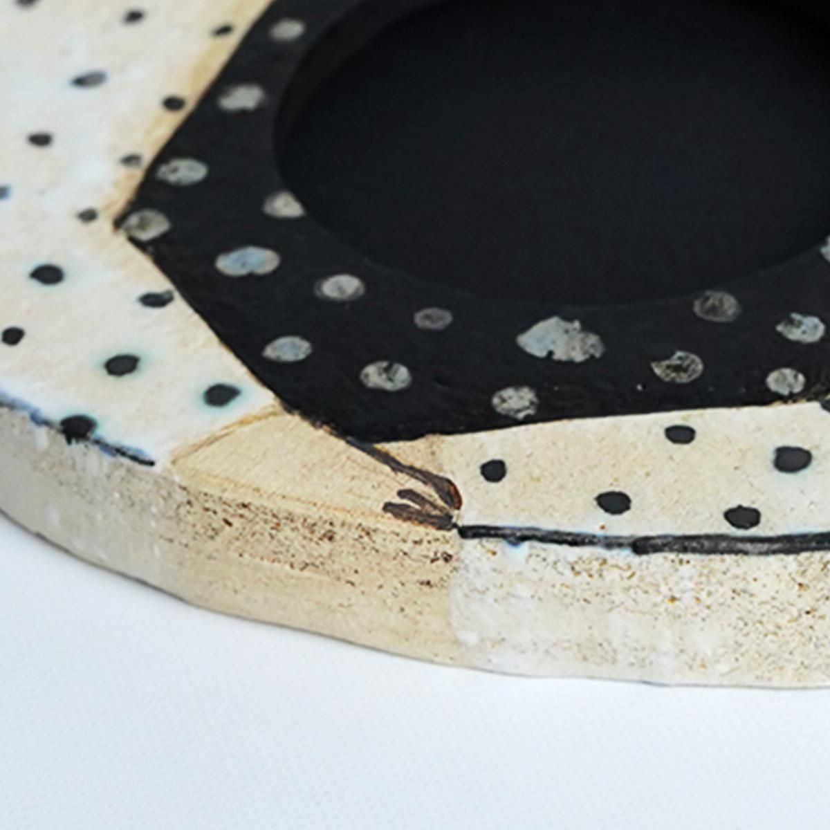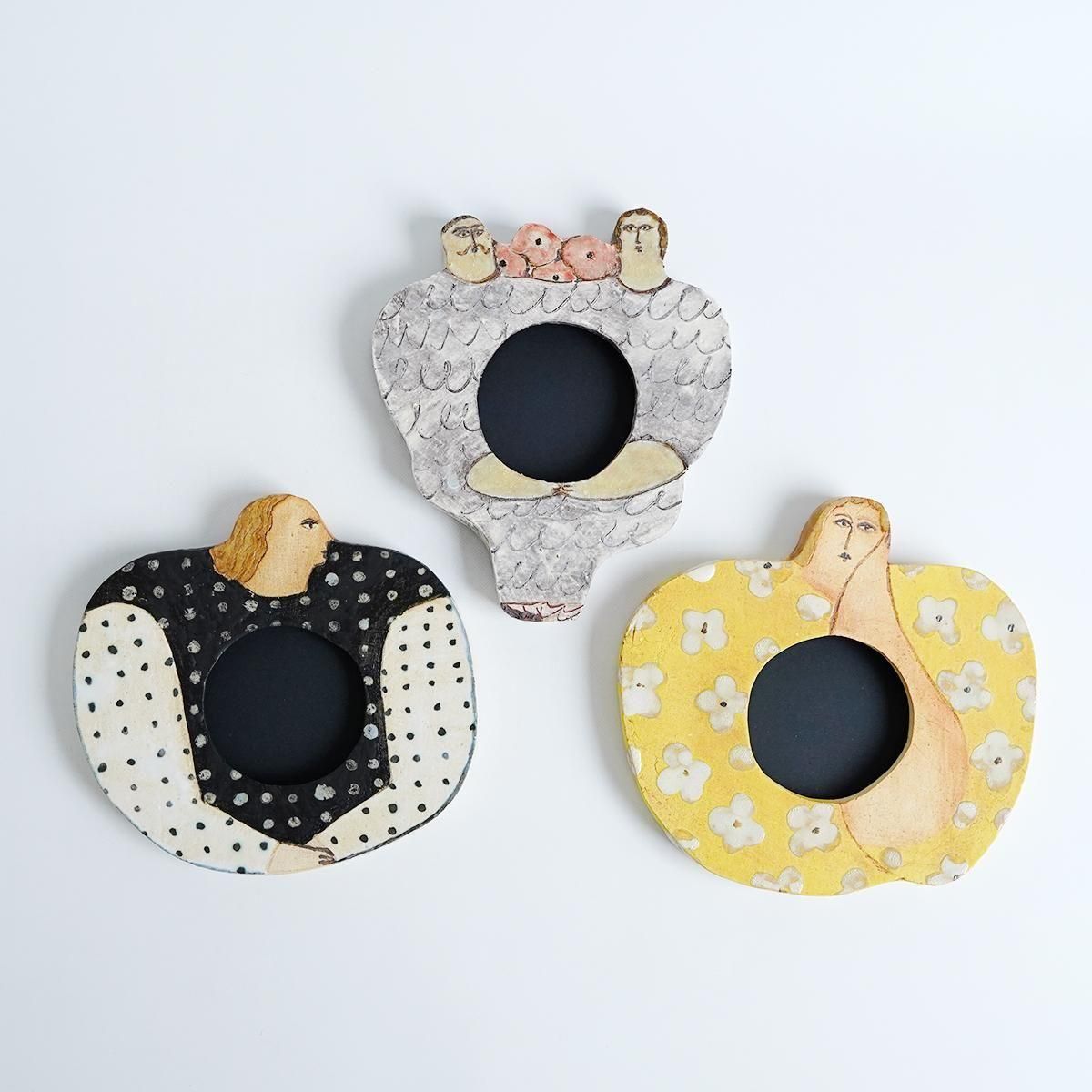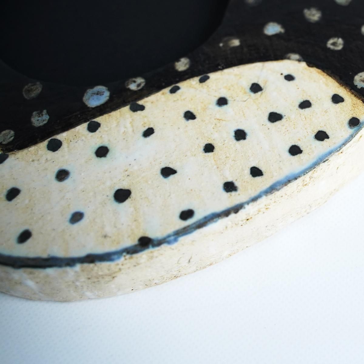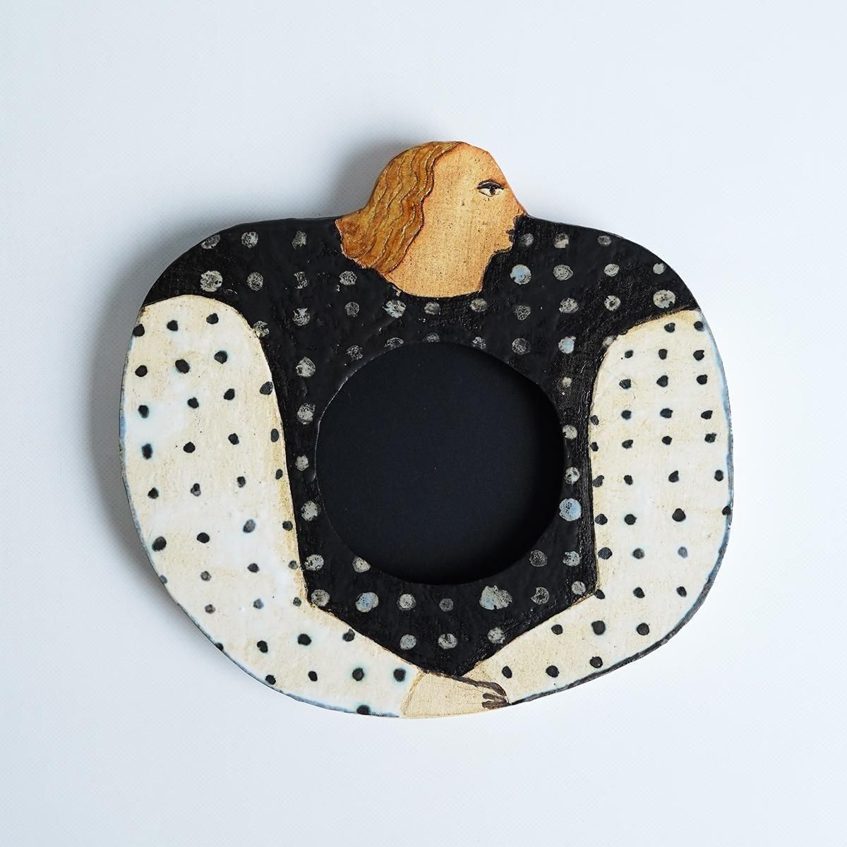 木版画や木彫、陶器を用いて愛らしく柔らかい世界観を表現される作家の菅祐子さん。 こちらは菅さんらしいユーモラスな視点と感性が詰まったフォトフレームとなります。ご自身の出産、子育てを経て家族写真が増えたことから、こんなフォトフレームだったら自分も部屋に飾りたいという思いで制作されました。 お気に入りの写真や絵、子供が描いた落書きなど色々飾ってお楽しみください。 モノトーンベースに水玉柄で丸みのあるユニークなデザインの存在感がある壁掛けフォトフレーム。 お部屋のアクセントに。 size : W約20cm×H約19cm×D約2cm 陶器 ※貫入やカケがある場合がございますが、作品の特徴となりますのでご了承下さいませ。 写真を出し入れする際は上から滑りこませるようにしてください。 紙を無理に手前に引っ張って出そうとするとツメ部分が取れてしまう恐れがありますのでご注意ください。
