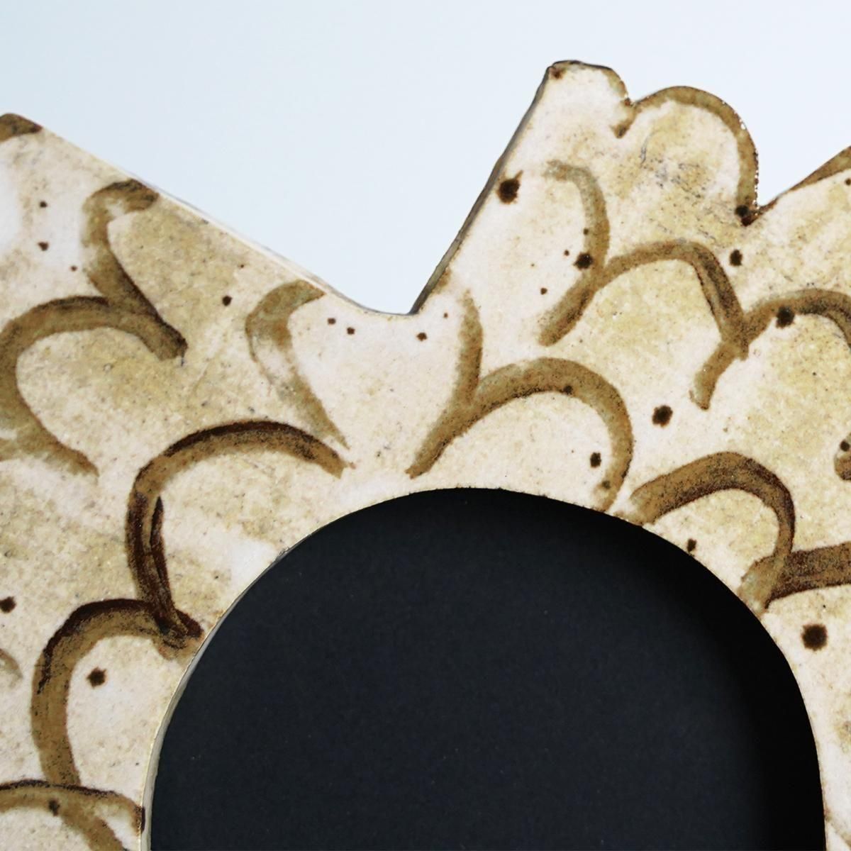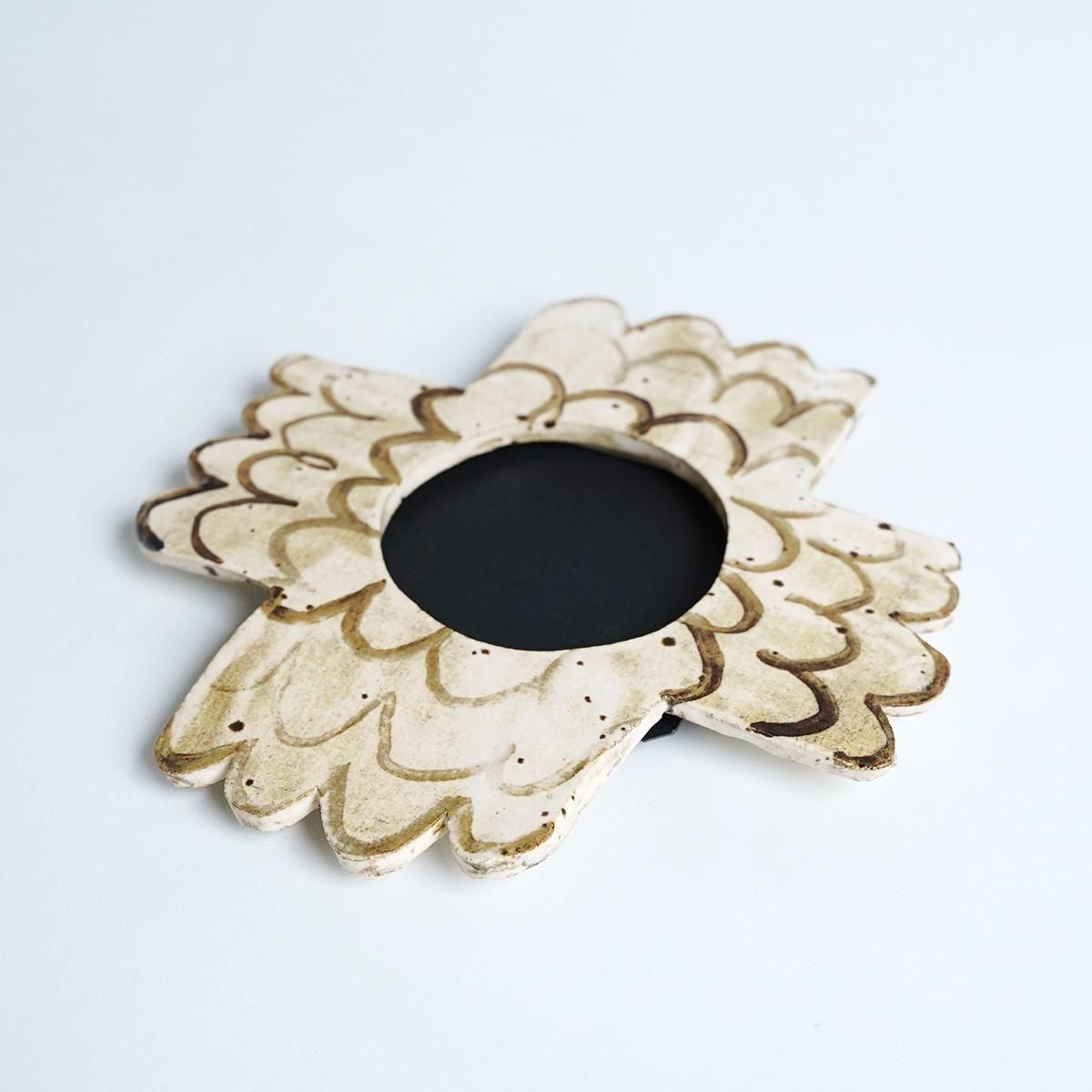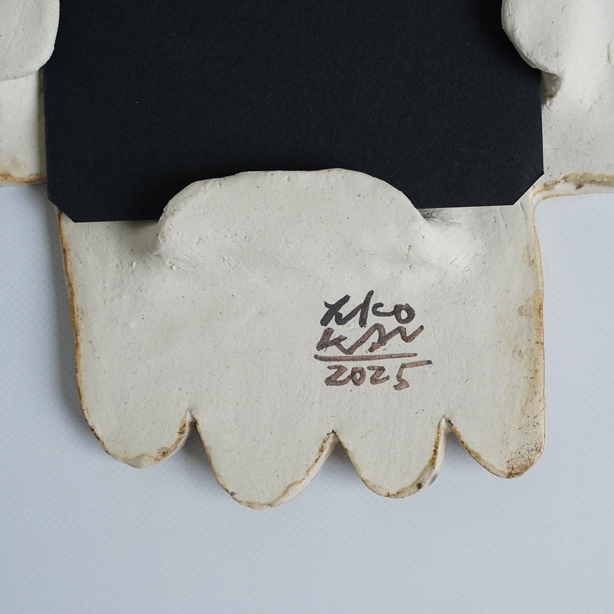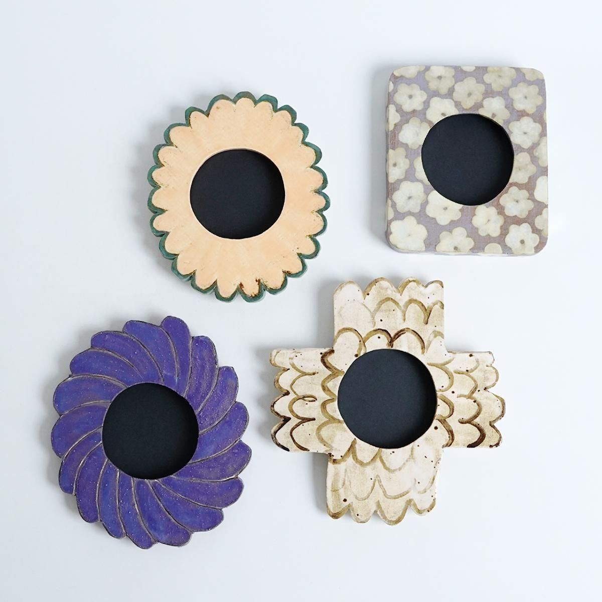 木版画や木彫、陶器を用いて愛らしく柔らかい世界観を表現される作家の菅祐子さん。 こちらは菅さんらしいユーモラスな視点と感性が詰まったフォトフレームとなります。ご自身の出産、子育てを経て家族写真が増えたことから、こんなフォトフレームだったら自分も部屋に飾りたいという思いで制作されました。 お気に入りの写真や絵、子供が描いた落書きなど色々飾ってお楽しみください。 十字型の形で艶のある質感に優しい柄がボーダー状で描かれた壁掛け作品。 優しい色とユニークな形で、お部屋の雰囲気を明るくしてくれそうです。 size : W約20cm×H約28cm×D約3cm 陶器 ※貫入やカケがある場合がございますが、作品の特徴となりますのでご了承下さいませ。 写真を出し入れする際は上から滑りこませるようにしてください。 紙を無理に手前に引っ張って出そうとするとツメ部分が取れてしまう恐れがありますのでご注意ください。