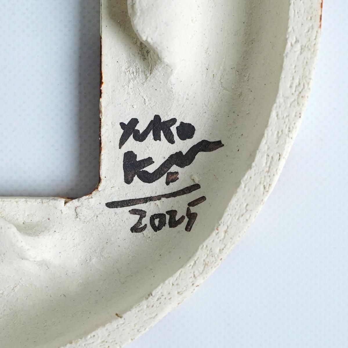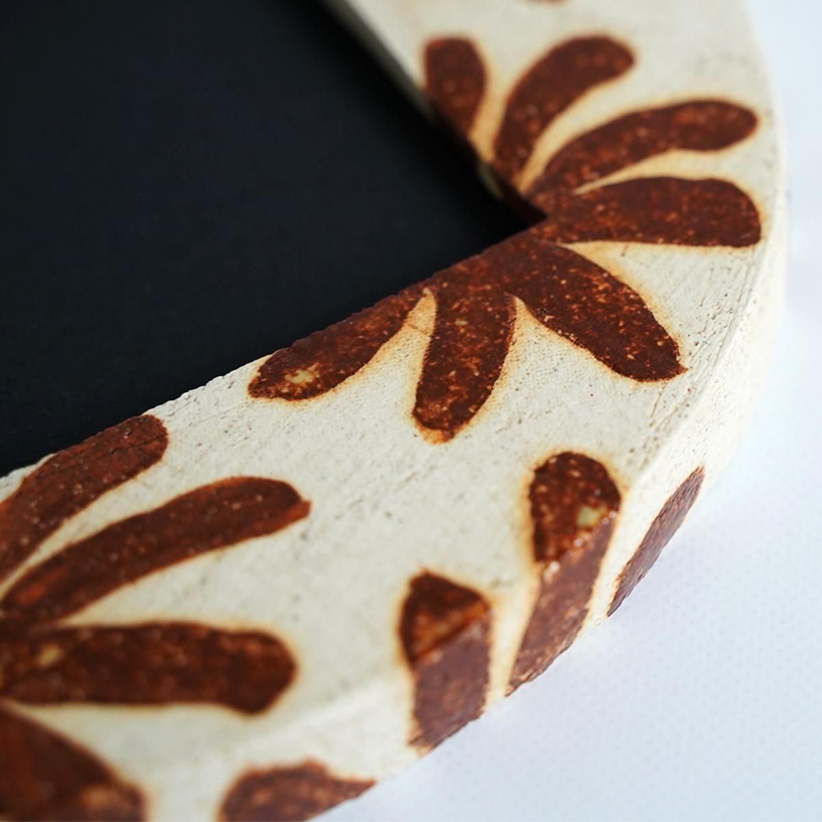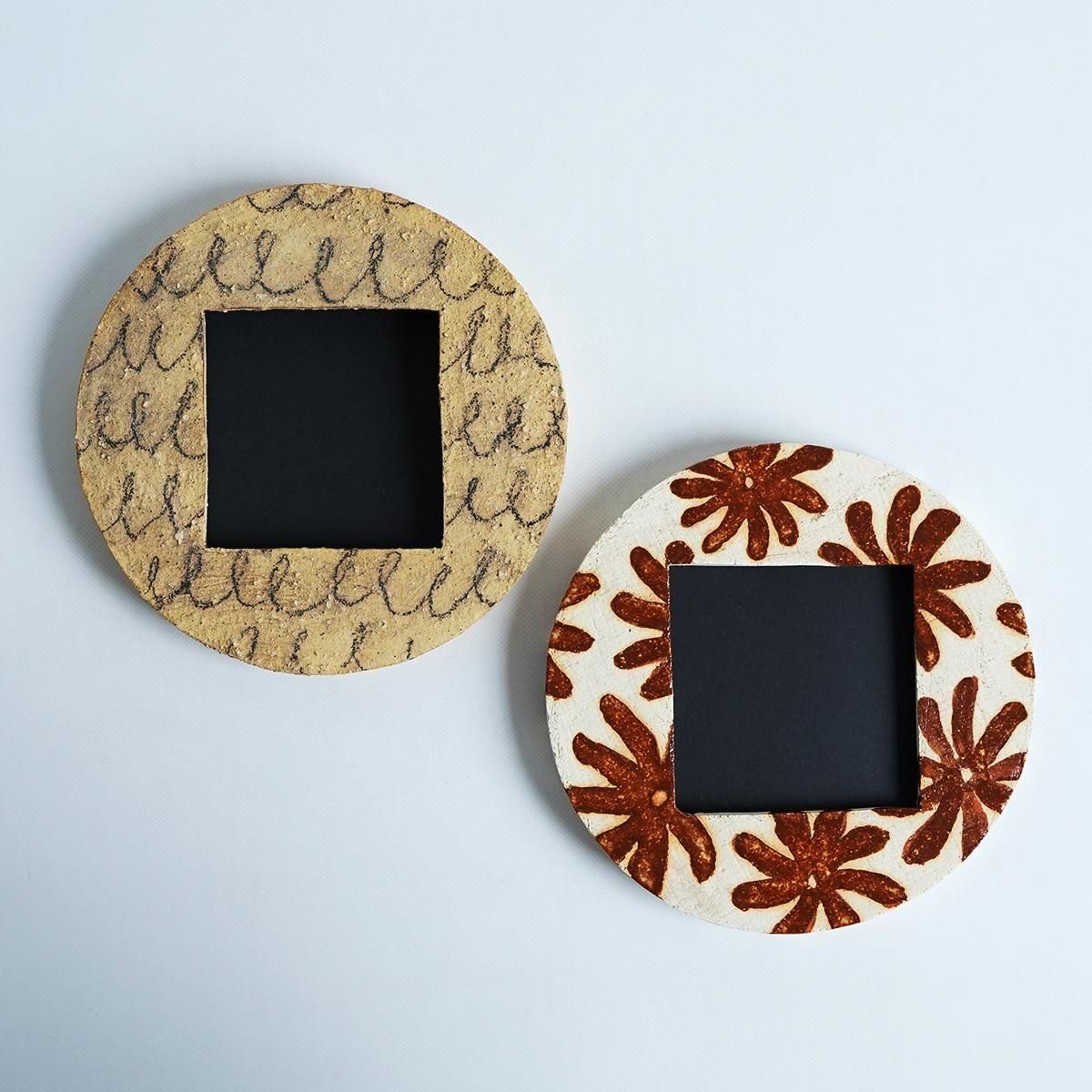 木版画や木彫、陶器を用いて愛らしく柔らかい世界観を表現される作家の菅祐子さん。 こちらは菅さんらしいユーモラスな視点と感性が詰まったフォトフレームとなります。ご自身の出産、子育てを経て家族写真が増えたことから、こんなフォトフレームだったら自分も部屋に飾りたいという思いで制作されました。 お気に入りの写真や絵、子供が描いた落書きなど色々飾ってお楽しみください。 ブラウンの花モチーフが並んだ丸い形の壁掛けフォトフレームの作品。 優しい色で、お部屋の雰囲気を明るくしてくれそうです。 size : φ16cm×D約1.7cm 陶器 ※貫入やカケがある場合がございますが、作品の特徴となりますのでご了承下さいませ。 写真を出し入れする際は上から滑りこませるようにしてください。 紙を無理に手前に引っ張って出そうとするとツメ部分が取れてしまう恐れがありますのでご注意ください。
