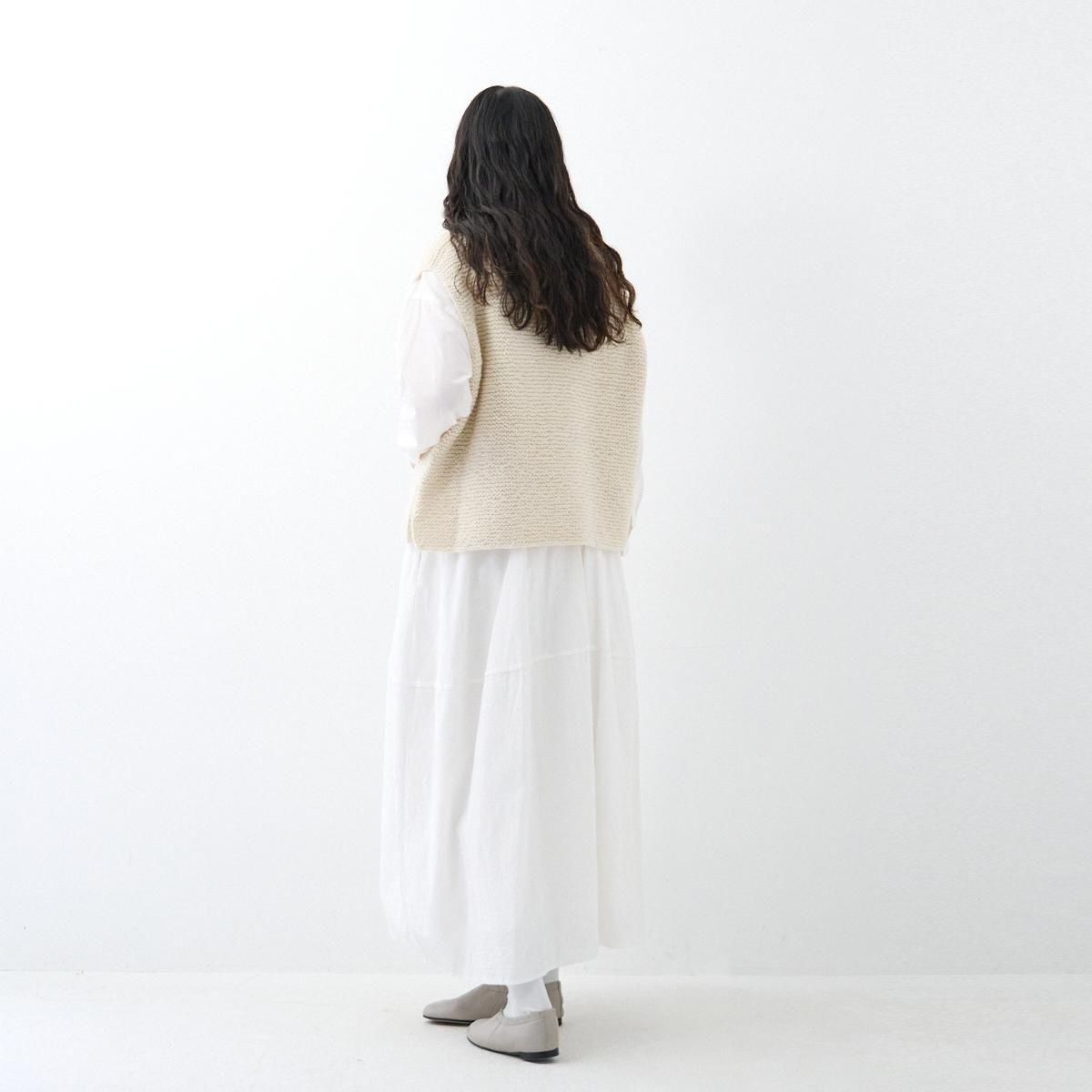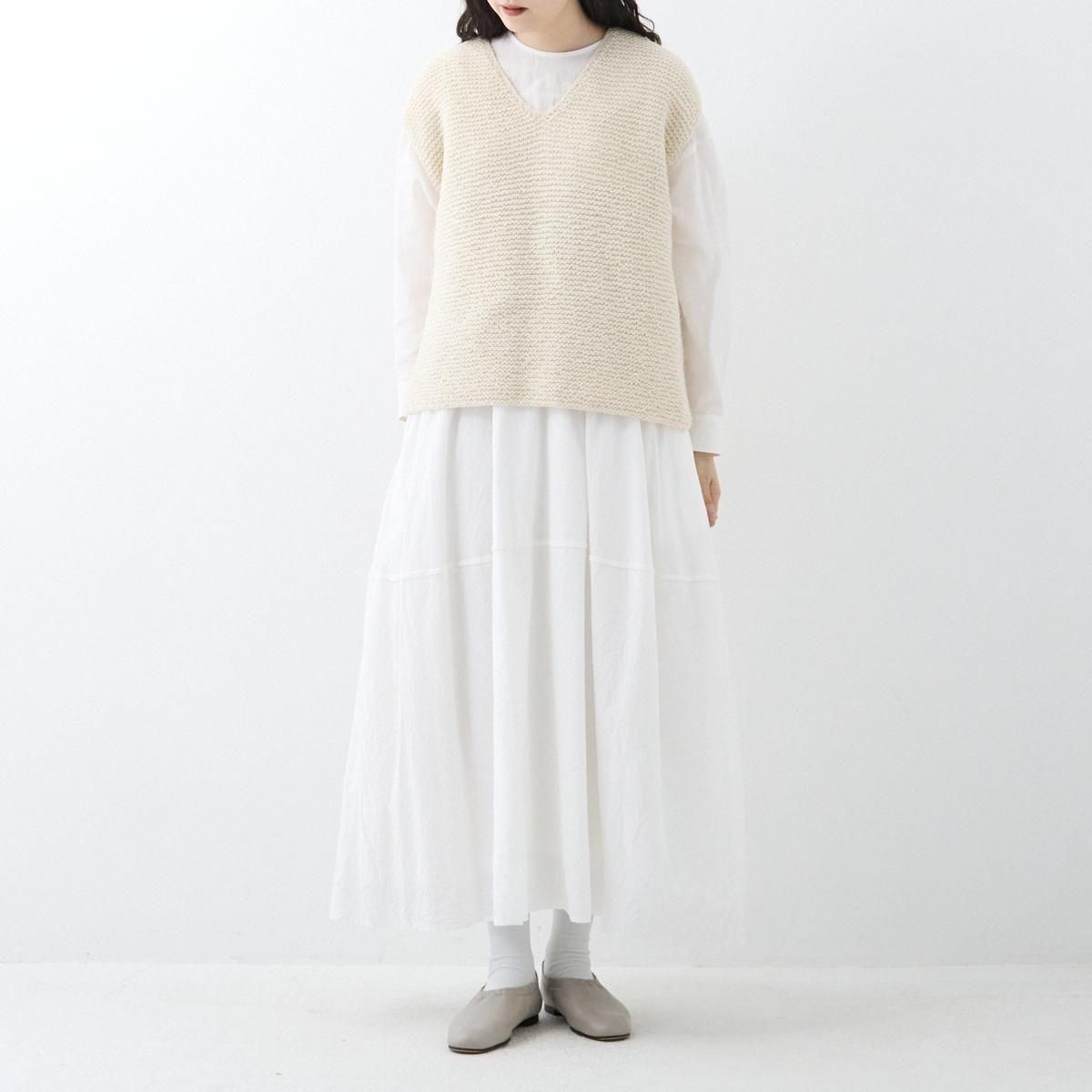 こちらはハンドメイドのニットベスト。 ワイドな肩幅から自然に落ちるドロップショルダーで、二の腕までを包み込むようなシルエットです。インナーに定番のカットソーなど、シンプルなアイテムと組み合わせても、独特のフォルムが静かな個性を見せ、装いに差がつくアイテム。フロントはVネック、裾に小さなスリットが入っています。 アルパカ×ウールを混紡し、ふんわり空気を含んだ毛糸は保温性が高く、ボリュームがありながらもとっても軽い着心地です。自然な素材の魅力を活かし、手作業で丁寧に編み上げられています。 25AW size:one size 着丈56cm/身幅59cm/肩幅50.5cm ※*ハンドニットで作られている為 サイズ感に多少の個体差があります。 color:ホワイト material:アルパカ65%/ウール35% ※ドライクリーニング推奨 model:168cm お取り扱い店舗・・・dieci kyutaro店2F -------------------------------------------------------- ゴーシュ 普遍的な新しさをテーマに、カッティングやテキスタイルにこだわり、シンプルながらこだわりを感じることが出来る飽きの来ない衣服を生み出すブランドです。 size_chart