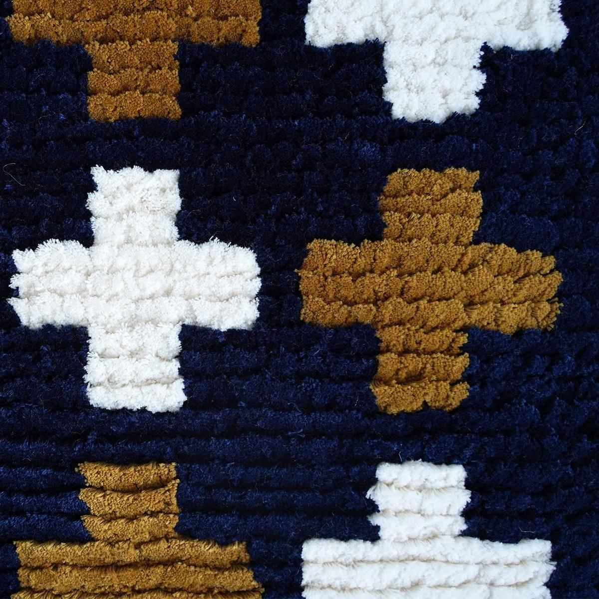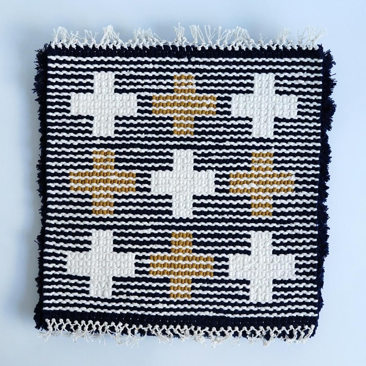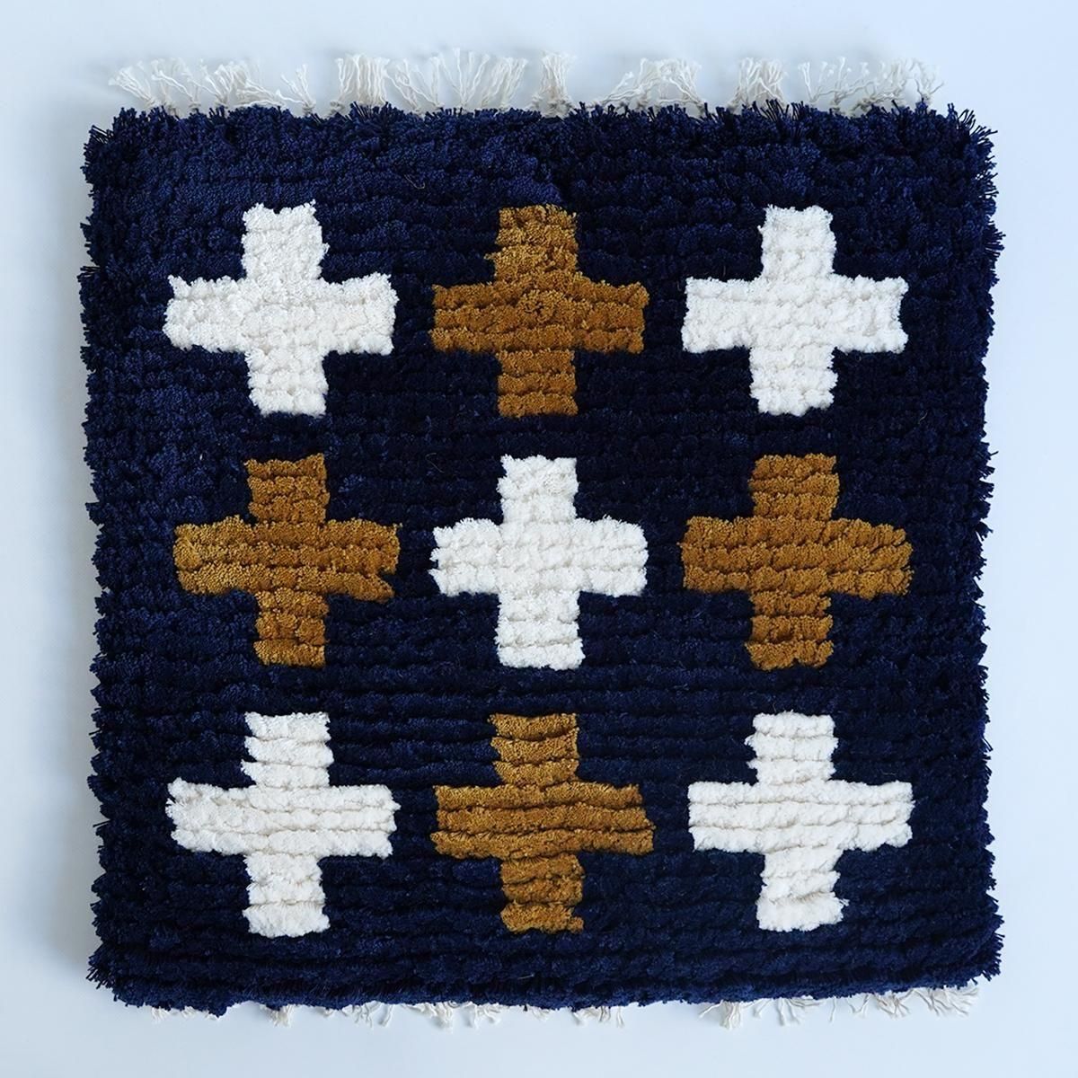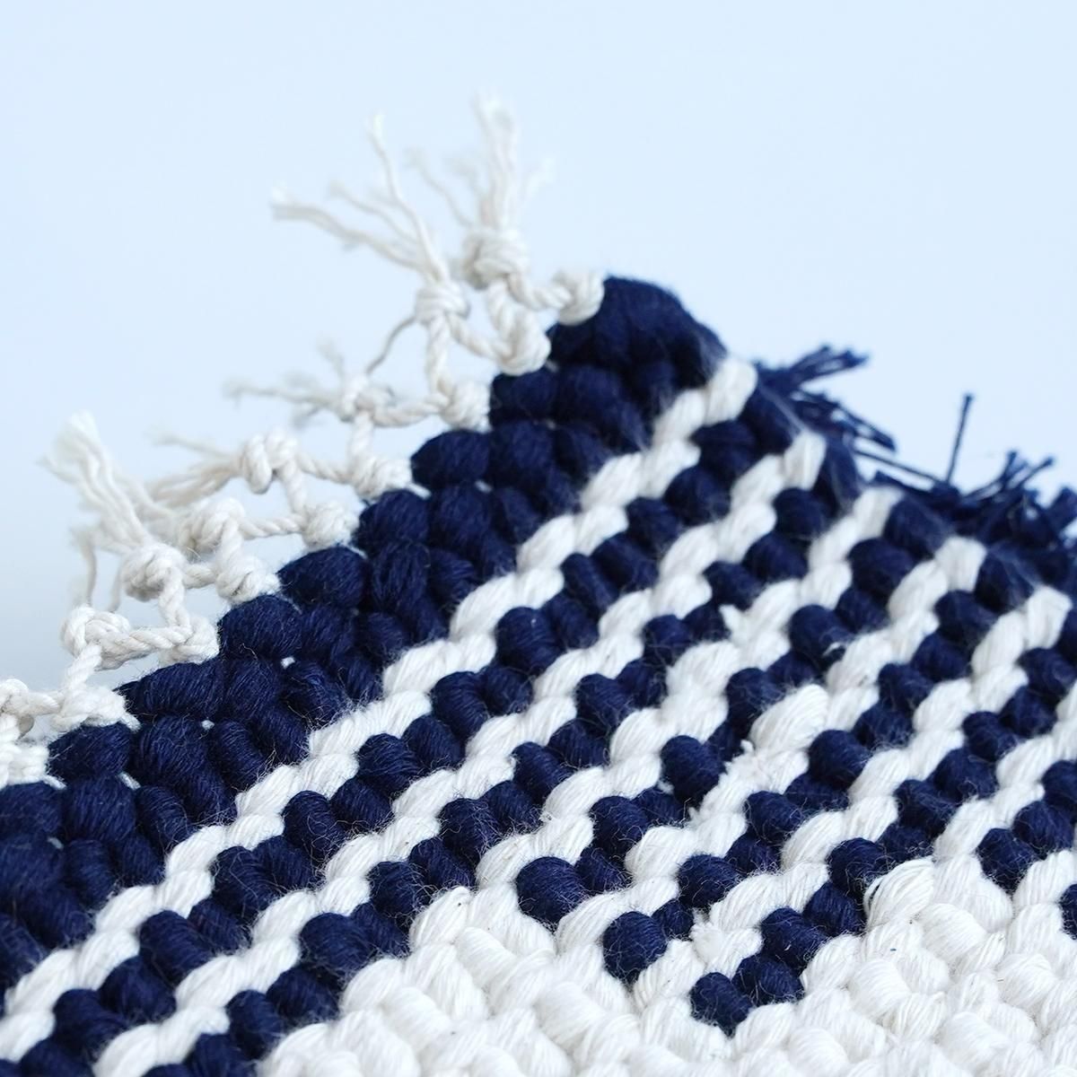 倉敷本染手織研究所さんで制作されたノッティング織の椅子敷きです。一つ一つ織られた美しい織り目と色合いがとても可愛らしく、インテリアのポイントになります。 ノッティングとは外村吉之介氏が考案した縦機で織られた椅子敷です。 径に木綿糸を張り、木綿の糸束を結び(ノッティング)つけて制作されたものです。 民藝について深く学ばれ、糸を紡ぐことから完成まで丁寧に仕立てられる椅子敷きを是非永くご愛用ください。 紺色のところには藍染めの糸が使用されており、 コットン素材のみでできたノッティング敷です。 size: 約40cm×40cm material: 表地 cotton 100% 裏糸 cotton 100% 経糸 cotton 100% 取扱い店舗…dieci天神橋店