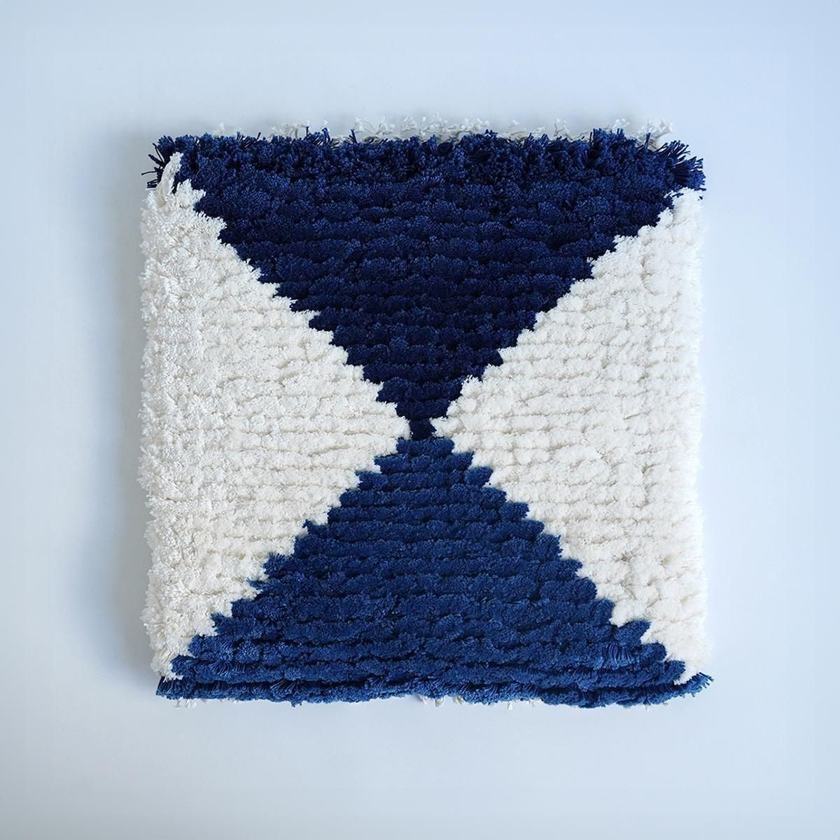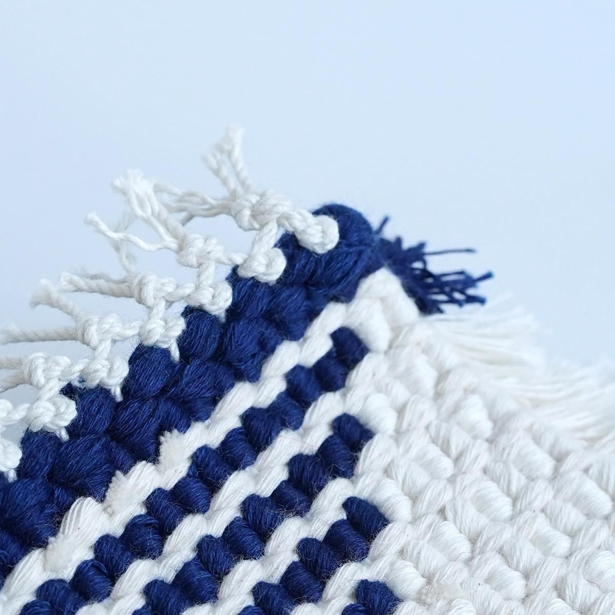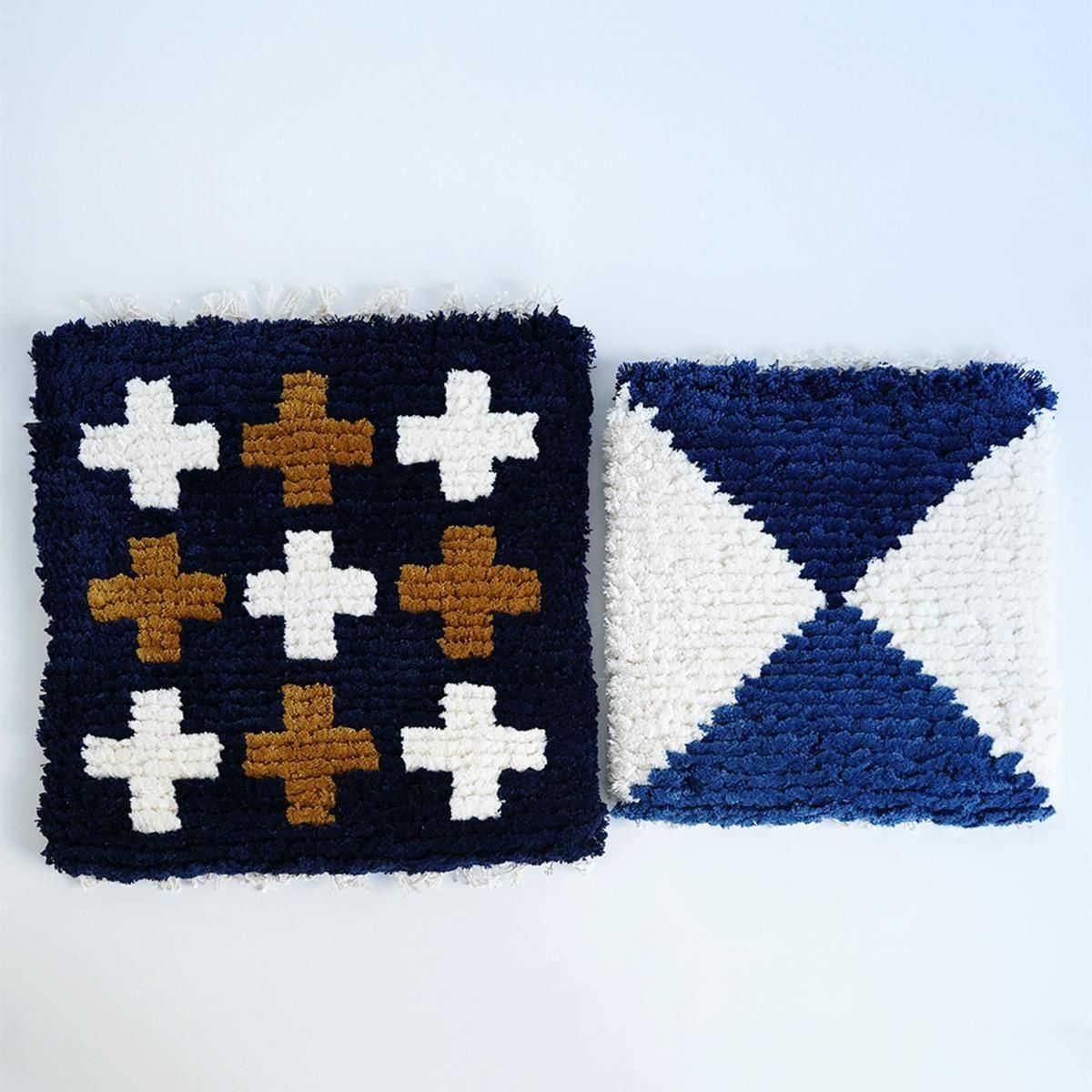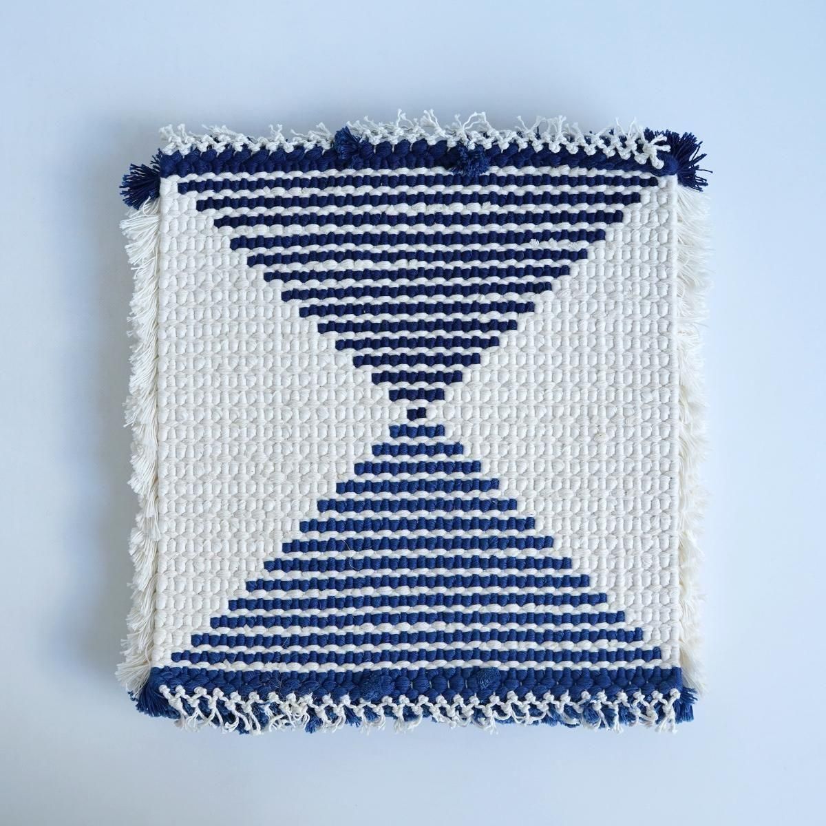 倉敷本染手織研究所さんで制作されたノッティング織の椅子敷きです。一つ一つ織られた美しい織り目と色合いがとても可愛らしく、インテリアのポイントになります。 こちらは通常サイズより一回り小さいサイズで、座面の小さな椅子やベンチにもぴったりで、コットン素材のみでできたノッティング敷です。青い部分には藍染めの糸が使用されています。 ノッティングとは外村吉之介氏が考案した縦機で織られた椅子敷です。 径に木綿糸を張り、ウールもしくは木綿の糸束を結び(ノッティング)つけて制作されたものです。 民藝について深く学ばれ、糸を紡ぐことから完成まで丁寧に仕立てられる椅子敷きを是非永くご愛用ください。 size: 約30cm×30cm material: 表地 cotton 100% 裏糸 cotton 100% 経糸 cotton 100% 取扱い店舗…dieci天神橋店