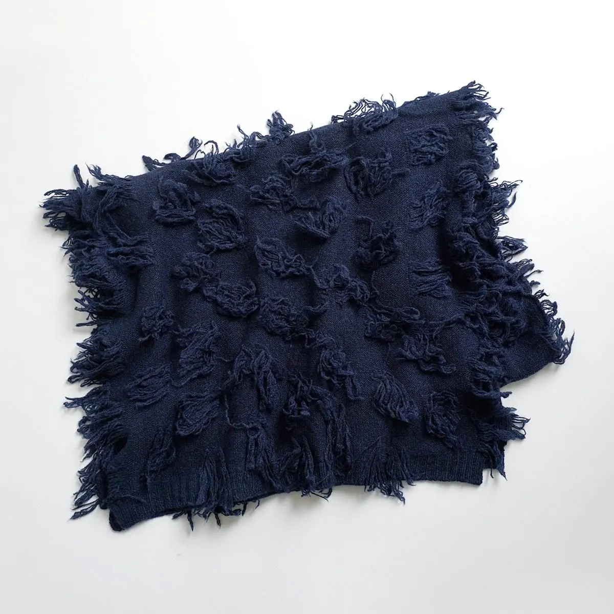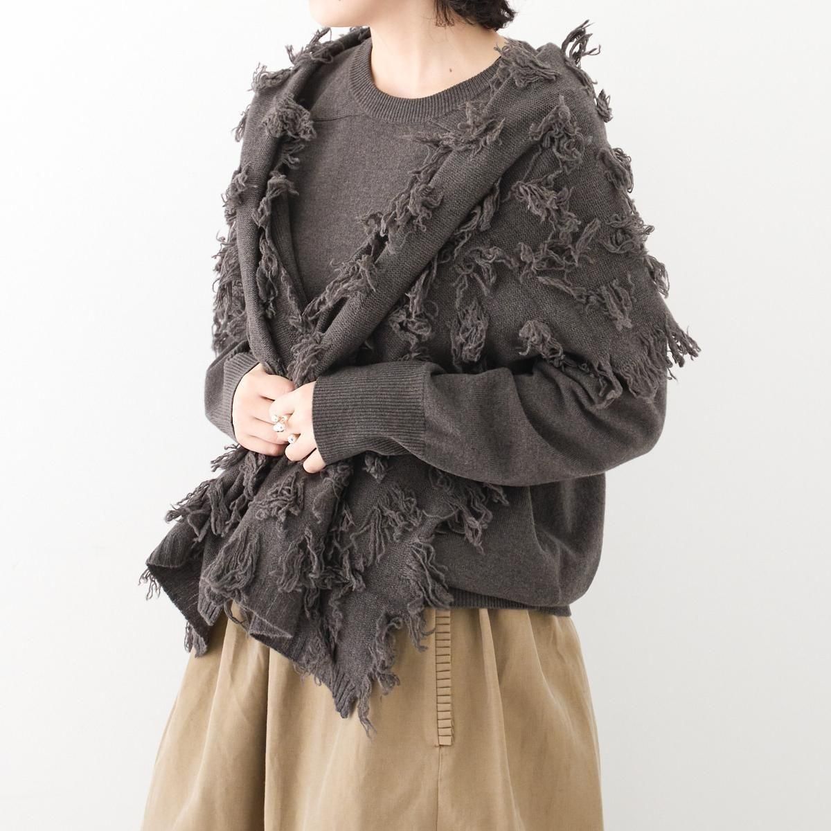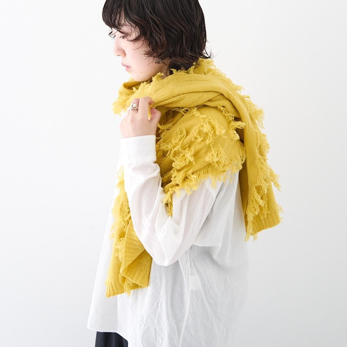 柔らかなラムウールの素材感をふんだんに活かしたフリンジストール。ふんわり繊細な毛糸が動きのある印象を与えてくれます。首に巻くのはもちろん、広げてサッと肩に掛けるだけでも華やかにコーディネートが引き立てます。 大判ですが薄手でコンパクトに畳めるので、外出先でも邪魔にならず重宝します。上品でユニークな存在感のある一枚です。 25AW size:50cm×160cm ※サイズ計測の多少の誤差はご了承下さい。 color:イエロー・グレー・ネイビー material:ウール100% model:160cm 取扱い店舗・・・dieci kyutaro店2F ------------------------------------------------------- homspun|ホームスパン 2000年に3人の女性でスタートされたhomspun(ホームスパン) 「シンプルで自分たちが毎日着たいと思える服を」そんな彼女たちの思いから生まれたブランドです。 size_chart