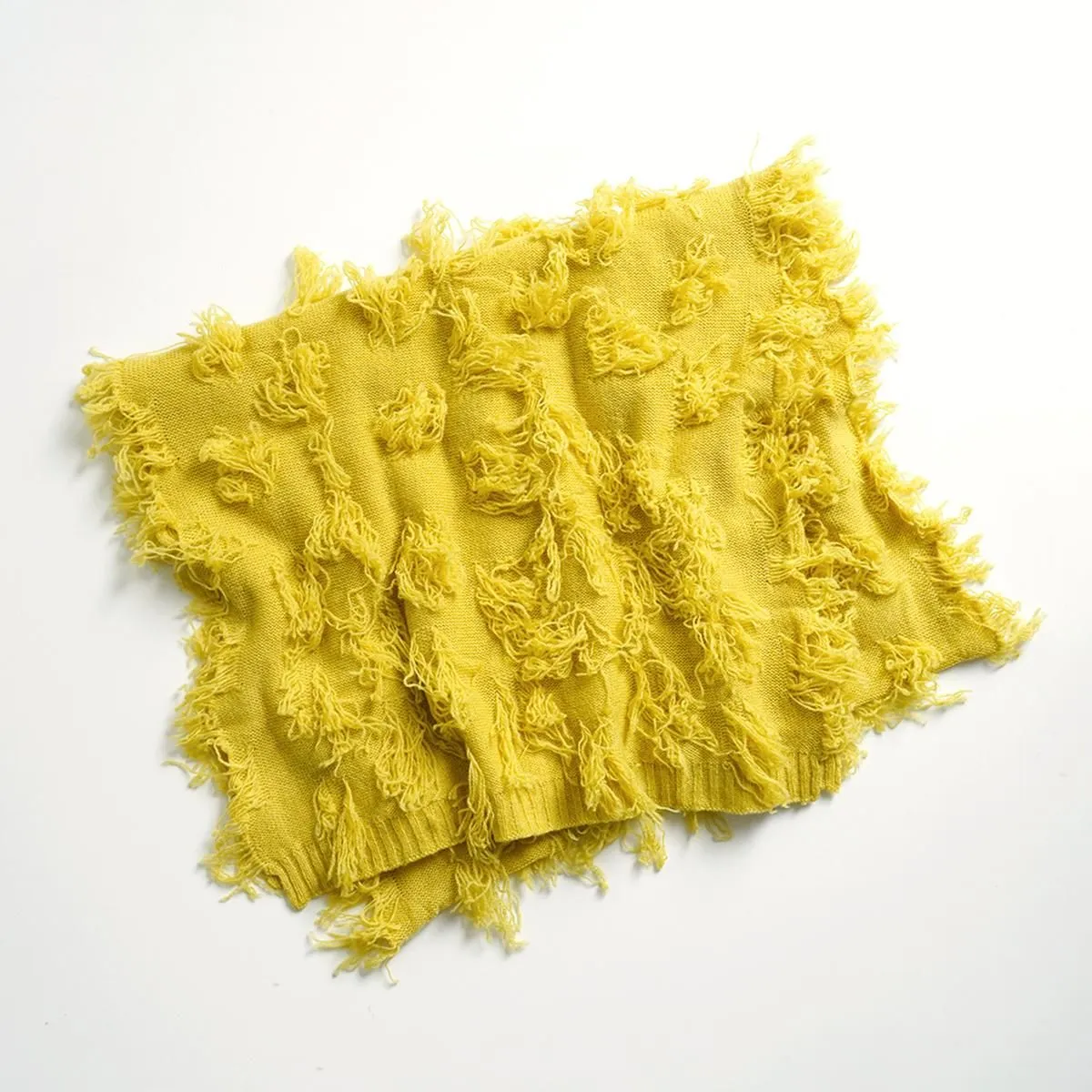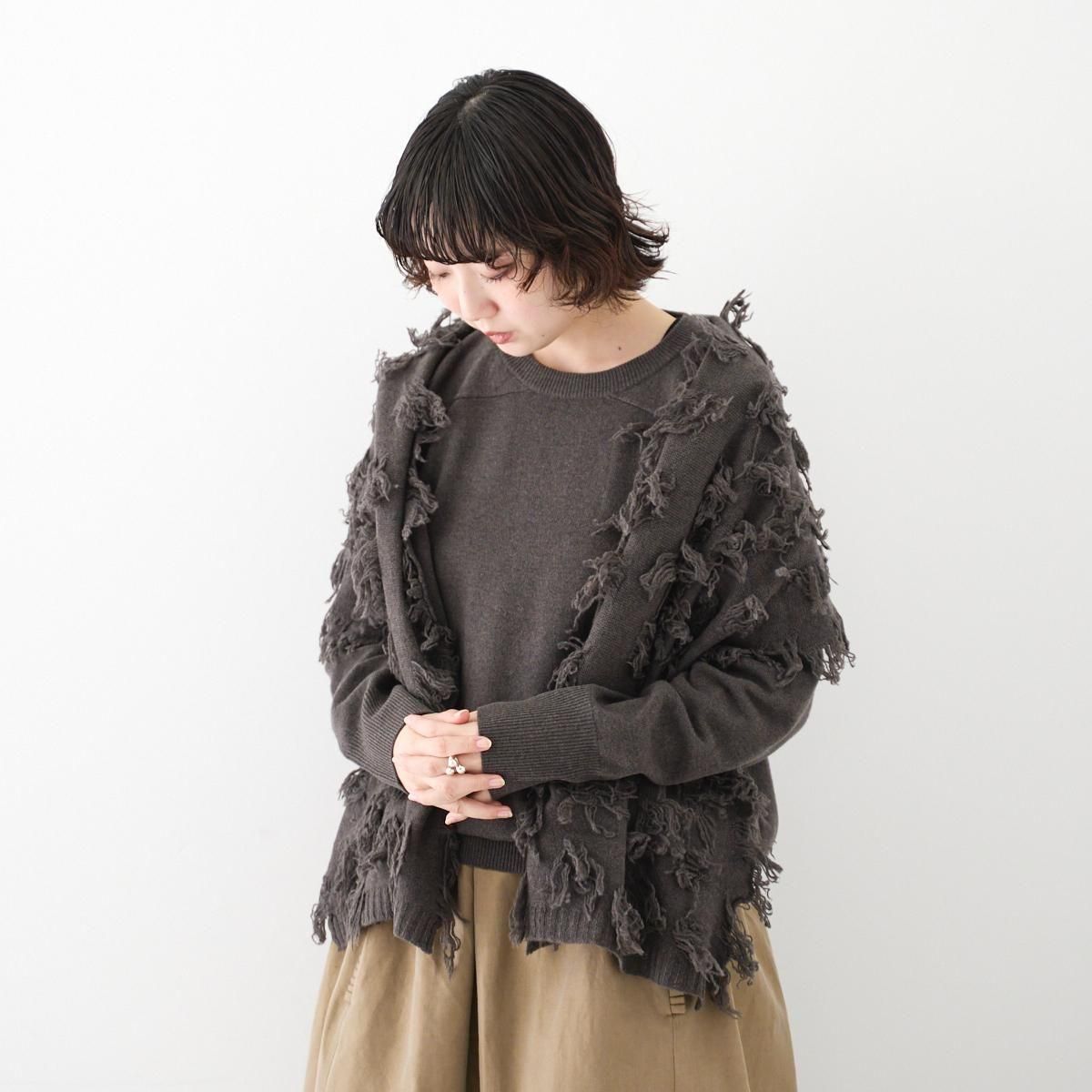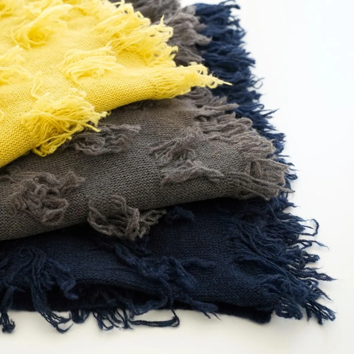 柔らかなラムウールの素材感をふんだんに活かしたフリンジストール。ふんわり繊細な毛糸が動きのある印象を与えてくれます。首に巻くのはもちろん、広げてサッと肩に掛けるだけでも華やかにコーディネートが引き立てます。 大判ですが薄手でコンパクトに畳めるので、外出先でも邪魔にならず重宝します。上品でユニークな存在感のある一枚です。 25AW size:50cm×160cm ※サイズ計測の多少の誤差はご了承下さい。 color:イエロー・グレー・ネイビー material:ウール100% model:160cm 取扱い店舗・・・dieci kyutaro店2F ------------------------------------------------------- homspun|ホームスパン 2000年に3人の女性でスタートされたhomspun(ホームスパン) 「シンプルで自分たちが毎日着たいと思える服を」そんな彼女たちの思いから生まれたブランドです。 size_chart