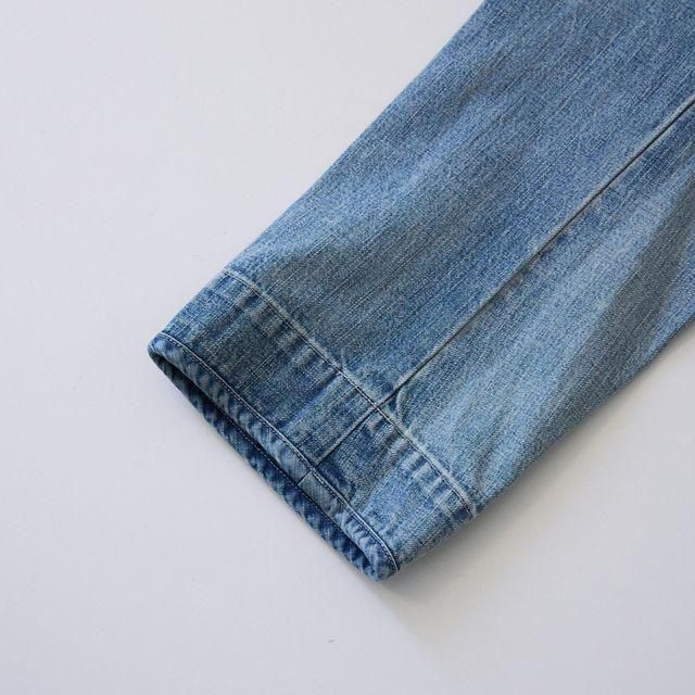 ハードな加工の中にも、どこかあたたかみを感じさせるCANNERY ROW DENIMのチャイニーズジャケット。 長年はき込んだような柔らかさが魅力の、PORTER CLASSICオリジナルデニム生地を使用しています。肌馴染みがよく、デニムとは思えないほどやさしいはき心地を実現。アメリカ西海岸の空気感を纏ったような、独自のエイジング加工が印象的な一着です。明け方の空を思わせるような、柔らかく爽やかな“BLUE”が、美しく存在感のある佇まいを引き立てます。この一着でスタイリングが決まるほど存在感があるジャケット。シンプルなアイテムとの相性が抜群です。 25AW size:3 肩幅 54cm身幅 61cm 着丈 74cm 袖丈 59cm color:BLUE material:COTTON100% model: 163cm(#3) 取り扱い店舗・・・dieci 芝川ビル店 -------------------------------------------------------- PORTER CLASSIC(ポータークラシック) PORTER CLASSICは「世界基準のスタンダード」をコンセプトに掲げ、日本の伝統技術を生かしたものづくりを行うブランド。世代を問わず長く愛されるアイテムづくりを目指し、流行りにとらわれない普遍的なデザインを提案しています。映画や芸術など、文化的な背景を感じさせる佇まいも魅力のひとつ。また、日本の職人とともに歩み、その技術を次世代へ継承することにも力を注いでいます。アイテムだけではなく、製造環境や過程にまでこだわる姿勢が、PORTER CLASSICらしさを形づくっています。