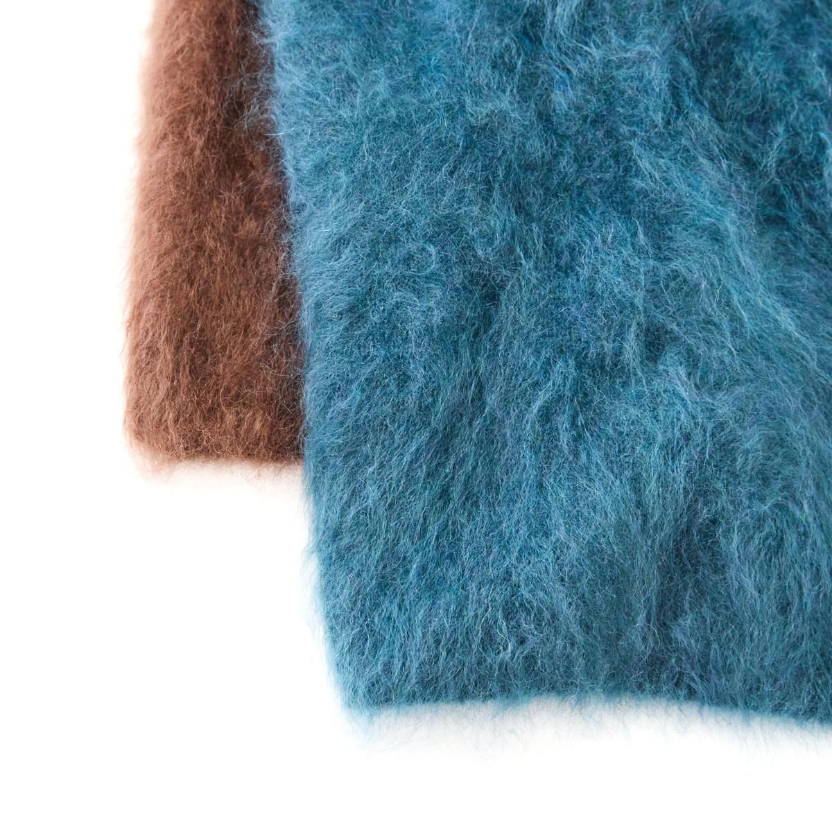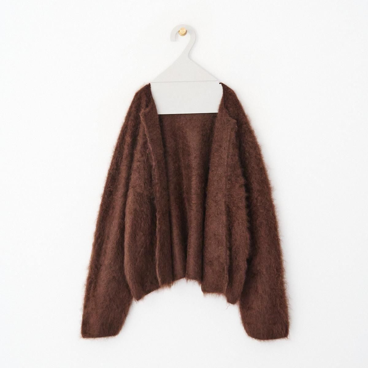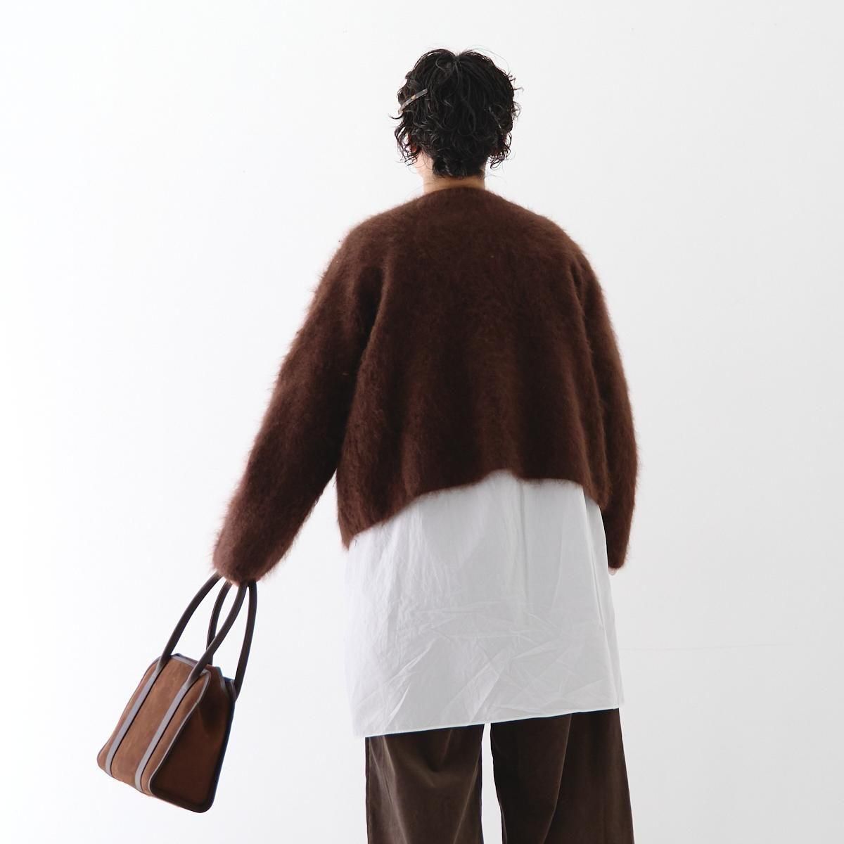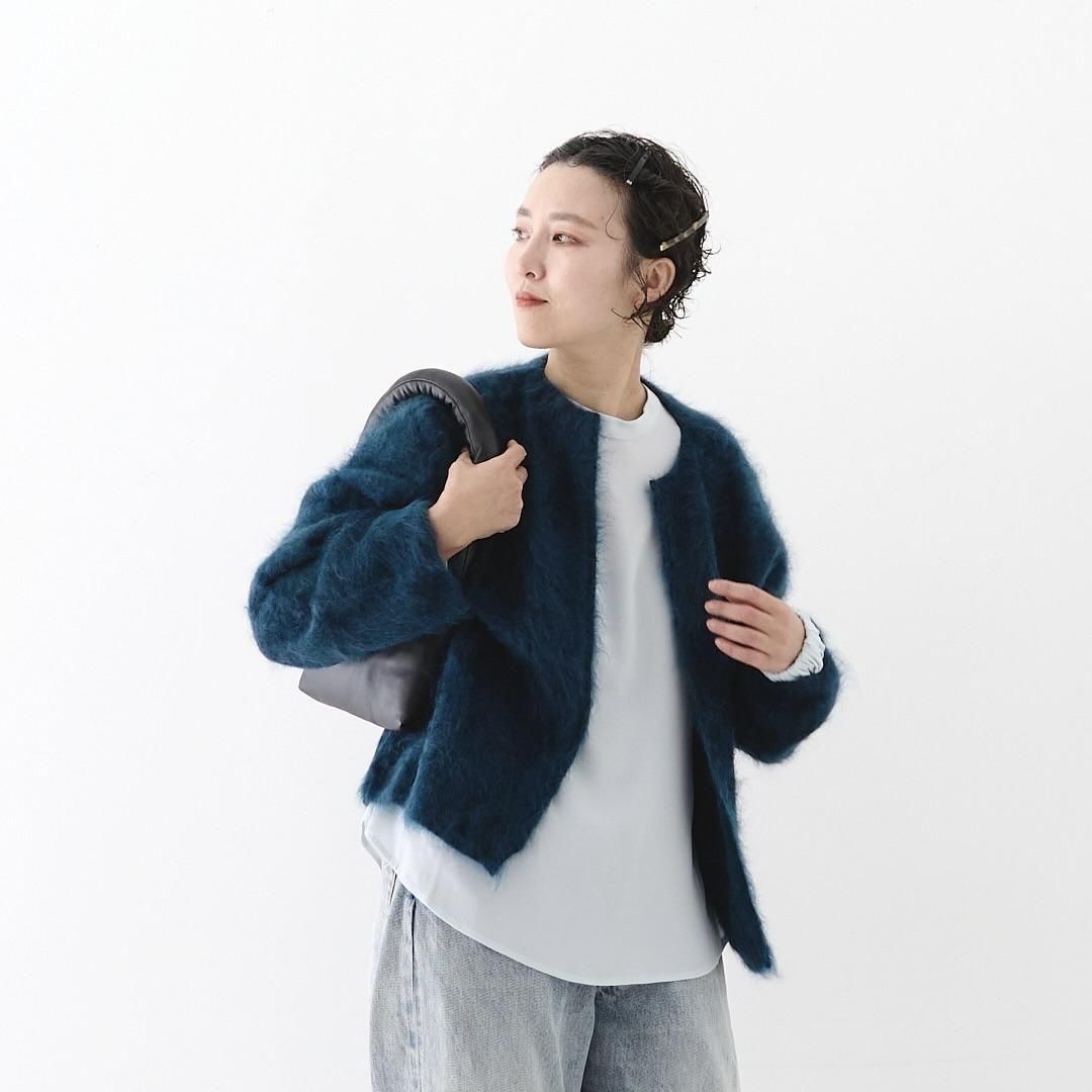 カシミヤ起毛のふんわりとした毛足が華やかな、主役級のカーディガン。 24AWで大人気だったカシミヤファーカーディガン。 着丈を短く、身幅をゆったりとさせてブラッシュアップしました。 寒い時期でもジャケット感覚で暖かく着用できます。 今季は新色のブラウンが登場。 コーディネートが華やぐアイテムです。ホールガーメント仕様。 ホールガーメントでシームレスに仕立てているので、とても着心地が良い仕上がりです。 上質のカシミヤ100%素材を使用しており、カシミヤ特有の風合いを最も醸し出す、特別な技術のファー加工を1枚1枚手作業で施し、より滑らかに毛足も出してふんわり仕上げられています。滑らかなカシミアは驚くほど暖かく、まるで優しく包まれているよう。 ボタンレスで、程よくゆったりしたサイズ感なので、寒い時期でもセーター等とレイヤードしてジャケット感覚で着ていただけます。 何年もお手入れしながらずっと大切に着ていただきたいカーデガンです。 color:栗梅色/くりうめいろ(ブラウン)、 青緑色(グリーン)、紺青色(ネイビー) ※ネイビーは14枚目の生地アップ画像のみ size:サイズ2 (フリー) 着丈 57cm 肩幅 42cm 身幅 58cm 袖丈 55cm 裾幅 52cm 参考寸法(平置き) 1点1点個体差がございます。 material:カシミヤ 100% ※数回着ていただいたら、洋服ブラシ(馬毛等)でブラッシングをして頂く事によって、汚れや毛玉を防いで艶々になります。 ※手洗いすると、ふんわりやわらかな手触りになります。 ※干すときにハンガーにかけてしまうと形が崩れてしまうので、横に広げて干してください。 model:163cm 取り扱い店舗・・・dieci芝川ビル店 ------------------------------------------------------- fruits of life |フルーツオブライフ スタイリスト 大橋利枝子さんが作り、選んだ衣服と暮らしまわりのものを提案しているブランドです。心から大切に思えるものだけを少しだけ。日々の生活にたわわな実りをもたらしますようにと思いを込められたモノたちをご紹介します。 size_chart