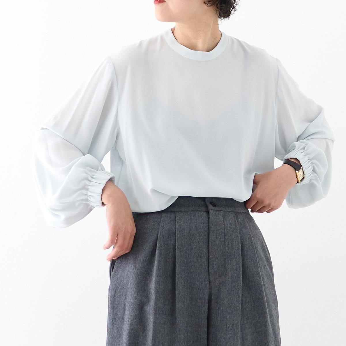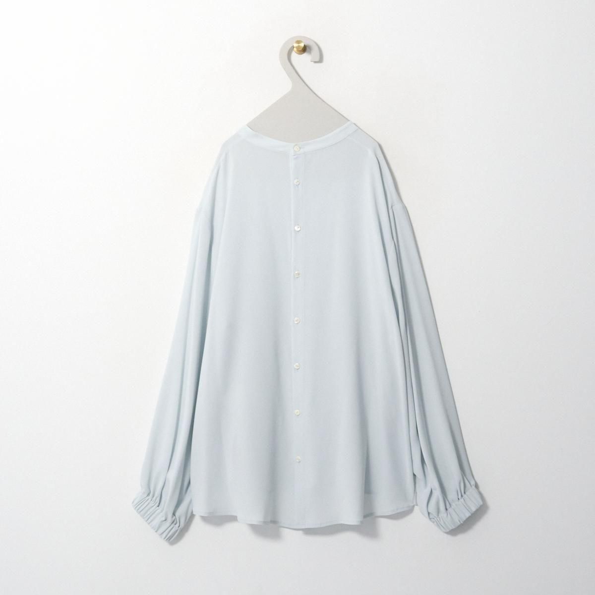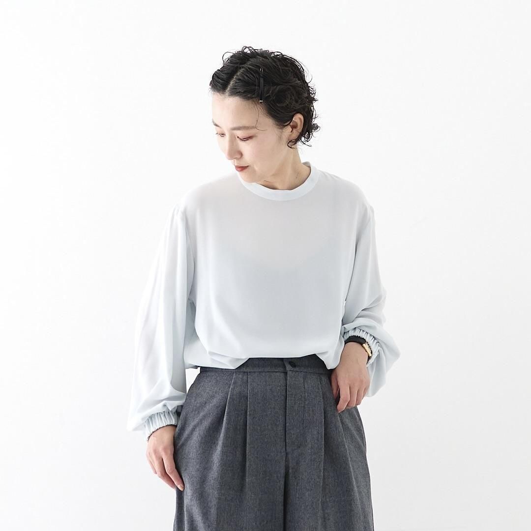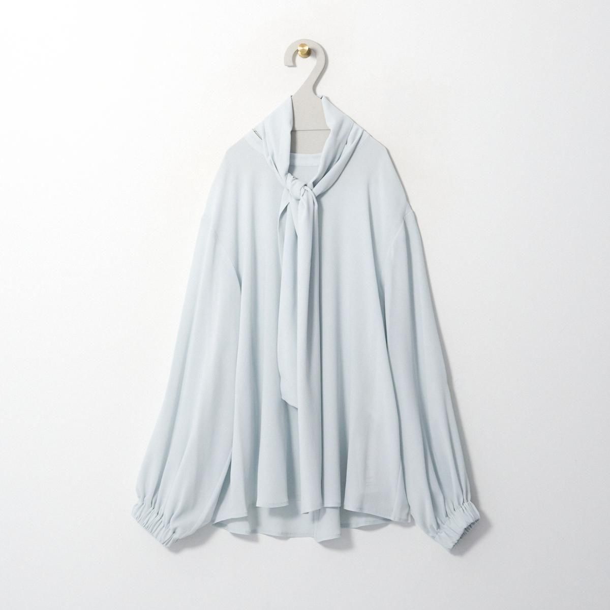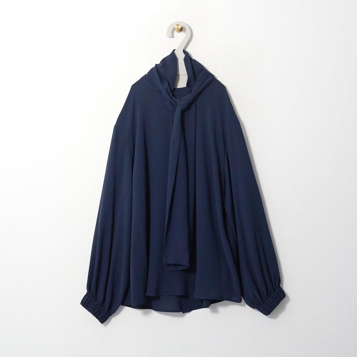 ゆったりとしたシルエットのスカーフ付きブラウスです。 ボウタイよりボリュームのある太さのスカーフがついています。スカーフの巻き方でアレンジが楽しめます。スカーフを外せば、えりもとが詰まり過ぎないクルーネックになります。後ろボタンがアクセントになり、背中がすっきりと見えます。 肩まわりはゆとりのあるドロップショルダー。袖口がゴム仕様のボリュームスリーブは袖丈を気にせずに着れます。袖口をたくし上げれば、パフスリーブになります。 裾は緩やかなカーブになっていて、裾を出して着ても、美しくまとまるようにデザインされてます。 素材はトリアセテート特有のドレープ性に、パウダリー感とふくらみ感を兼ね備えた質感。さらっとした肌触りで、柔らかく落ち感の生地で、シーズンレスで着ていただけます。 *お手入れはドライクリーニングを推奨します。 (オフィシャルより引用) size:2(フリー) 着丈65cm/肩幅43.5cm/身幅53cm/袖丈54cm/袖幅45cm/袖口幅25cm/裾幅61cm スカーフ: 横幅15cm/長さ148cm 参考寸法(平置き) 1点1点個体差がございます。 material:トリアセテート 65%・ポリエステル 35% color:白藍色(ライトブルー)・紺色(ネイビー) model:163cm 取扱店:芝川ビル店 ------------------------------------------------------- fruits of life |フルーツオブライフ スタイリスト 大橋利枝子さんが作り、選んだ衣服と暮らしまわりのものを提案しているブランドです。心から大切に思えるものだけを少しだけ。日々の生活にたわわな実りをもたらしますようにと思いを込められたモノたちをご紹介します。 size_chart
