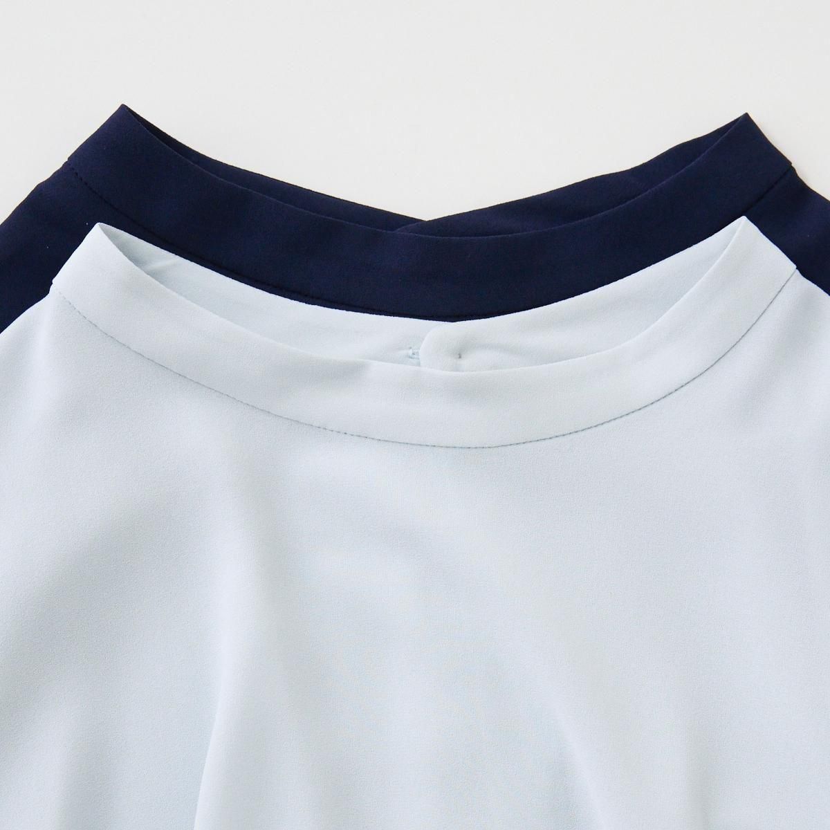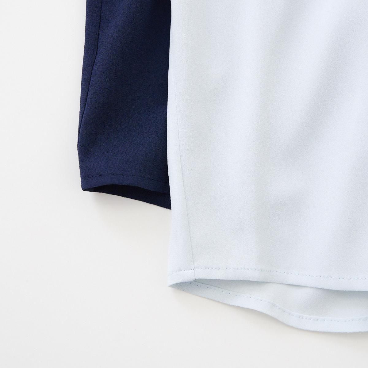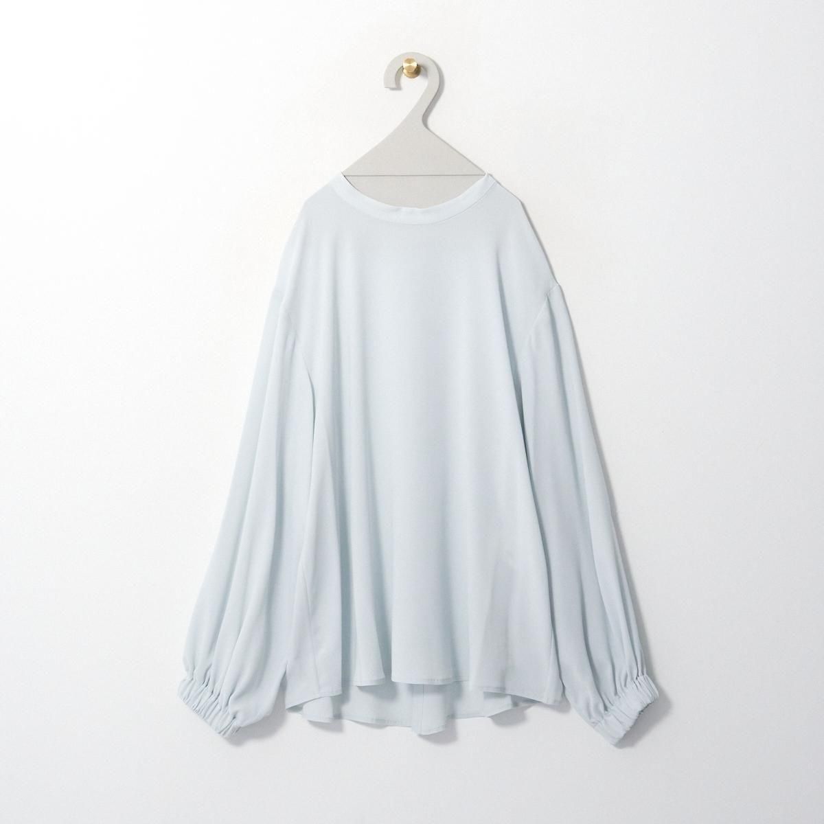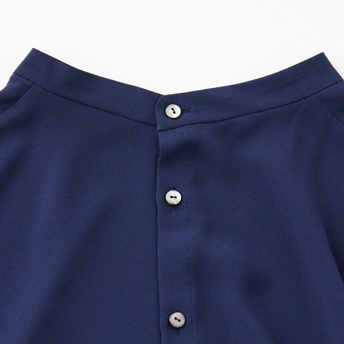 ゆったりとしたシルエットのスカーフ付きブラウスです。 ボウタイよりボリュームのある太さのスカーフがついています。スカーフの巻き方でアレンジが楽しめます。スカーフを外せば、えりもとが詰まり過ぎないクルーネックになります。後ろボタンがアクセントになり、背中がすっきりと見えます。 肩まわりはゆとりのあるドロップショルダー。袖口がゴム仕様のボリュームスリーブは袖丈を気にせずに着れます。袖口をたくし上げれば、パフスリーブになります。 裾は緩やかなカーブになっていて、裾を出して着ても、美しくまとまるようにデザインされてます。 素材はトリアセテート特有のドレープ性に、パウダリー感とふくらみ感を兼ね備えた質感。さらっとした肌触りで、柔らかく落ち感の生地で、シーズンレスで着ていただけます。 *お手入れはドライクリーニングを推奨します。 (オフィシャルより引用) size:2(フリー) 着丈65cm/肩幅43.5cm/身幅53cm/袖丈54cm/袖幅45cm/袖口幅25cm/裾幅61cm スカーフ: 横幅15cm/長さ148cm 参考寸法(平置き) 1点1点個体差がございます。 material:トリアセテート 65%・ポリエステル 35% color:白藍色(ライトブルー)・紺色(ネイビー) model:163cm 取扱店:芝川ビル店 ------------------------------------------------------- fruits of life |フルーツオブライフ スタイリスト 大橋利枝子さんが作り、選んだ衣服と暮らしまわりのものを提案しているブランドです。心から大切に思えるものだけを少しだけ。日々の生活にたわわな実りをもたらしますようにと思いを込められたモノたちをご紹介します。 size_chart