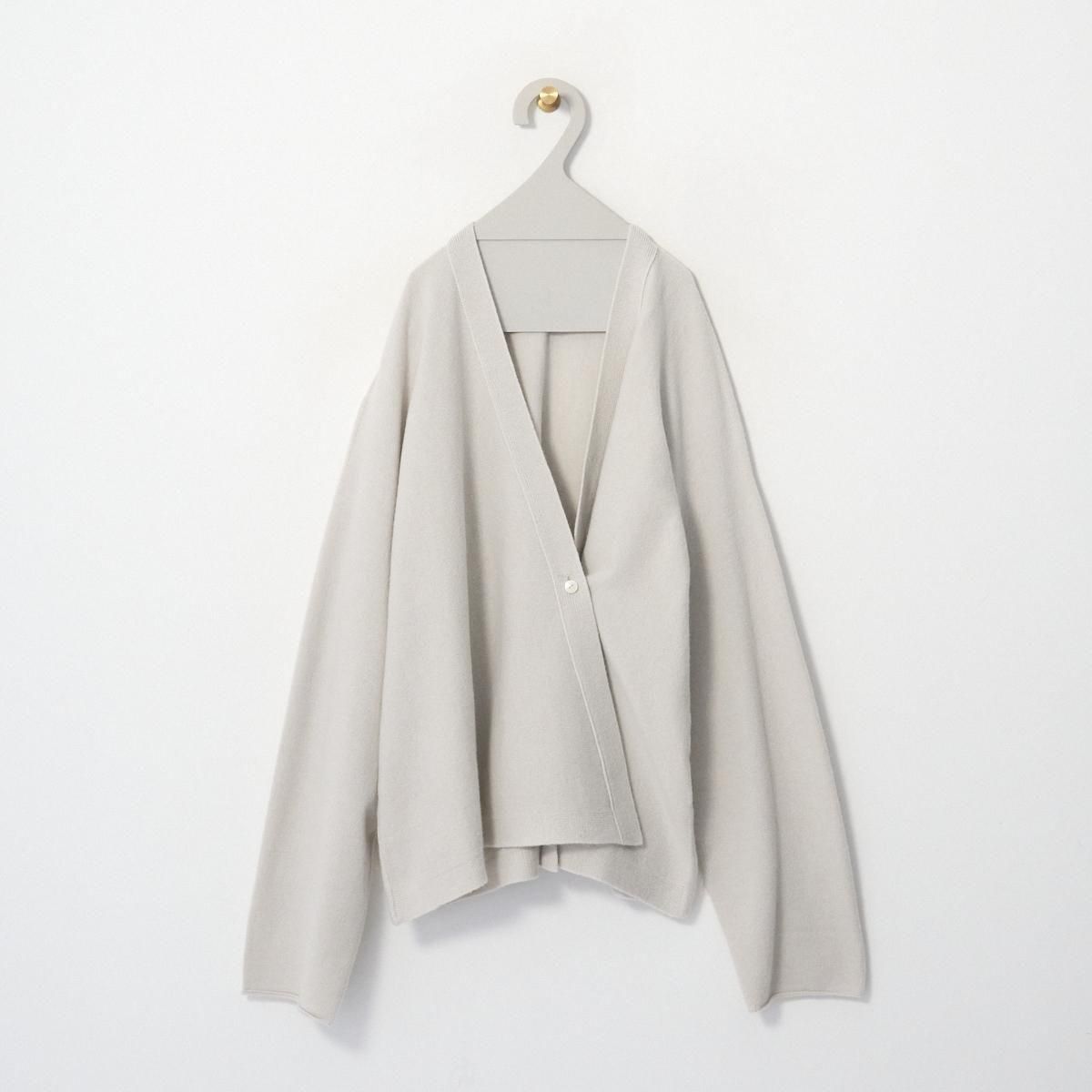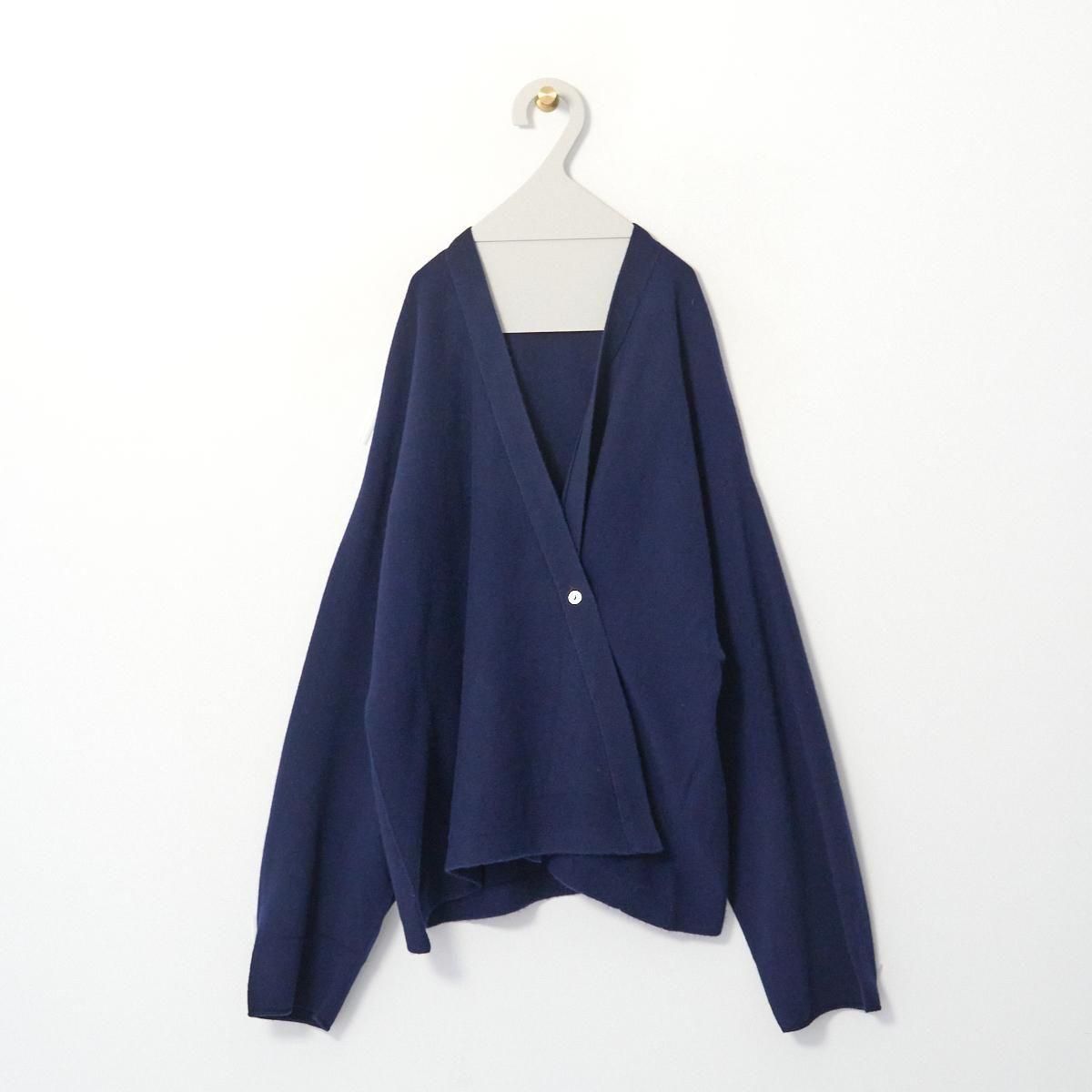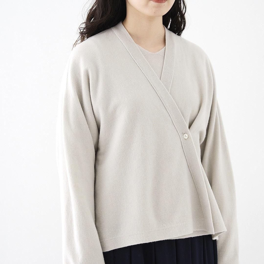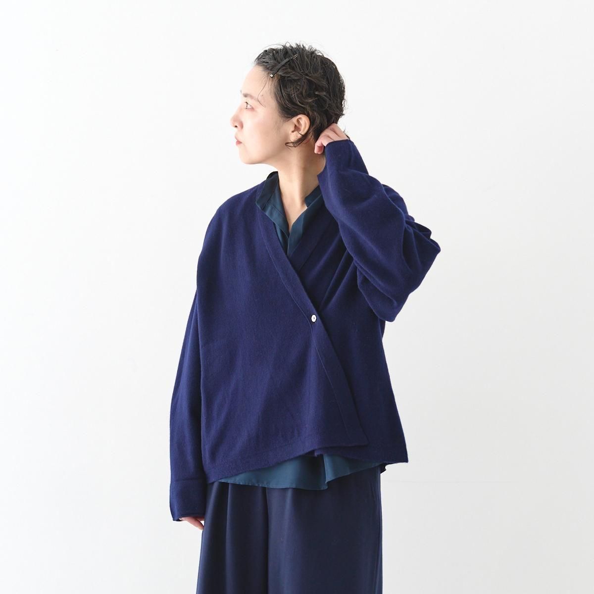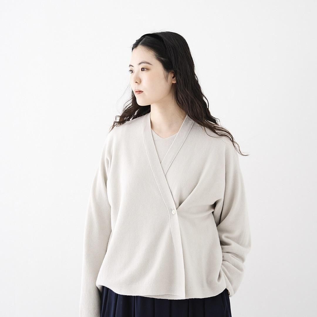 さらりと羽織れるAラインシルエットのカシュクール風ローブはエレガントでニュアンスのある一枚。ボタンをとめるとジャケットのような着こなしに。 全体的にゆったりとしたデザインで、袖も太いので、インナーを選ばずに着用できます。 Vネックニットと合わせるとアンサンブルになります。 素材は、南米・ウルグアイで育てられた、希少性の高い羊の最高品質の毛糸で編まれています。カシミヤ並みの細さの毛糸は、しっとりとして程よい弾力感がある肌触り。空気を含む事でふっくらとし、暖かく、柔らかさと滑らかでしなやかな風合いは、素肌にも着られる程の最高の着心地。驚くほど気持ちの良いニットです。 *手洗い可能。 洗うことでふんわりやわらかな手触りになります。干すときにハンガーにかけてしまうと形が崩れてしまうので、横に広げて干してください。 (オフィシャルより引用) size:2(フリー) 着丈 58cm 肩幅 54cm 身幅 60cm 袖丈 54cm 袖幅 24cm 袖口幅 14cm 裾幅 59cm 参考寸法(平置き) 1点1点個体差がございます。 material:ウルグアイウール 100% color:灰白色(ベージュ)・紺藍色(ネイビー) model:163cm,170cm 取扱店:芝川ビル店 ------------------------------------------------------- fruits of life |フルーツオブライフ スタイリスト 大橋利枝子さんが作り、選んだ衣服と暮らしまわりのものを提案しているブランドです。心から大切に思えるものだけを少しだけ。日々の生活にたわわな実りをもたらしますようにと思いを込められたモノたちをご紹介します。 size_chart
