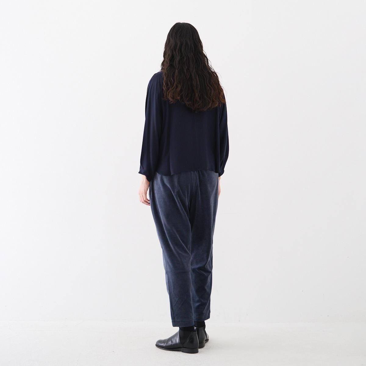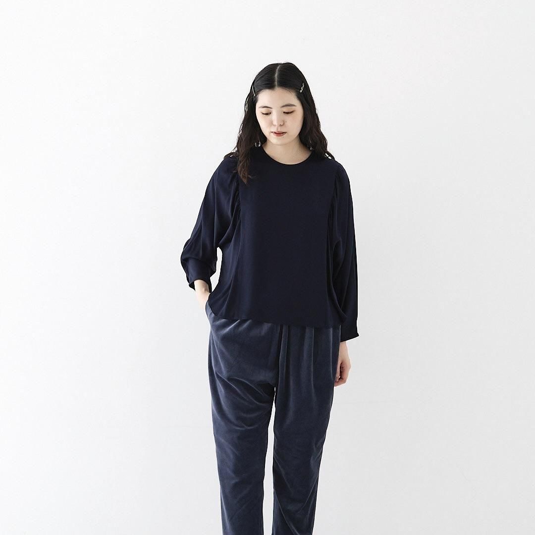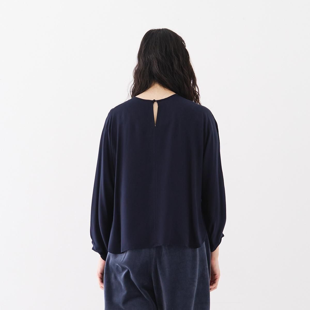 ギャザーの入ったドルマンスリーブが印象的なブラウス。後ろ前、両面でお召し頂けます。 ゆったりとしたシルエットなので、体型を気にせず、楽な着心地です。ブラウスの後ろの裾が少し長めのデザインなので、裾を出してもバランス良く着こなせます。ボタンを前にすると、シンプルでカジュアルな印象。袖口はタックが入り、パイピングで仕上げています。 使用しているスパンキュプラは 光沢が上品な印象の生地です。汗を素早く吸って拡散できるので、暑い夏場でもいつもサラサラの着心地を味わっていただけます。また手軽に洗えてシワになりにくいのも便利です。 *手洗い可能。 ご家庭で洗濯可能ですが、摩擦に弱いので生地を擦らないように注意して、優しく手洗いして下さい。 汗をかいたら、ハンガーにつるして、汗を飛ばして下さい。またシーズンが終わる時にドライクリーニングにだしていただければ、綺麗に保てます。 (オフィシャルより引用) size:2(フリー) 前着丈 55cm 後着丈 59cm 身幅 59cm 袖口幅 12cm 参考寸法(平置き) 1点1点個体差がございます。 material:キュプラ 100% color:留紺色/とめこんいろ(ネイビー) model:170cm 取扱店:芝川ビル店 ------------------------------------------------------- fruits of life |フルーツオブライフ スタイリスト 大橋利枝子さんが作り、選んだ衣服と暮らしまわりのものを提案しているブランドです。心から大切に思えるものだけを少しだけ。日々の生活にたわわな実りをもたらしますようにと思いを込められたモノたちをご紹介します。 size_chart