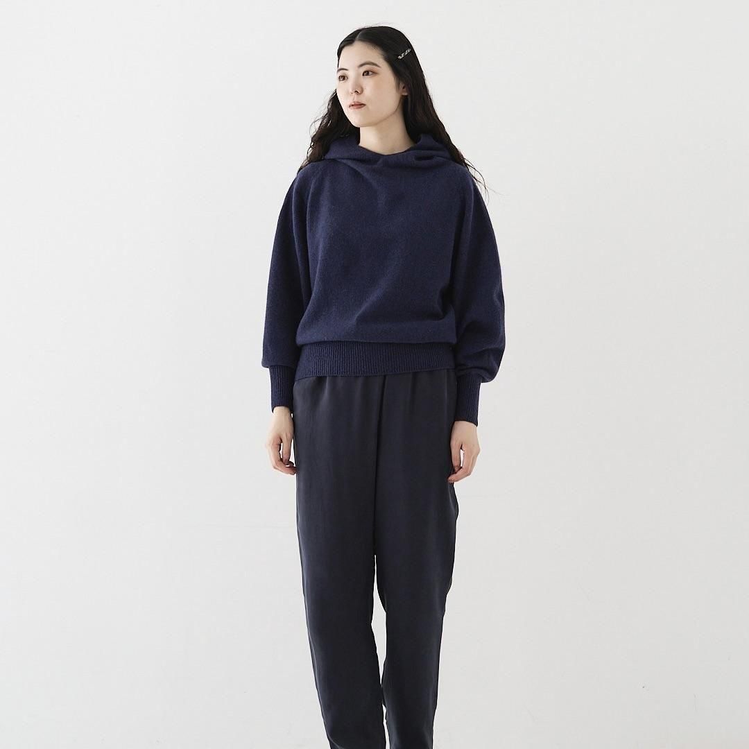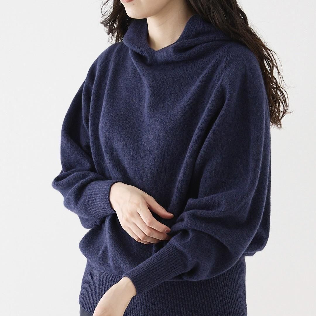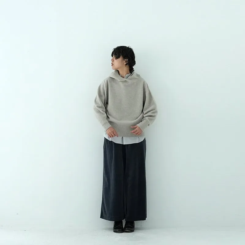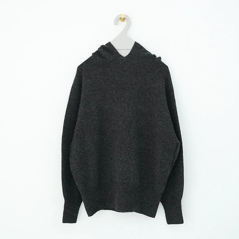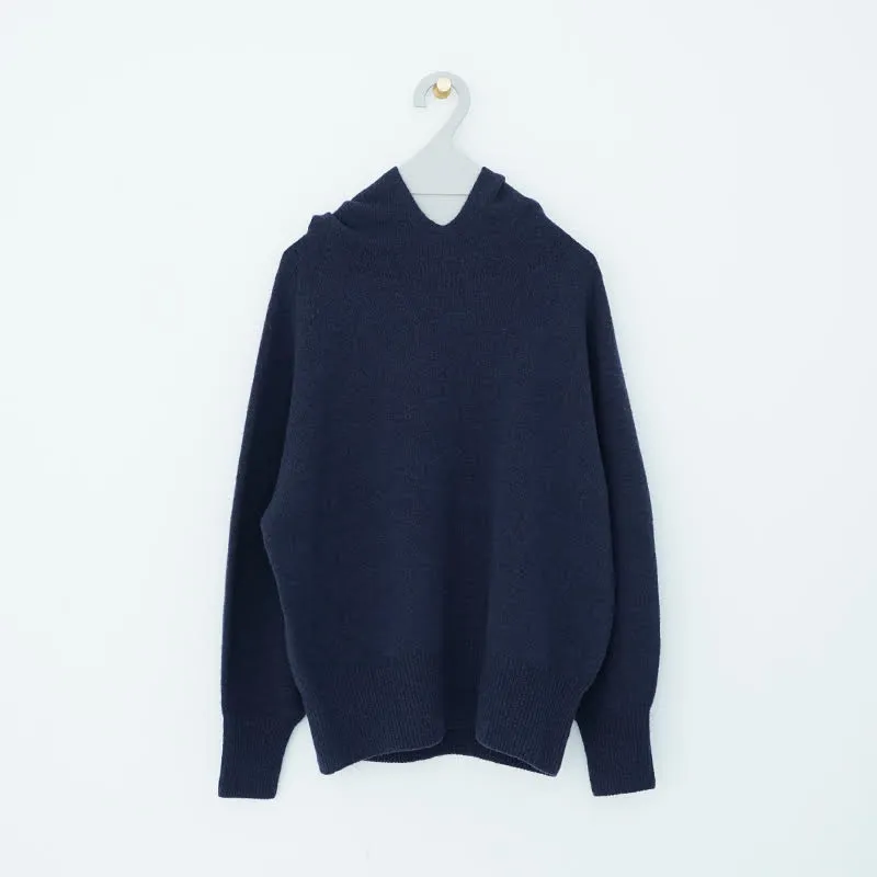 立体感のあるシルエットをホールガーメントでシームレスに仕立てた、とても着心地の良いフーディーです。 上質なウールにカシミヤとシルクで、軽さとしなやかさがあり、ふんわりとやさしい風合いのニットに。少し立ち上がりのある襟元でフードがしっかり立ち、顔周りが華やかな印象になります。立体的なパフスリーブ、ボトムとバランスの取りやすいショート丈。 ゆったりしたラグランスリーブの袖まわりは、コートを羽織ってもストレスのない分量にされています。カジュアルでスポーティーなパーカーとはまた違った、大人の女性のためのフーディーです。 ※手洗いするとさらにふんわりと柔らかな肌触りになります。 ※干すときにハンガーにかけてしまうと形が崩れてしまうので、横に広げて干してください。 color:灰色(チャコールグレー),瞑色(ネイビー),白茶色(ベージュ) size:サイズ2 (フリー) 着丈59cm 身幅 58cm 袖64cm 裾幅 44cm 参考寸法(平置き) 1点1点個体差がございます。 material:ウール80% カシミヤ10% シルク10% model:163cm,170cm ------------------------------------------------------- fruits of life |フルーツオブライフ スタイリスト 大橋利枝子さんが作り、選んだ衣服と暮らしまわりのものを提案しているブランドです。心から大切に思えるものだけを少しだけ。日々の生活にたわわな実りをもたらしますようにと思いを込められたモノたちをご紹介します。 size_chart