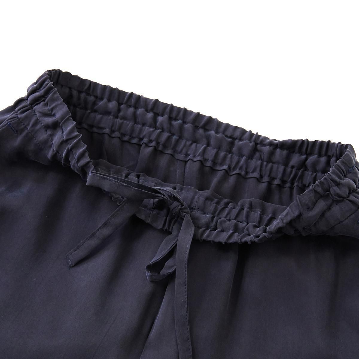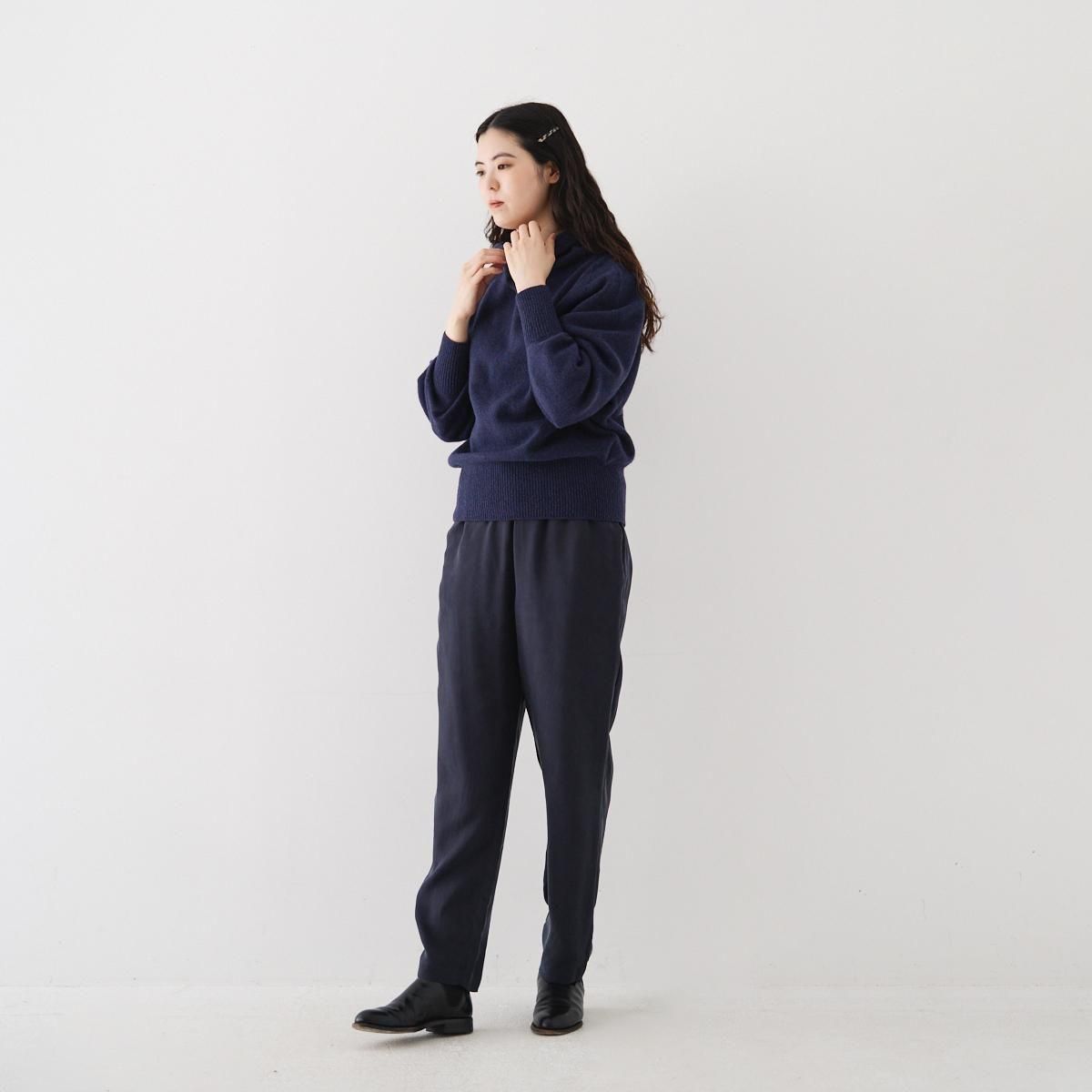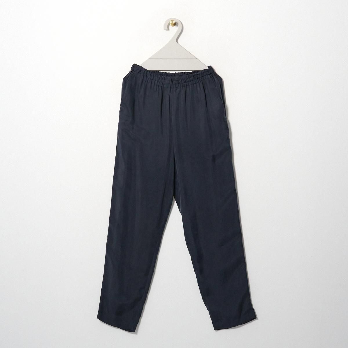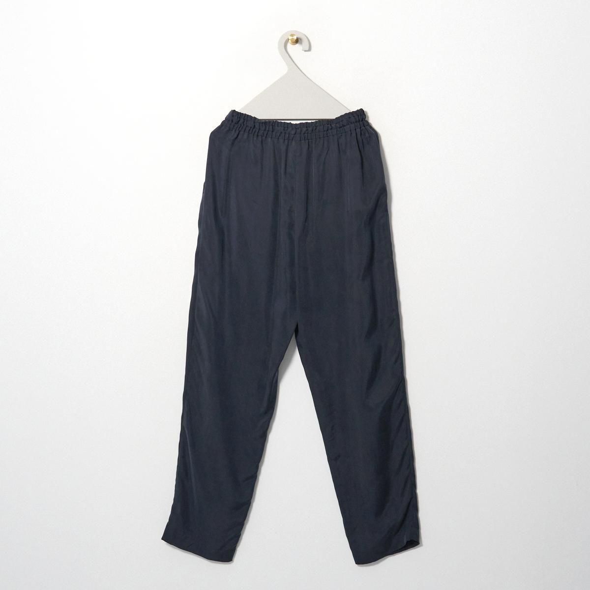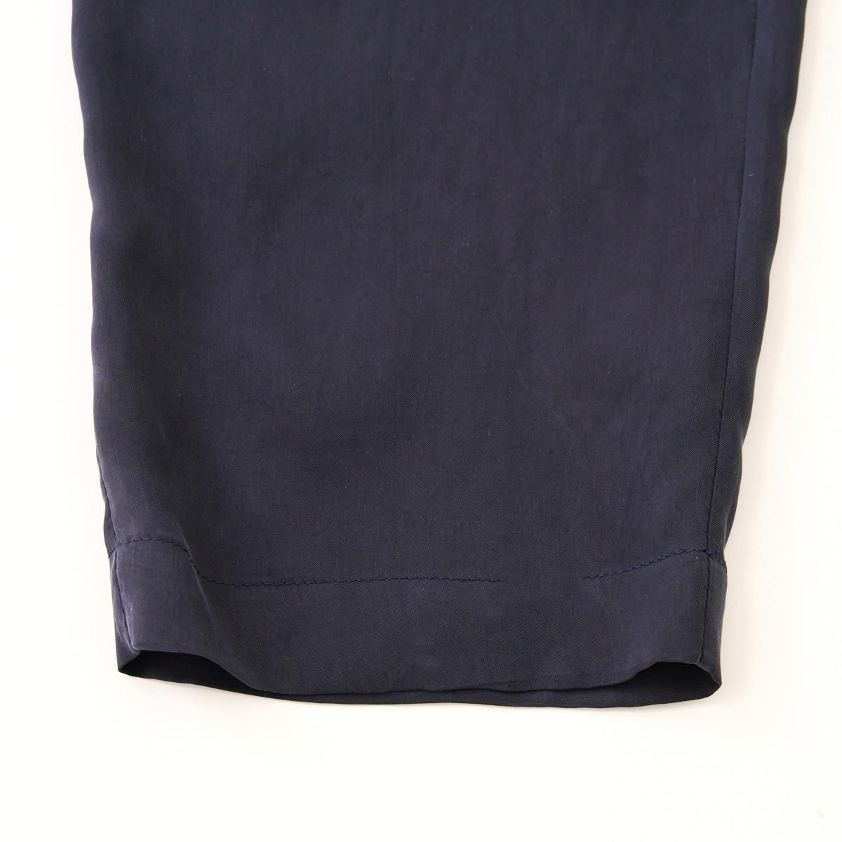 ベーシックでメンズライクなテーパードパンツ。キュプラは柔らかく、落ち感があるので、ゆったりした雰囲気で履いていただけます。また裾をロールアップして履くと、よりバランス良くまとまります。ウエストはゴムと紐で調整する仕様で、サイズはワンサイズ。シーズンレス、着る人を選ばない、コーディネートしやすい、便利なパンツです。 素材は柔らかく、肌触りの良いシルキータッチな着心地のキュプラ地。夏も涼しく、オールシーズン活躍できます。少し光沢があるのでエレガントなイメージで、 しなやかな落ち感があるのも特徴のひとつです。 ご家庭で洗濯可能ですが、摩擦に弱いので生地を擦らないように注意して、優しく手洗いして下さい。汗をかいたら、ハンガーにつるして、汗を飛ばし、シーズンが終わる時にドライクリーニングにだしていただければ、綺麗に保てます。 (オフィシャルより引用) size:2 (フリーサイズ) 着丈 116cm 肩幅 39cm 身幅 69cm 袖丈 52.5cm 天幅 17.5cm 裾幅 77cm 参考寸法(平置き) 1点1点個体差がございます。 material:キュプラ 100% color:紺ねず色(ネイビー) model:170cm 取扱店:芝川ビル店 ------------------------------------------------------- fruits of life |フルーツオブライフ スタイリスト 大橋利枝子さんが作り、選んだ衣服と暮らしまわりのものを提案しているブランドです。心から大切に思えるものだけを少しだけ。日々の生活にたわわな実りをもたらしますようにと思いを込められたモノたちをご紹介します。 size_chart