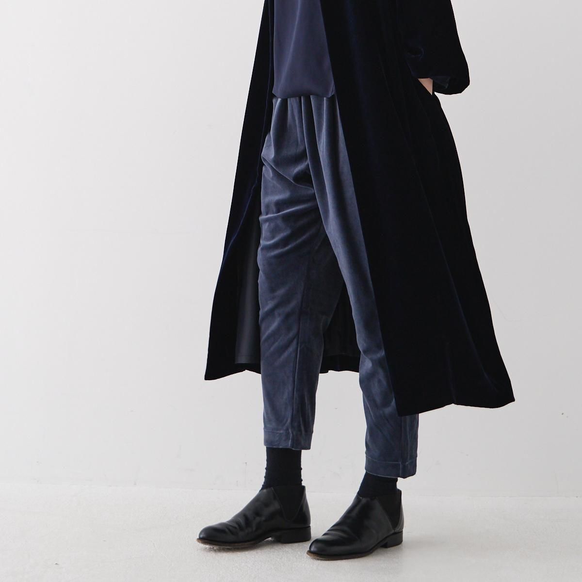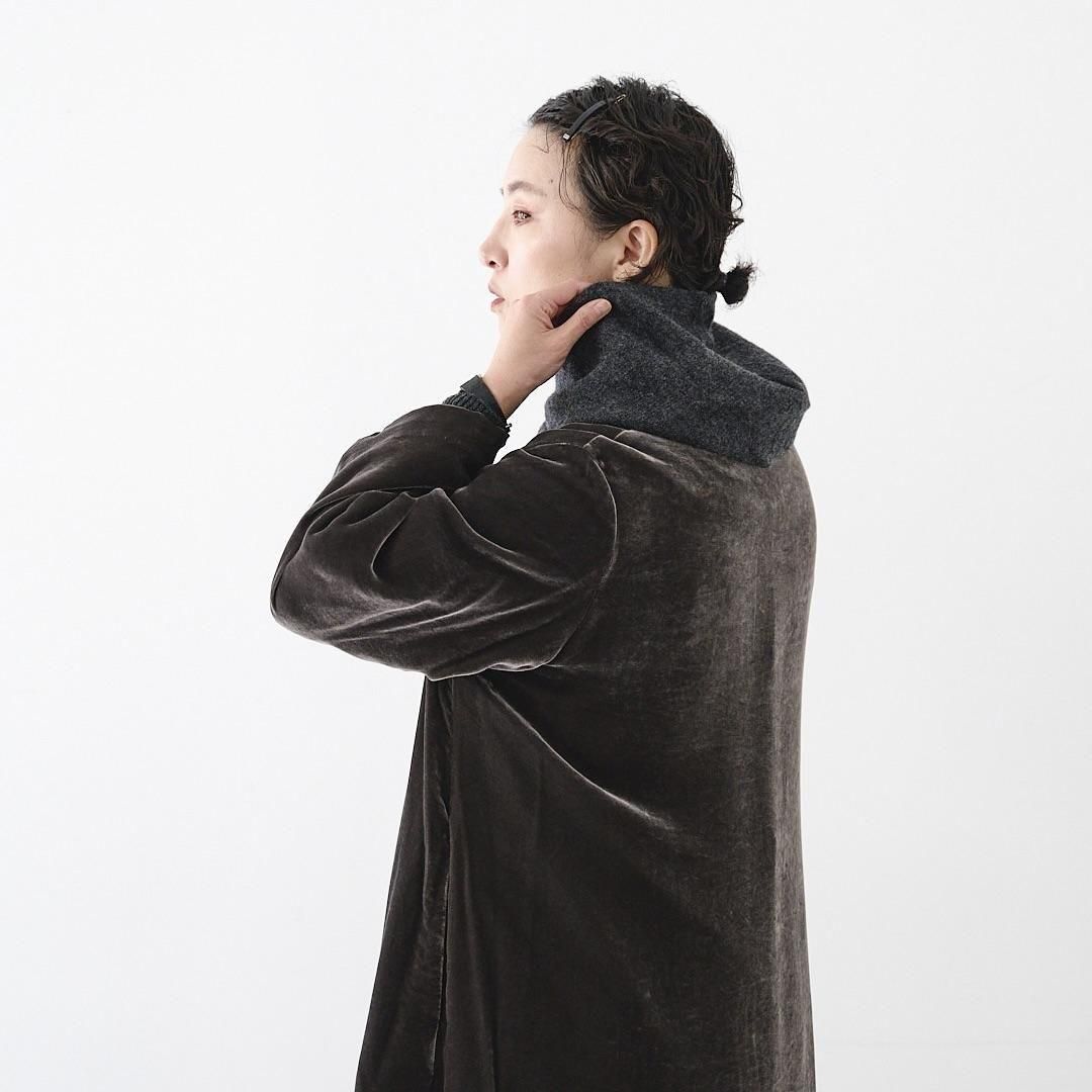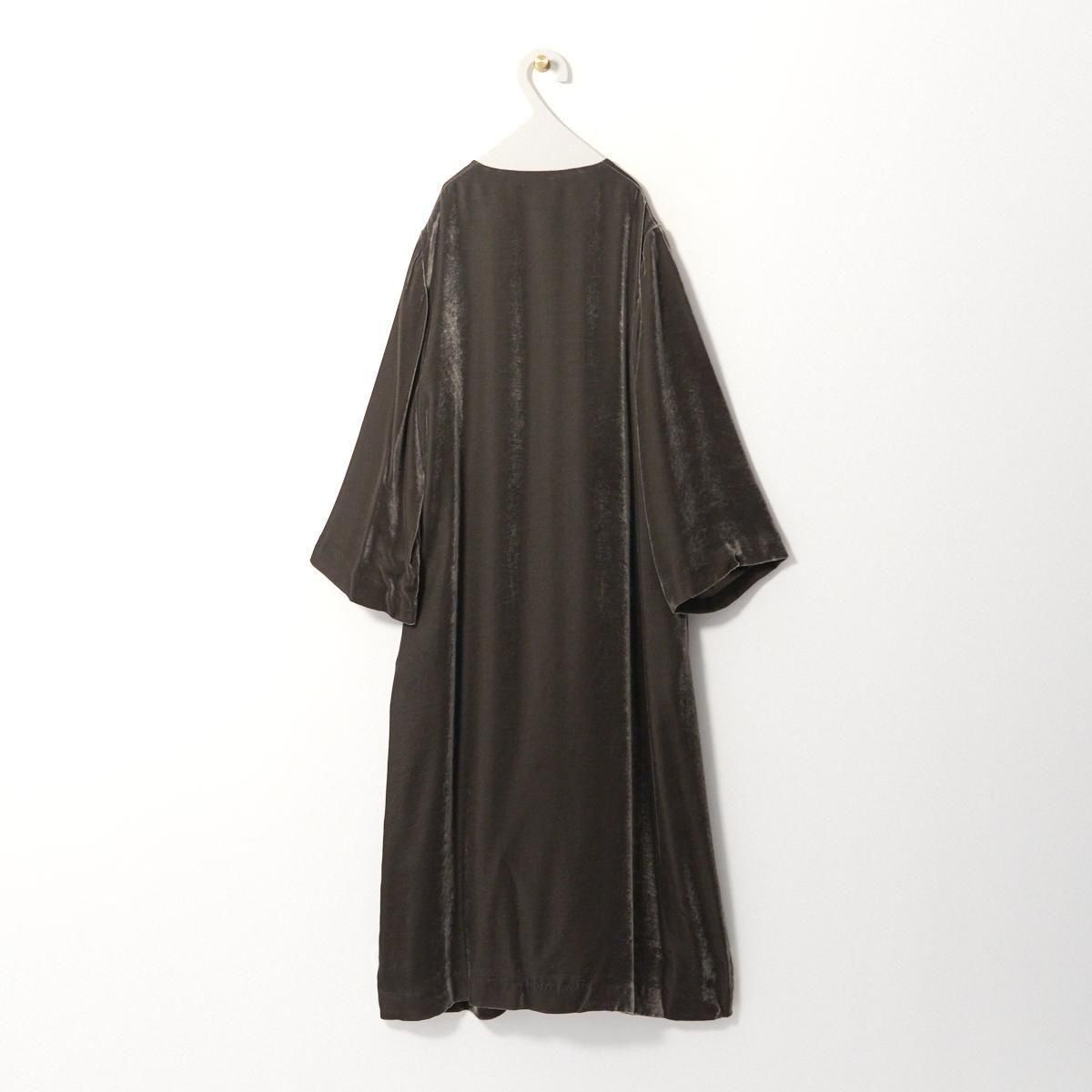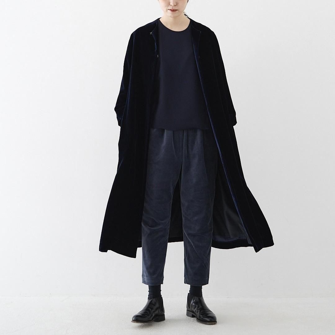 さっと羽織れるベルベット仕立てのローブコート。 薄手なので軽く、重ね着を楽しみながら初冬から春先まで活躍します。 どんなスタイルにも合わせやすいノーカラーと、女性らしいAラインのシルエットがポイント。光沢のある上質なベロア素材は特別な存在感です。 裏地付きで、胸元に二箇所ホックがついているので、前を閉じても着ることも。 シンプルなパンツスタイルやワンピースとも相性がよく、一枚持っておくと便利なアイテムです。 color:茶ねず色(グレージュ),紺青色(ネイビー) size:2(フリーサイズ) 着丈118cm 肩幅39.5cm 身幅59cm 袖丈48cm material:レーヨン67% キュプラ33% ドライクリーニング model:163cm,170cm お取り扱い店舗・・・dieci芝川ビル店 ------------------------------------------------------- fruits of life |フルーツオブライフ スタイリスト 大橋利枝子さんが作り、選んだ衣服と暮らしまわりのものを提案しているブランドです。心から大切に思えるものだけを少しだけ。日々の生活にたわわな実りをもたらしますようにと思いを込められたモノたちをご紹介します。 size_chart