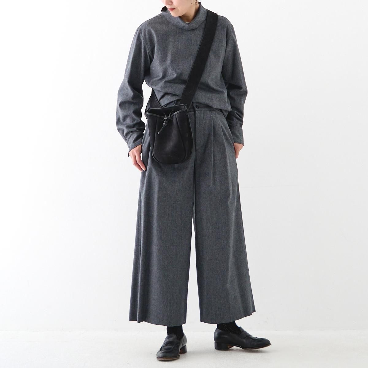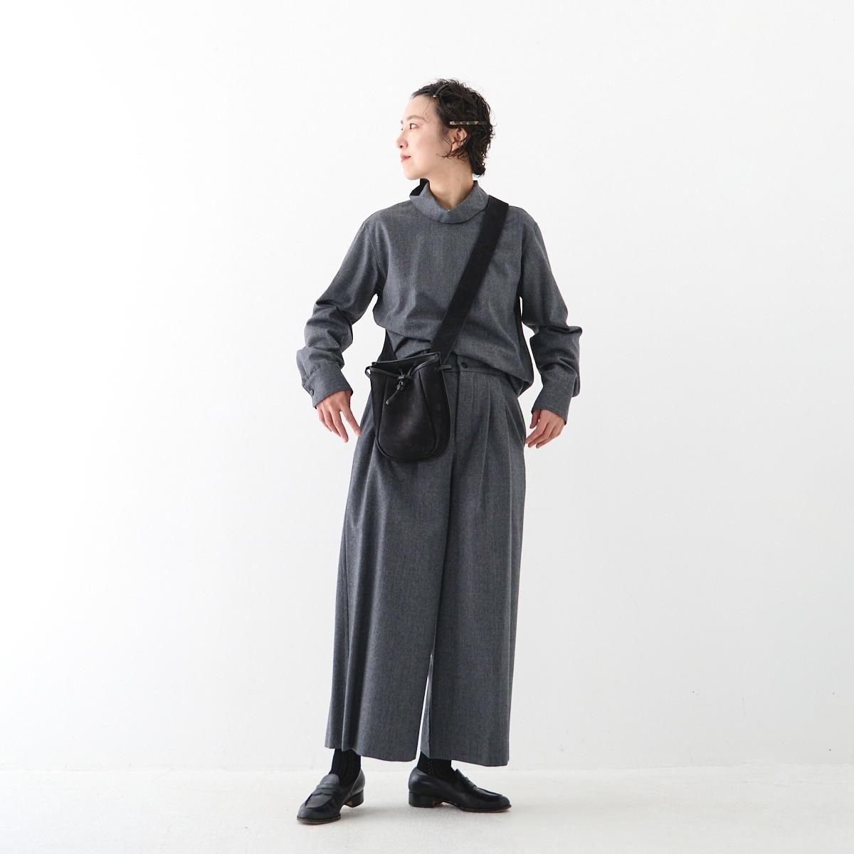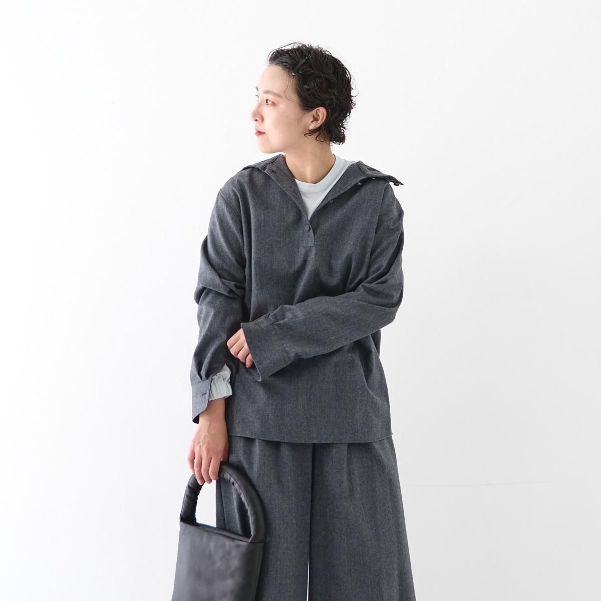 しなやかで上質な薄手のウール素材で仕立てたエレガントな1枚。 そのまま着ると後ろボタンのハイネックシャツ、後ろ前に着るとスキッパーシャツのような大きな襟になる2WAYシャツになっています。 同素材のウールタックパンツとセットアップするとさらにシックな印象に。ウールが醸し出す柔らかなシルエットは、女性を美しく見せてくれます。 薄手で上質なウール100%の生地を使用し、繊維が細いので軽くて柔らかいのが特徴です。ウールタックパンツと同じ生地なのでセットアップで着ていただけます。 ドライクリーニング推奨。 (オフィシャルより引用) size:2 (フリーサイズ) 着丈68cm 肩幅43cm 身幅53cm 袖丈58.5cm 袖幅22cm 袖口幅11cm 裾幅53cm 参考寸法(平置き) 1点1点個体差がございます。 material:ウール 100% color:濃紺色(ネイビー)・消炭色(チャコールグレー) model:163cm,170cm 取扱店:芝川ビル店 ------------------------------------------------------- fruits of life |フルーツオブライフ スタイリスト 大橋利枝子さんが作り、選んだ衣服と暮らしまわりのものを提案しているブランドです。心から大切に思えるものだけを少しだけ。日々の生活にたわわな実りをもたらしますようにと思いを込められたモノたちをご紹介します。 size_chart