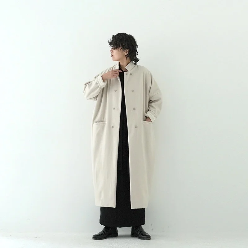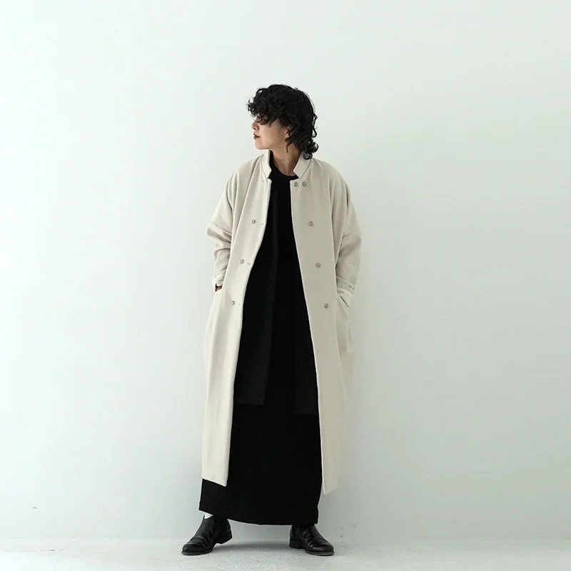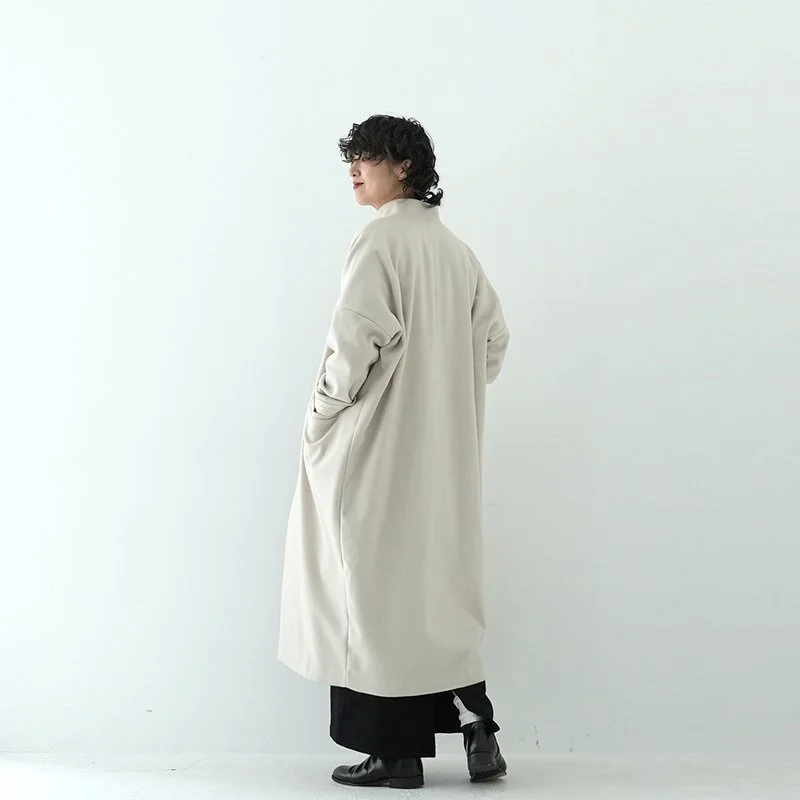 ゆったりとしたシルエットでドレープ感が美しいコートです。ボタンの留め方、開け方で雰囲気を変えていただけます。裏地はコットン生地の総裏地なので、お袖を少しロールアップしても素敵です。