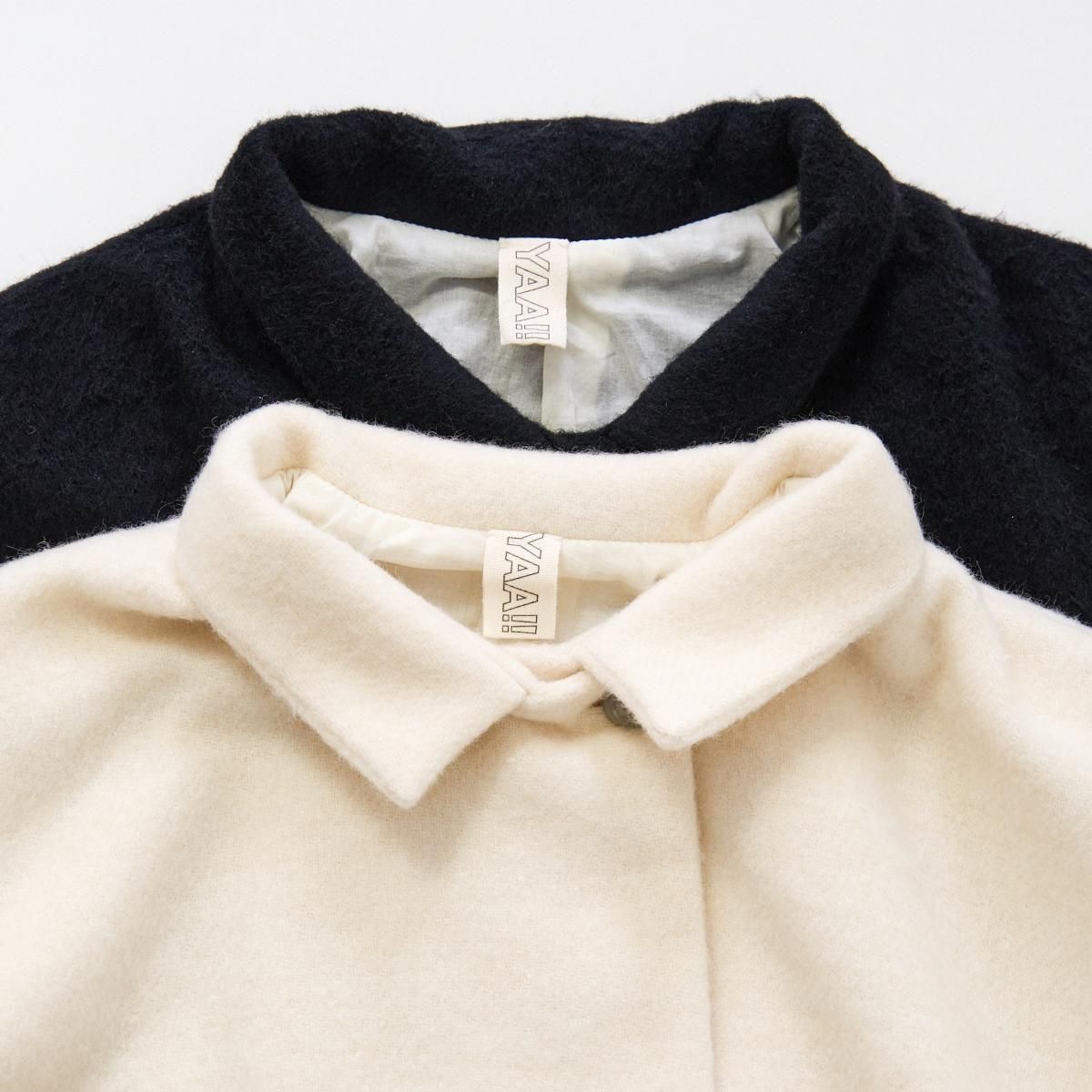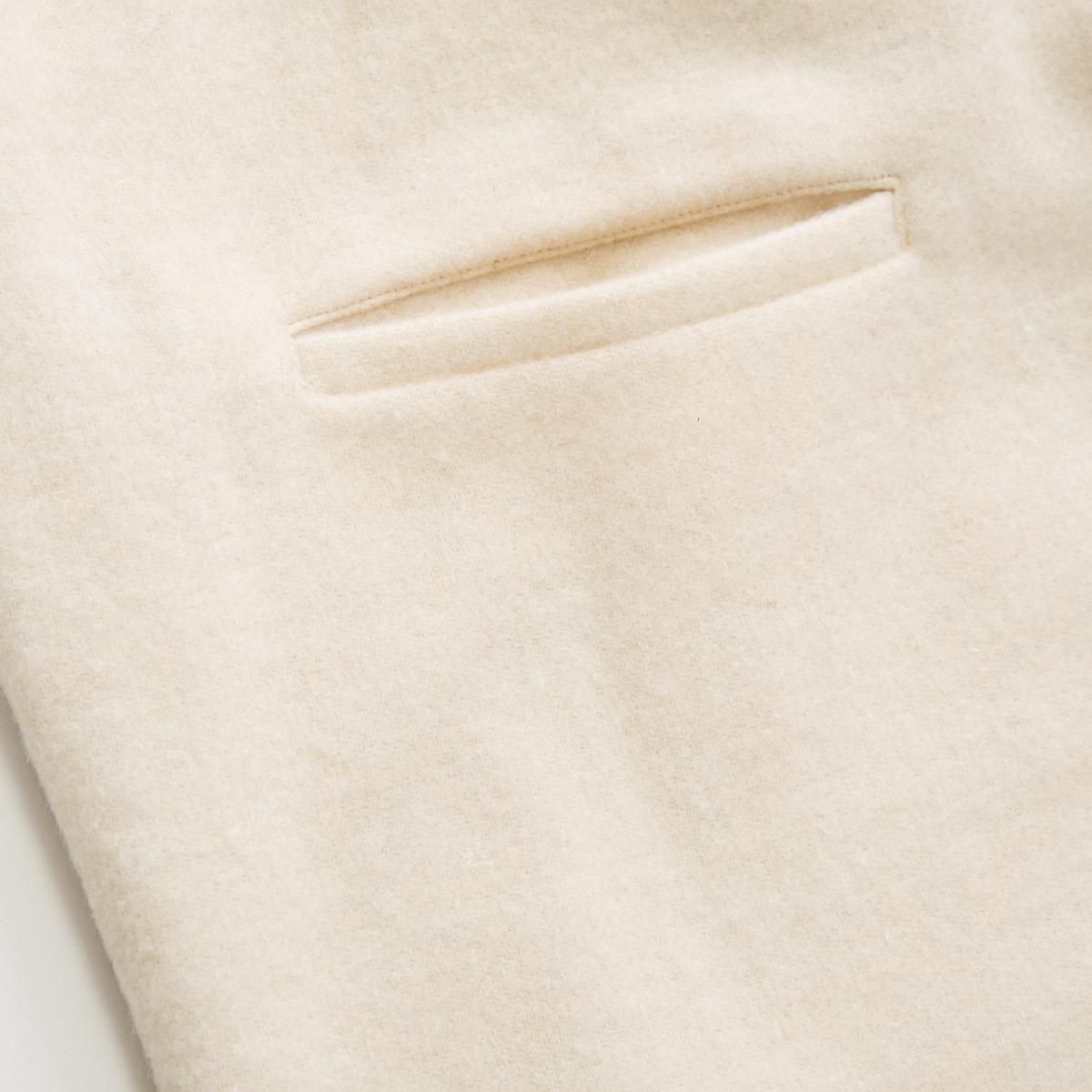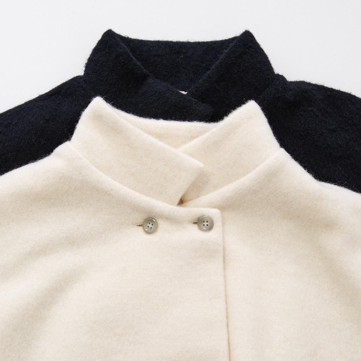 毛織物の産地である尾州で生産したビーバー生地を使用しており、起毛をかけることで柔らかさと膨らみのある生地に。ウールはsuper100という平均繊維直径18.5の細い糸を使用することで、しなやかな風合いが特徴です。