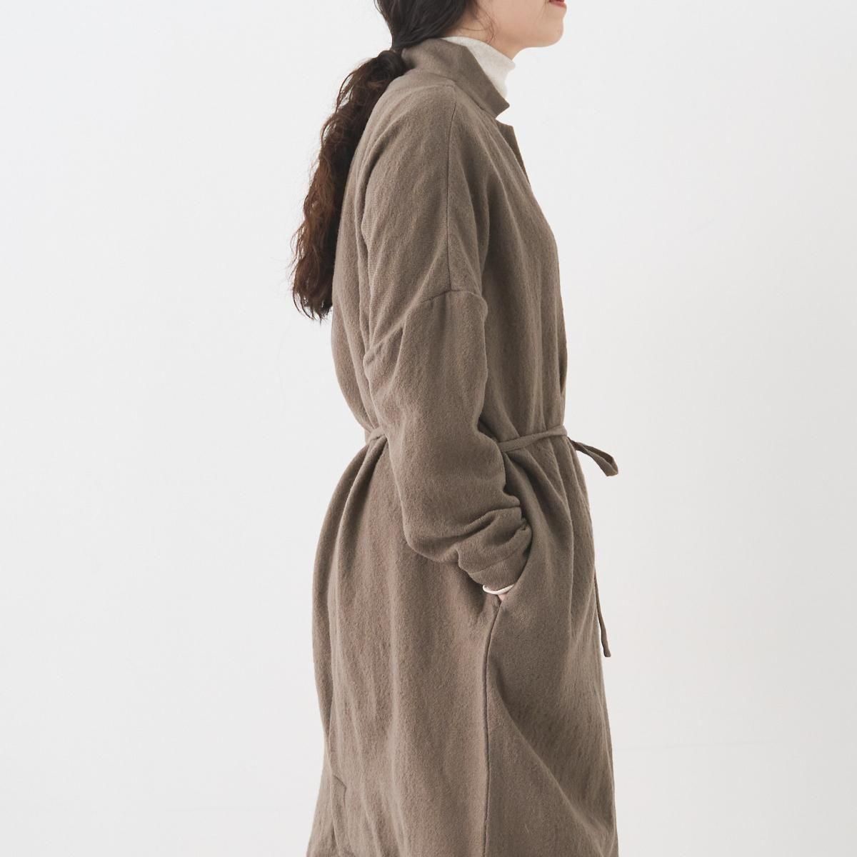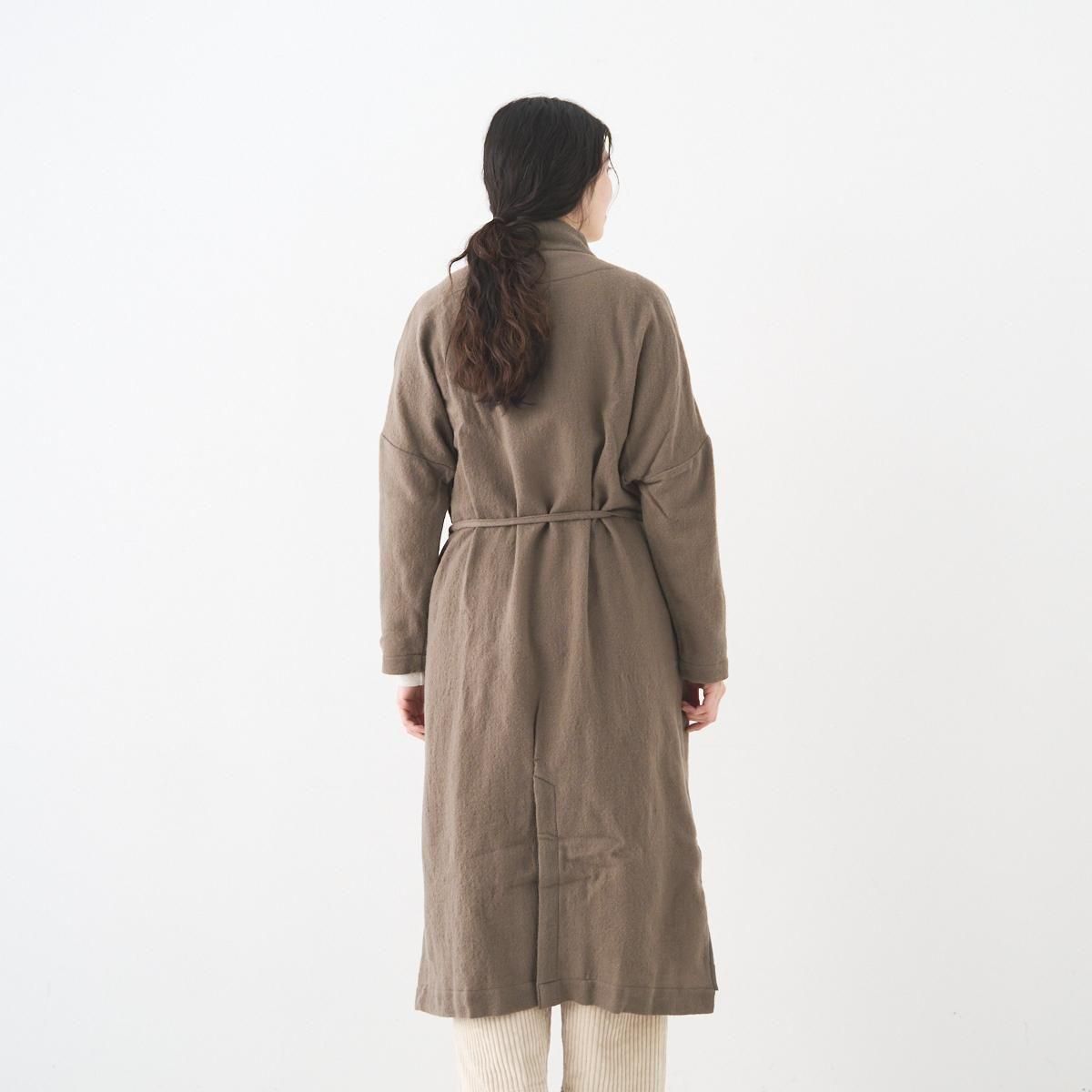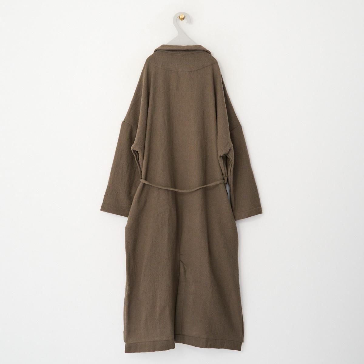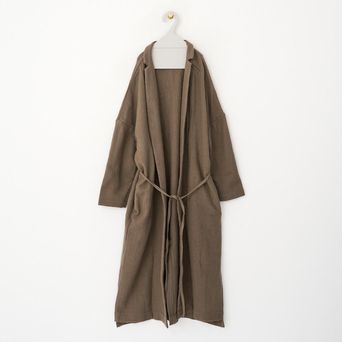 YAA!!定番のシャツコート。ウエストに細ヒモが1本付属しております。 薄手のウール素材を使用しているので、秋から春先まで活躍します。裏地のない一枚仕立てでとにかく軽いのでロングカーディガンのような気軽な羽織としてお使いいただけます。襟は立てていただくのも素敵です。紐でウエストをマークしてシルエットを変えてもお楽しみいただけます。 size:F 着丈114cm 肩幅75.5cm 身幅67cm 袖丈38cm color:beige brown material:ウール100% model:168cm お取扱い店舗・・・dieci kyutaro店2F ------------------------------------------------------- YAA!! 福岡の港町 TERCEIROの店主、浅岡陽子さんによる2011年にスタートしたオリジナルの洋服ライン。自分たちが今着たい服のイメージを膨らまし、生地を選び、すこしづつ制作されています。