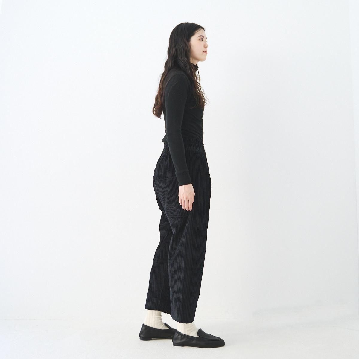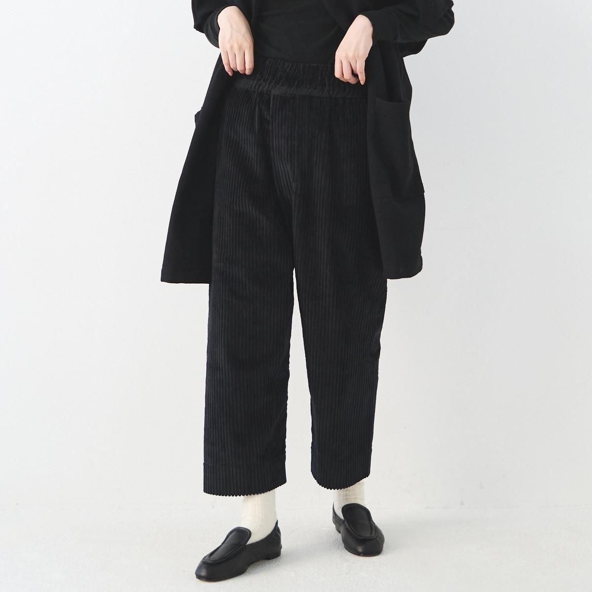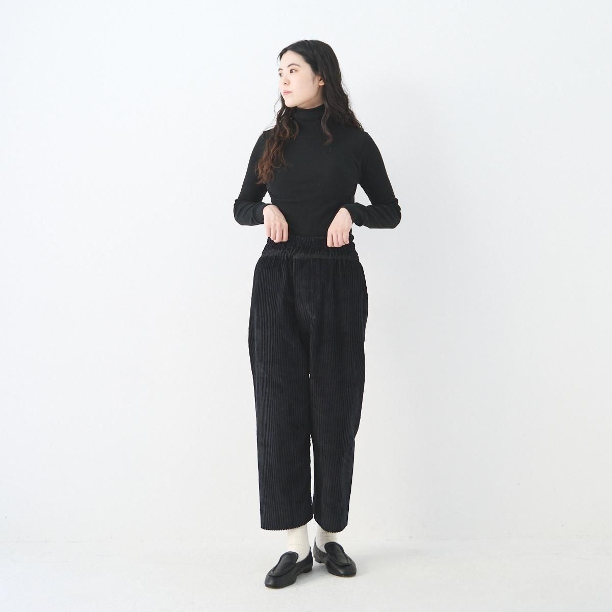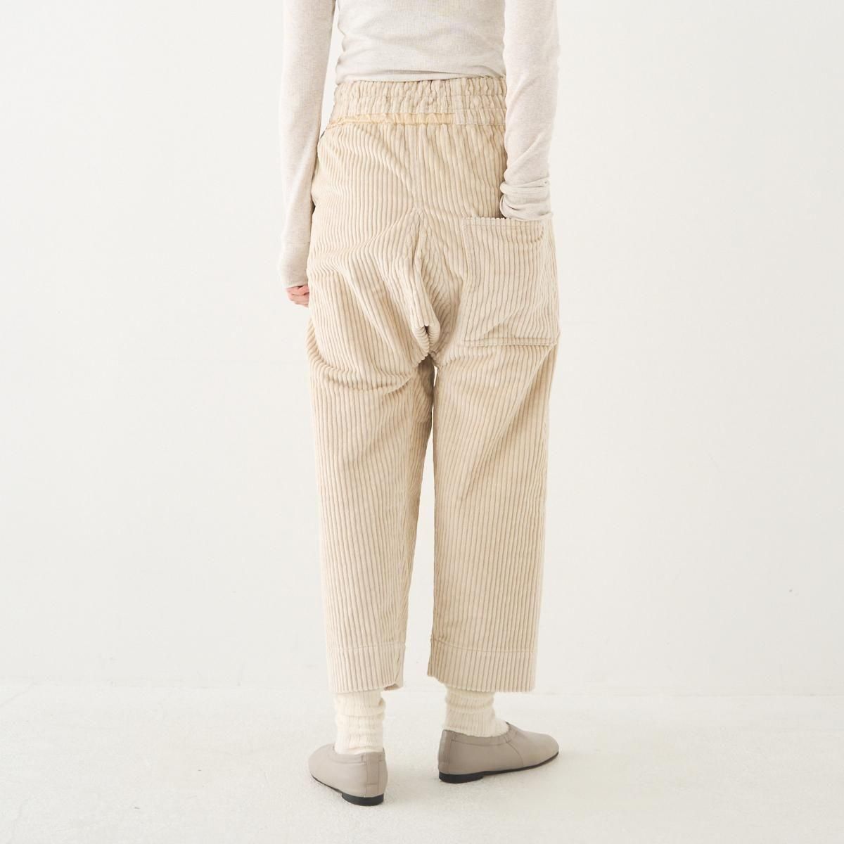 ラップパンツ風に前の生地が重なったYAA!!定番のパンツ。こちらはピッチが太めのコーデュロイ。今期の新作生地です。ふんわりとした優しい手触りでやわらかい雰囲気に。秋口から春先まで長くお召しいただけます。 股の部分は可動域が広がるよう、サルエルパンツのようにゆとりを持ったパターンになっています。後ろ姿など、見た目にも愛嬌のあるアクセントになっており、履いていただくと足のラインが綺麗に見えるシルエットです。 ウエスト部分は幅広めのゴム仕様で柔らかく着心地が良いのも特徴です。またウエストの位置を変化できるので、様々な丈感でお楽しみいただけます。 size:F ウエスト35~52cm/ウエストゴム幅7cm/わたりcm/股上42cm/股下47cm/わたり30cm ※サイズ計測の多少の誤差はご了承下さい。 color:アイボリー・ブラック material:cotton100% model:168cm お取り扱い店舗・・・dieci kyutaro店2F -------------------------------------------------------- YAA!! 福岡の港町 TERCEIROの店主、浅岡陽子さんによる2011年にスタートしたオリジナルの洋服ライン。自分たちが今着たい服のイメージを膨らまし、生地を選び、すこしづつ制作されています。 size_chart