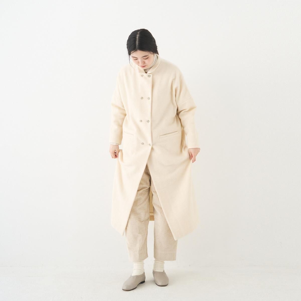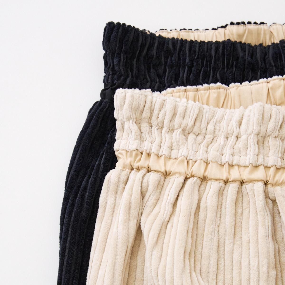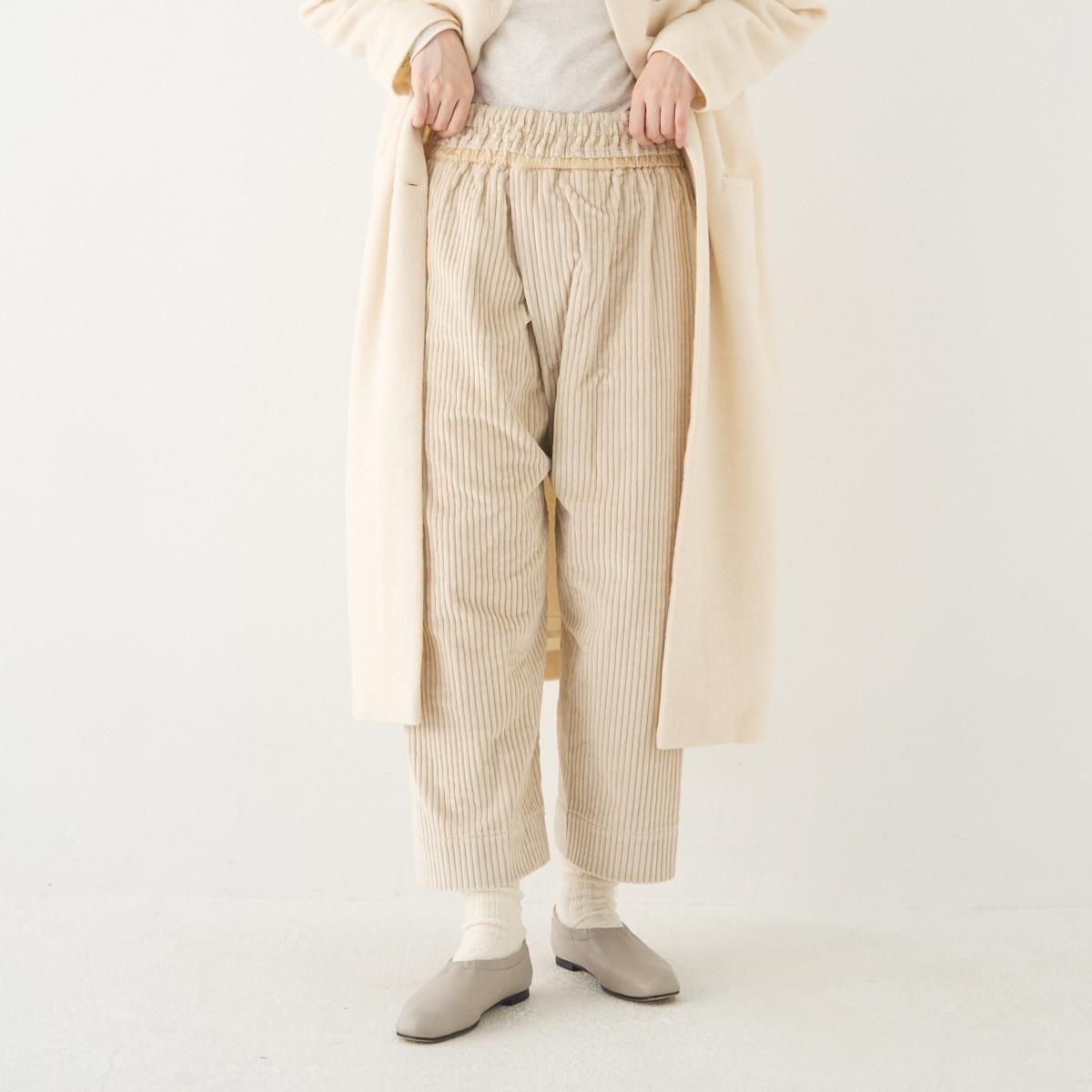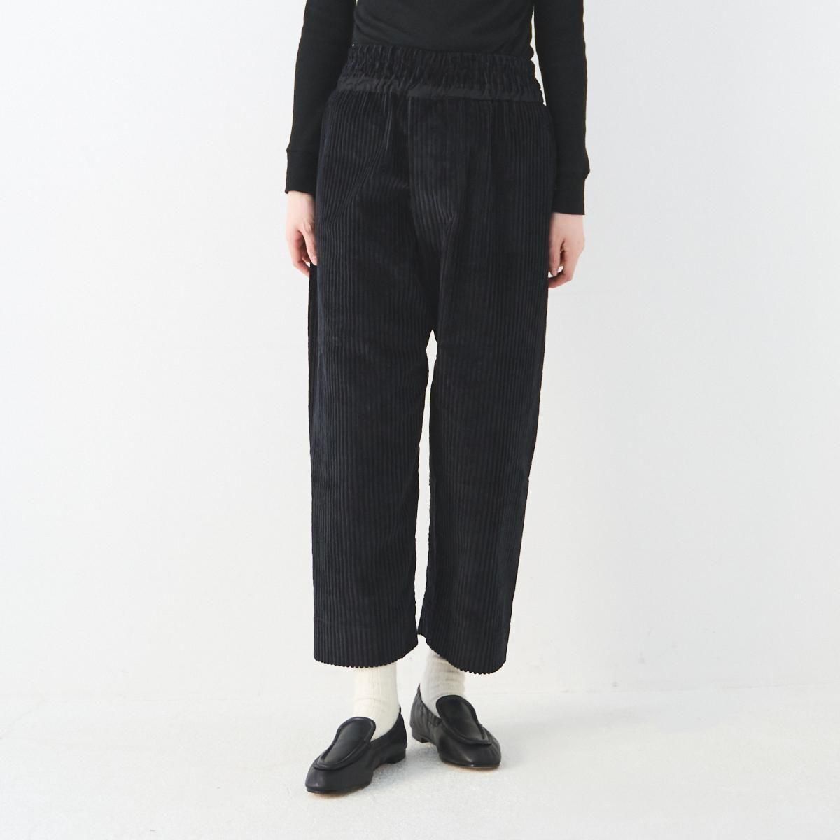 ラップパンツ風に前の生地が重なったYAA!!定番のパンツ。こちらはピッチが太めのコーデュロイ。今期の新作生地です。ふんわりとした優しい手触りでやわらかい雰囲気に。秋口から春先まで長くお召しいただけます。 股の部分は可動域が広がるよう、サルエルパンツのようにゆとりを持ったパターンになっています。後ろ姿など、見た目にも愛嬌のあるアクセントになっており、履いていただくと足のラインが綺麗に見えるシルエットです。 ウエスト部分は幅広めのゴム仕様で柔らかく着心地が良いのも特徴です。またウエストの位置を変化できるので、様々な丈感でお楽しみいただけます。 size:F ウエスト35~52cm/ウエストゴム幅7cm/わたりcm/股上42cm/股下47cm/わたり30cm ※サイズ計測の多少の誤差はご了承下さい。 color:アイボリー・ブラック material:cotton100% model:168cm お取り扱い店舗・・・dieci kyutaro店2F -------------------------------------------------------- YAA!! 福岡の港町 TERCEIROの店主、浅岡陽子さんによる2011年にスタートしたオリジナルの洋服ライン。自分たちが今着たい服のイメージを膨らまし、生地を選び、すこしづつ制作されています。 size_chart